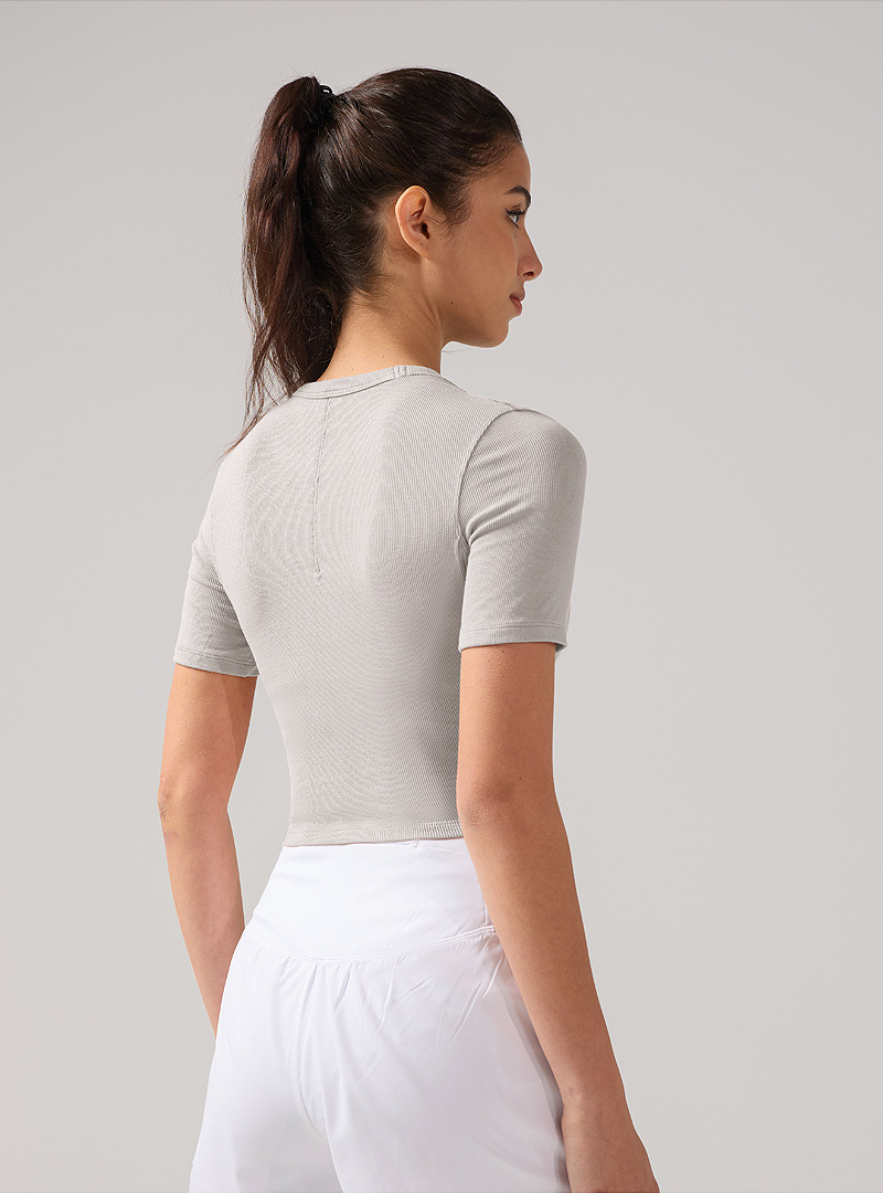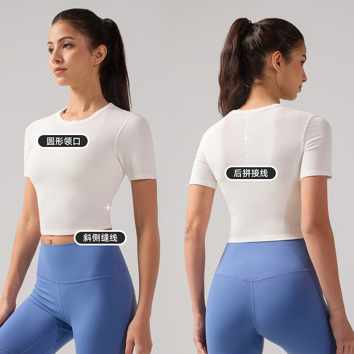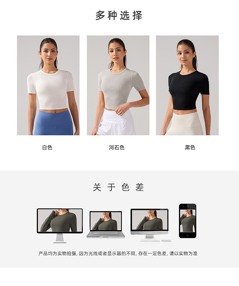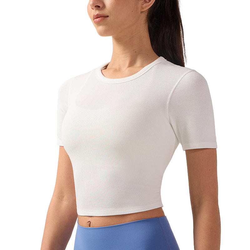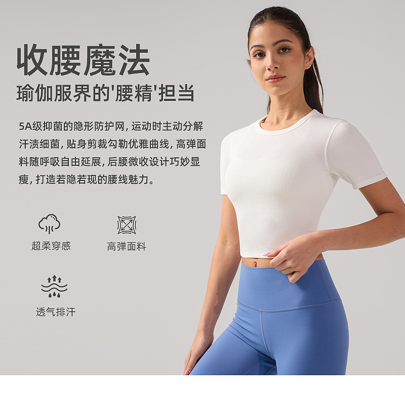 夏季圆领短袖T恤女露脐修身显瘦罗纹瑜伽服抗菌透气速干运动上衣
