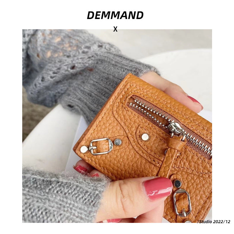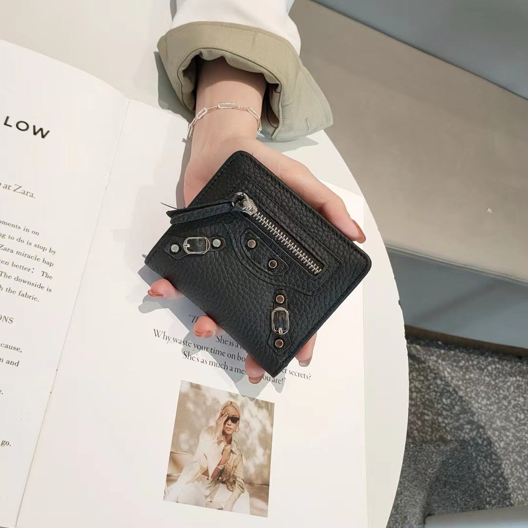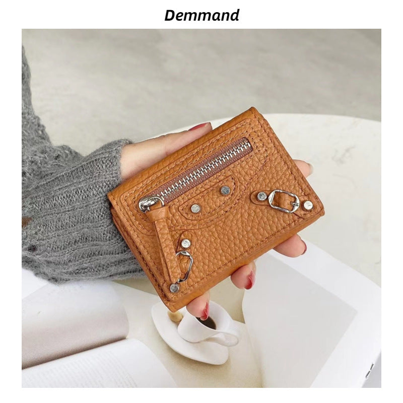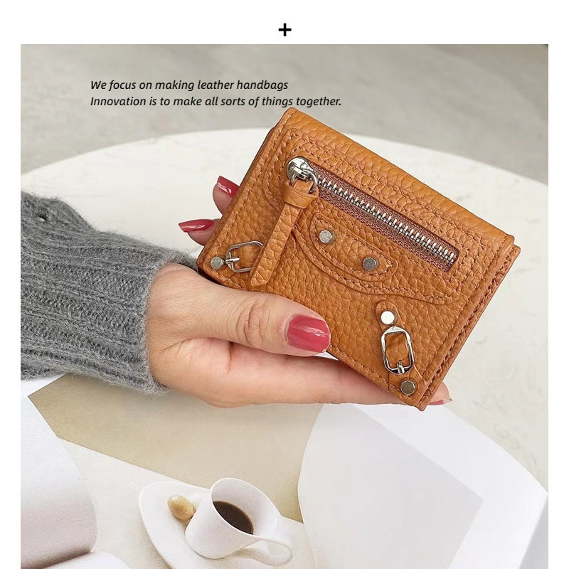 头层牛皮机车三折钱包女士小众风韩版短款钱夹大容量零钱一体卡包