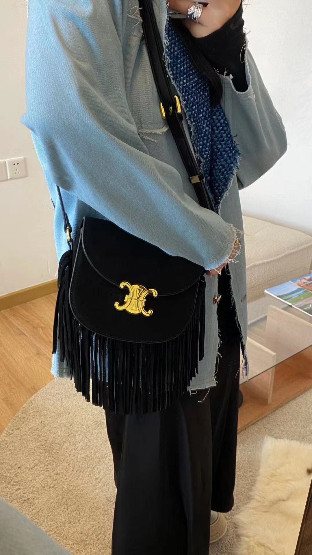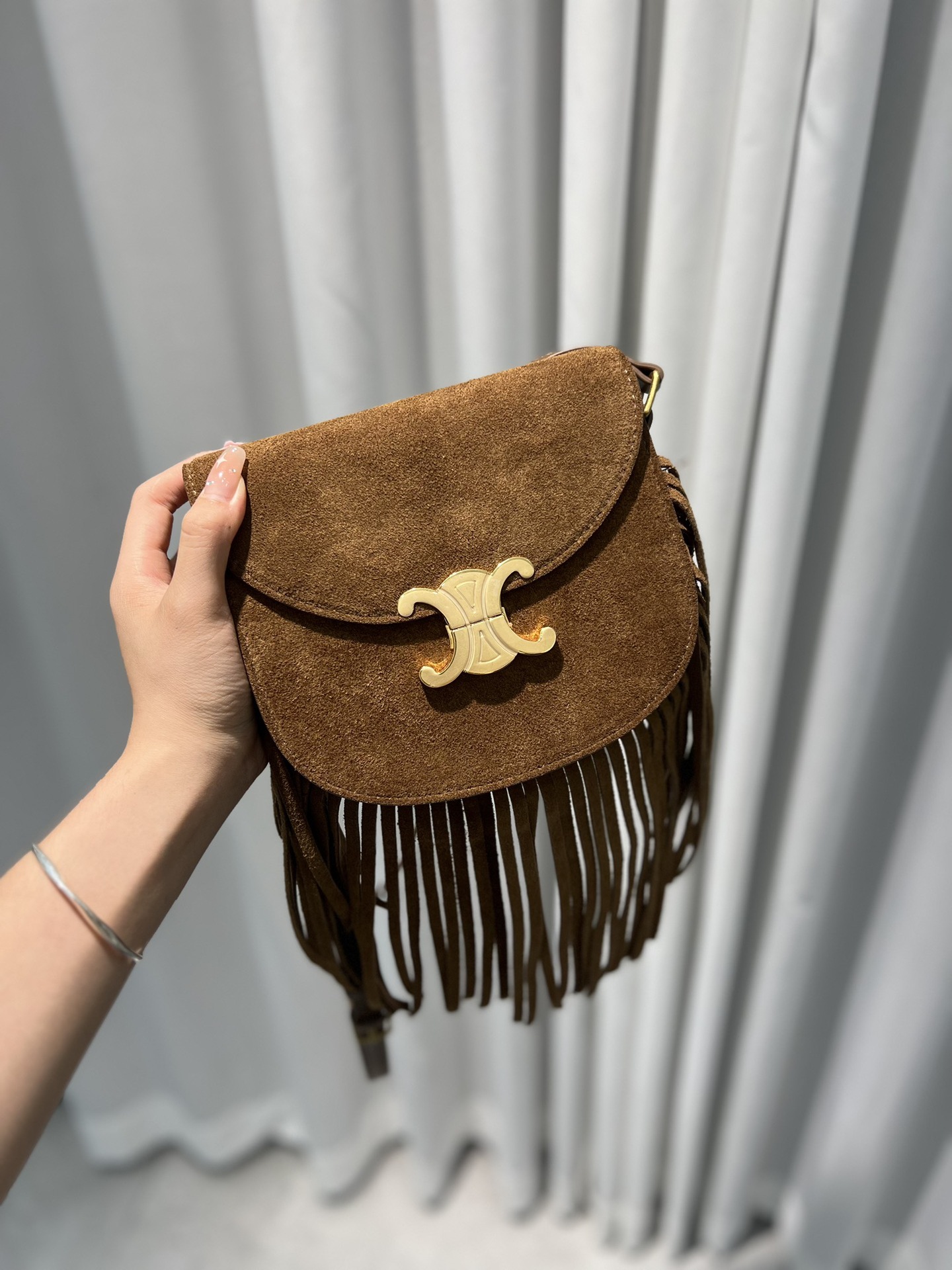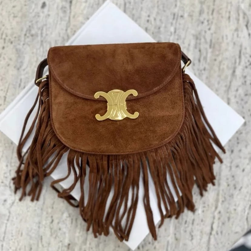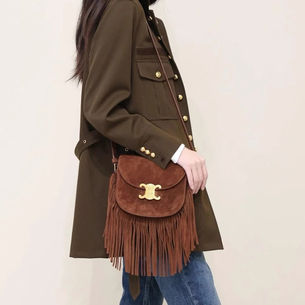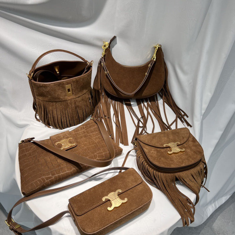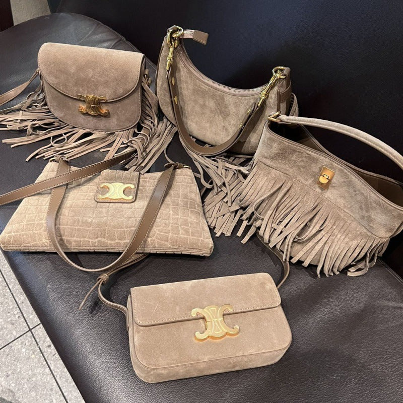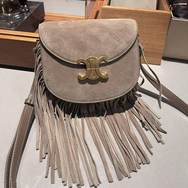 小众设计凯旋门流苏马鞍包2023新款美拉德复古麂皮绒链条斜跨小包