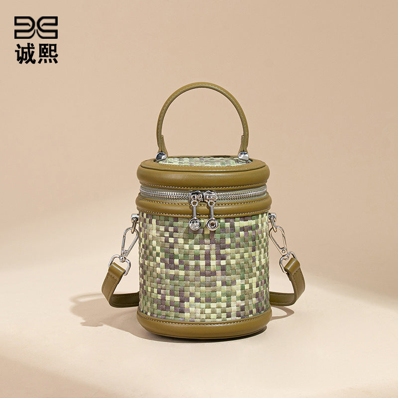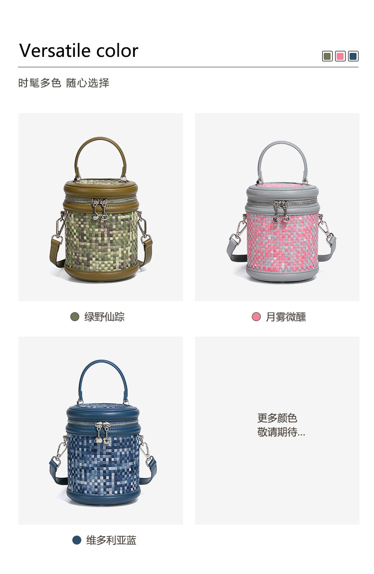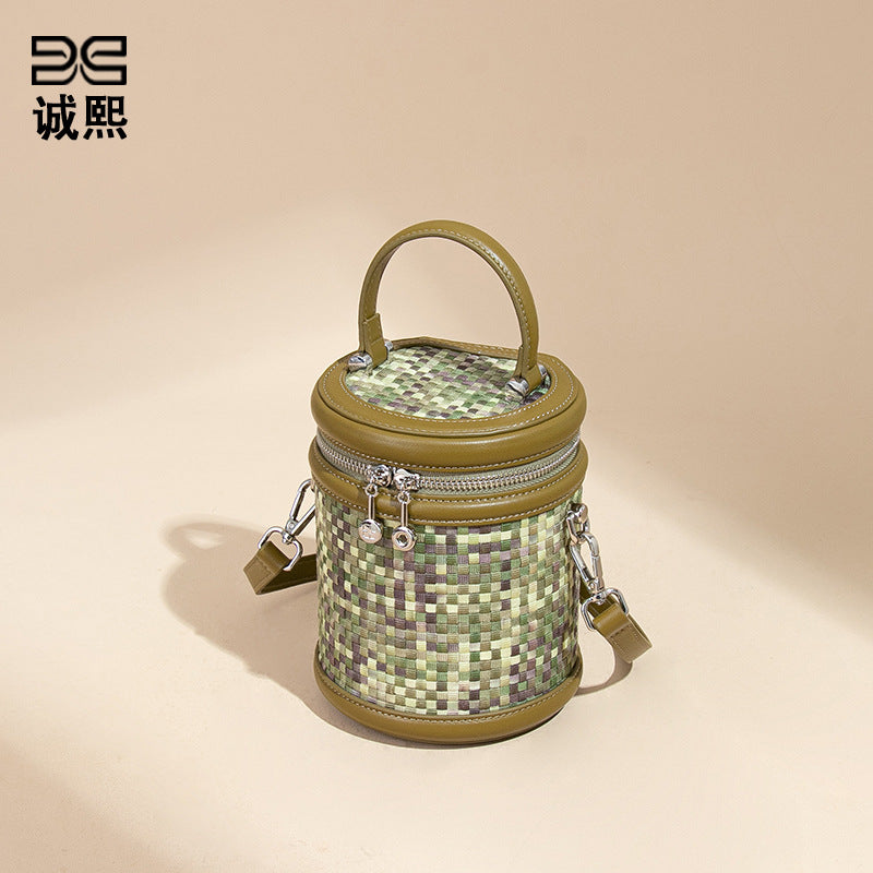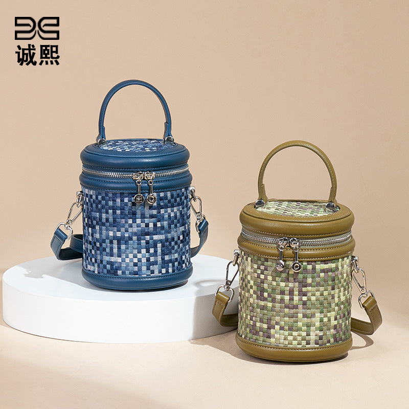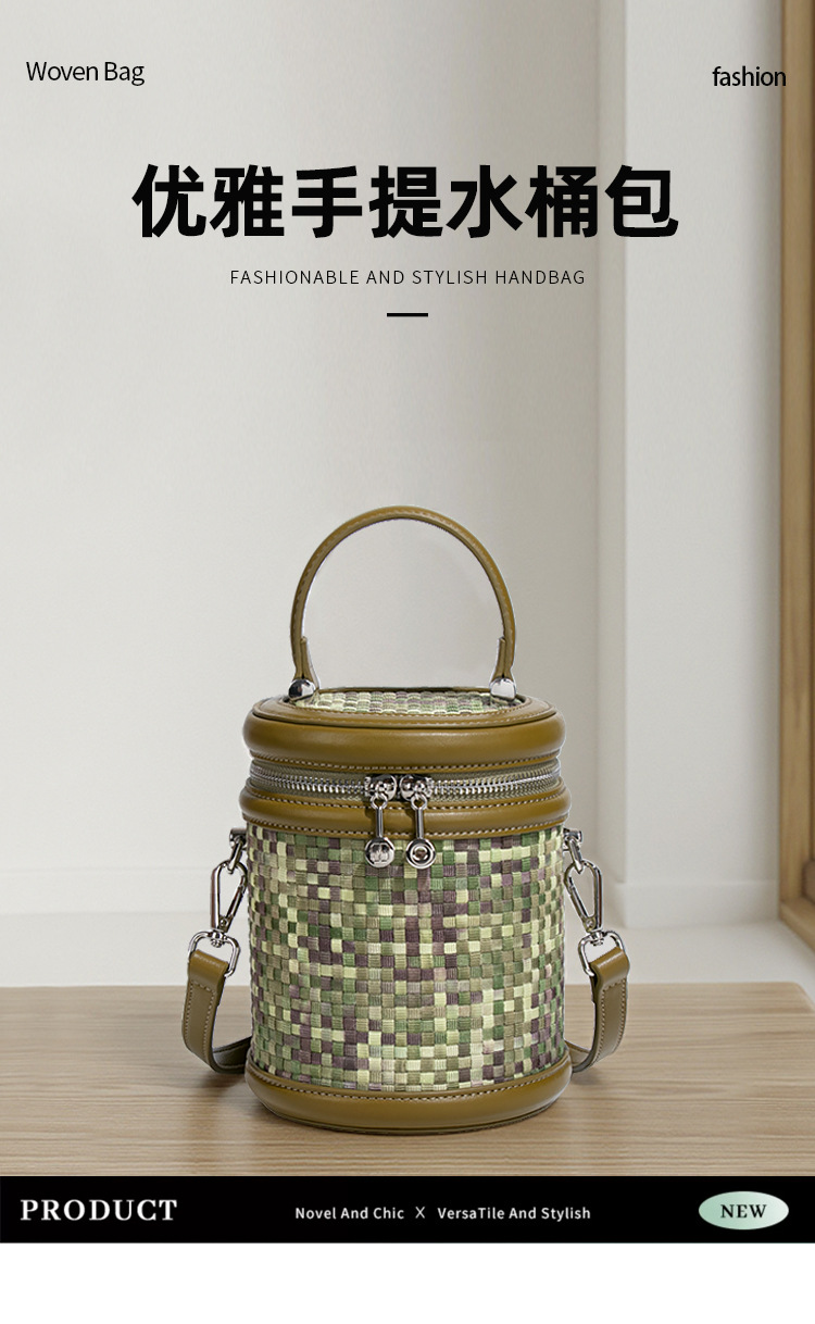 手提水桶包包女撞色新品潮流编织包单肩斜跨化妆包小众百搭圆筒包