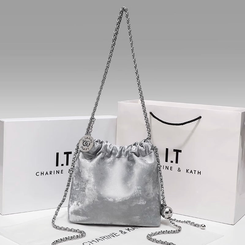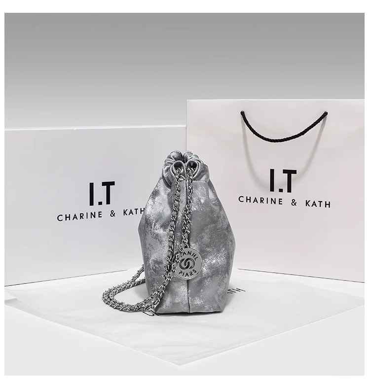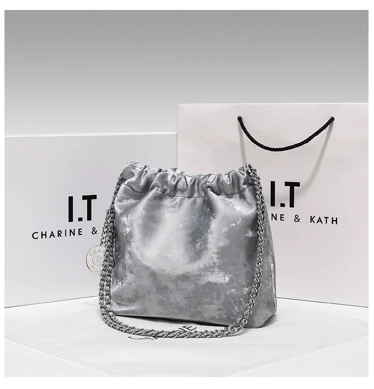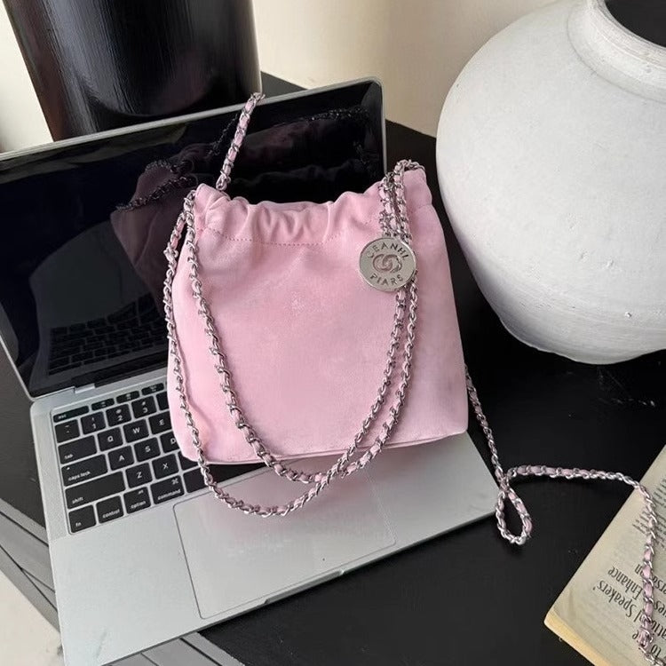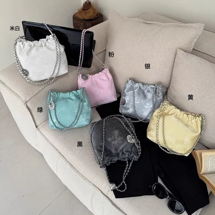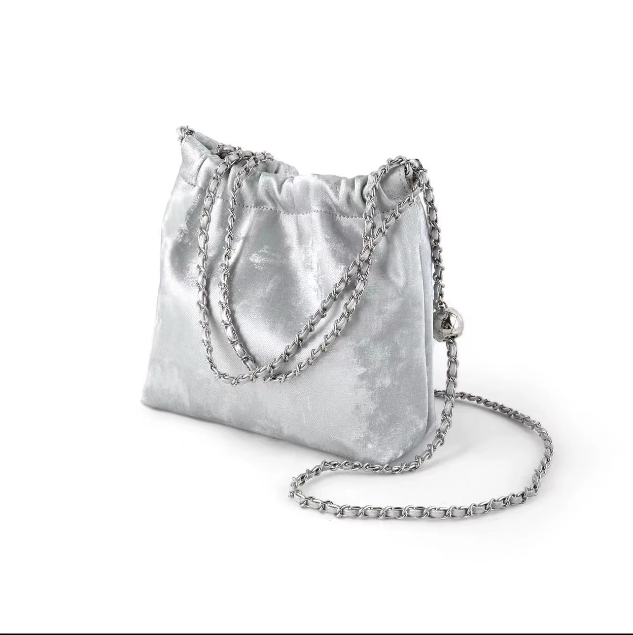 新中式绸牛皮垃圾袋链条包包女包2024新款大容量单肩包斜跨水桶包
