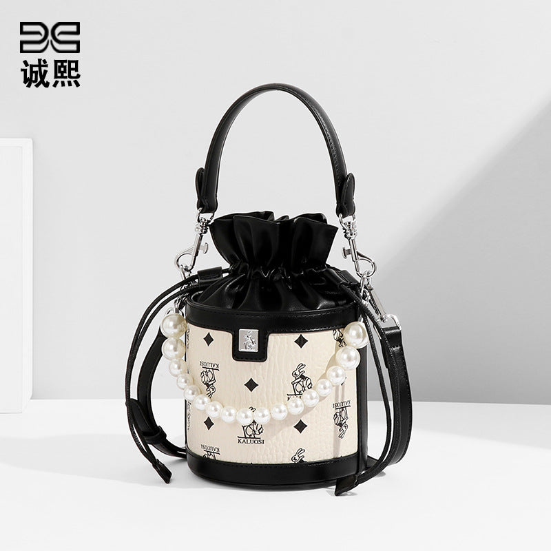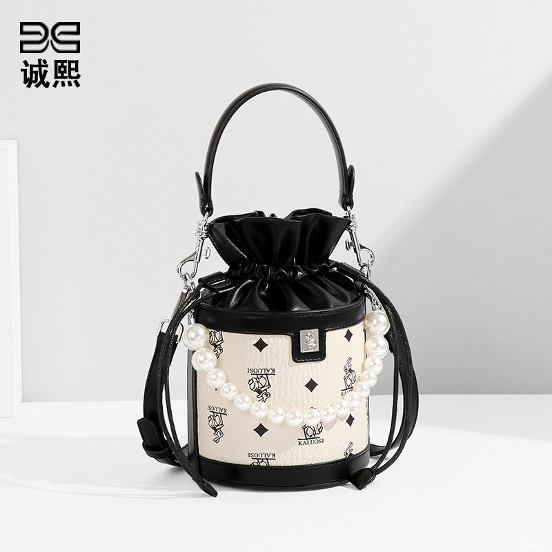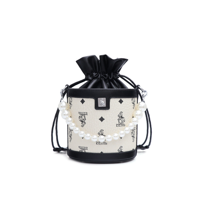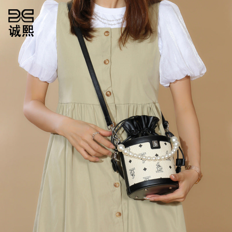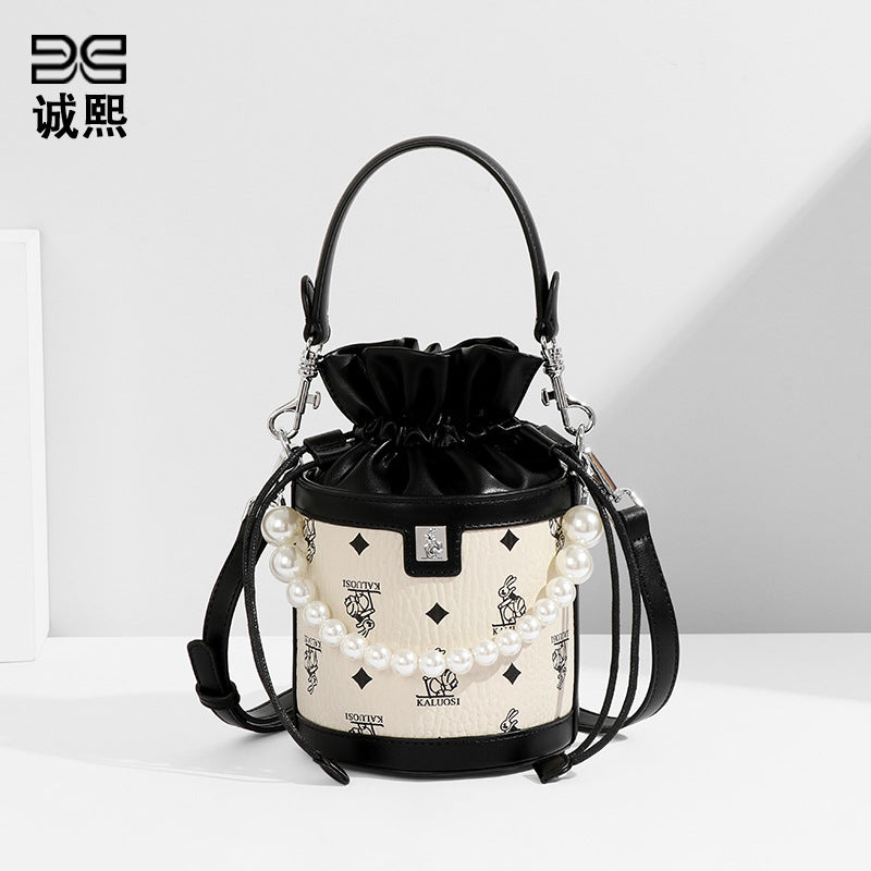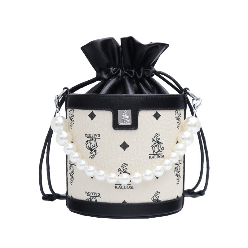 时尚印花新款兔子发财水桶包潮流珍珠手提圆筒包潮流单肩斜挎女包
