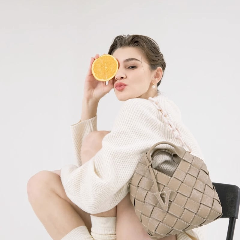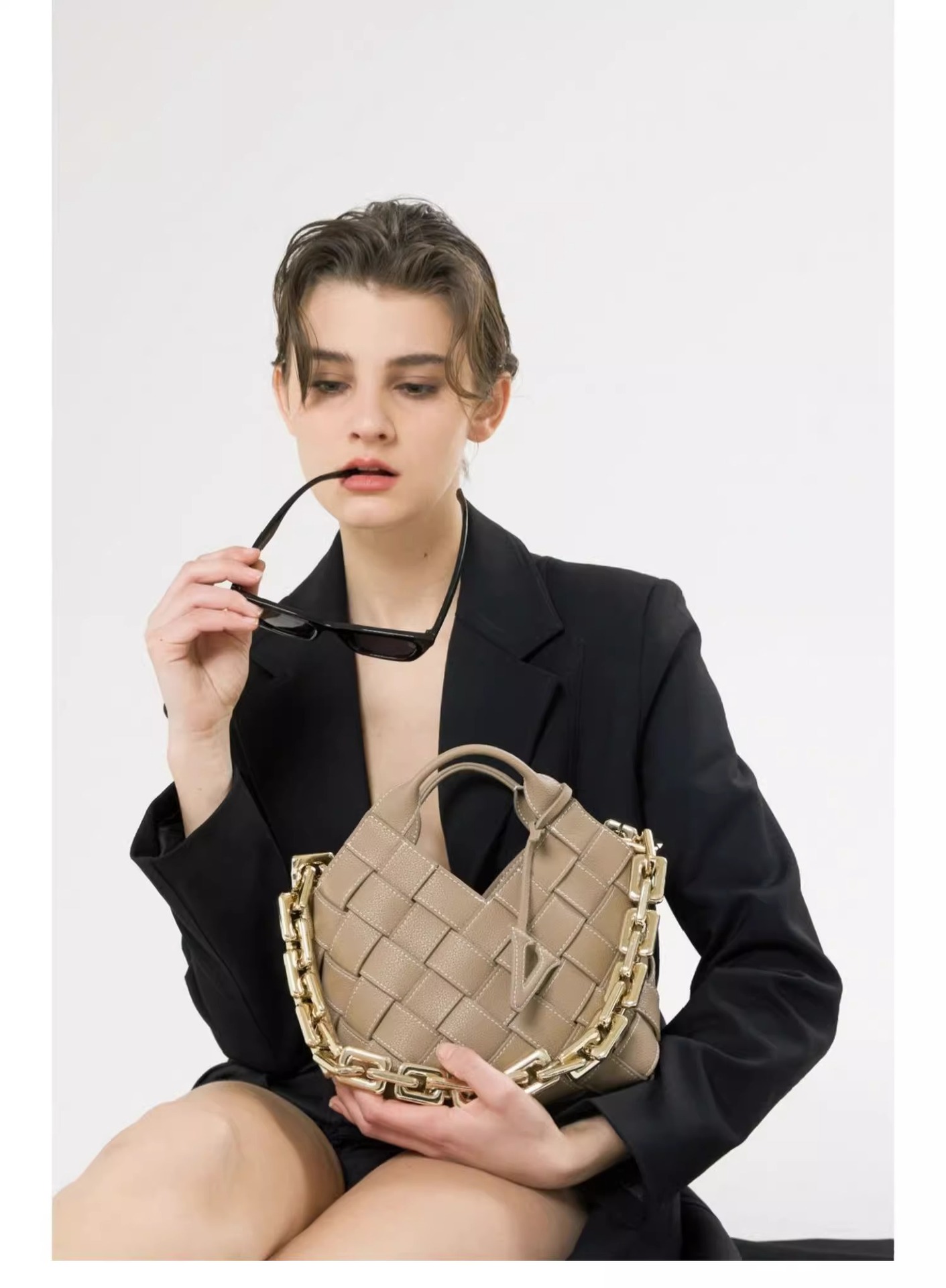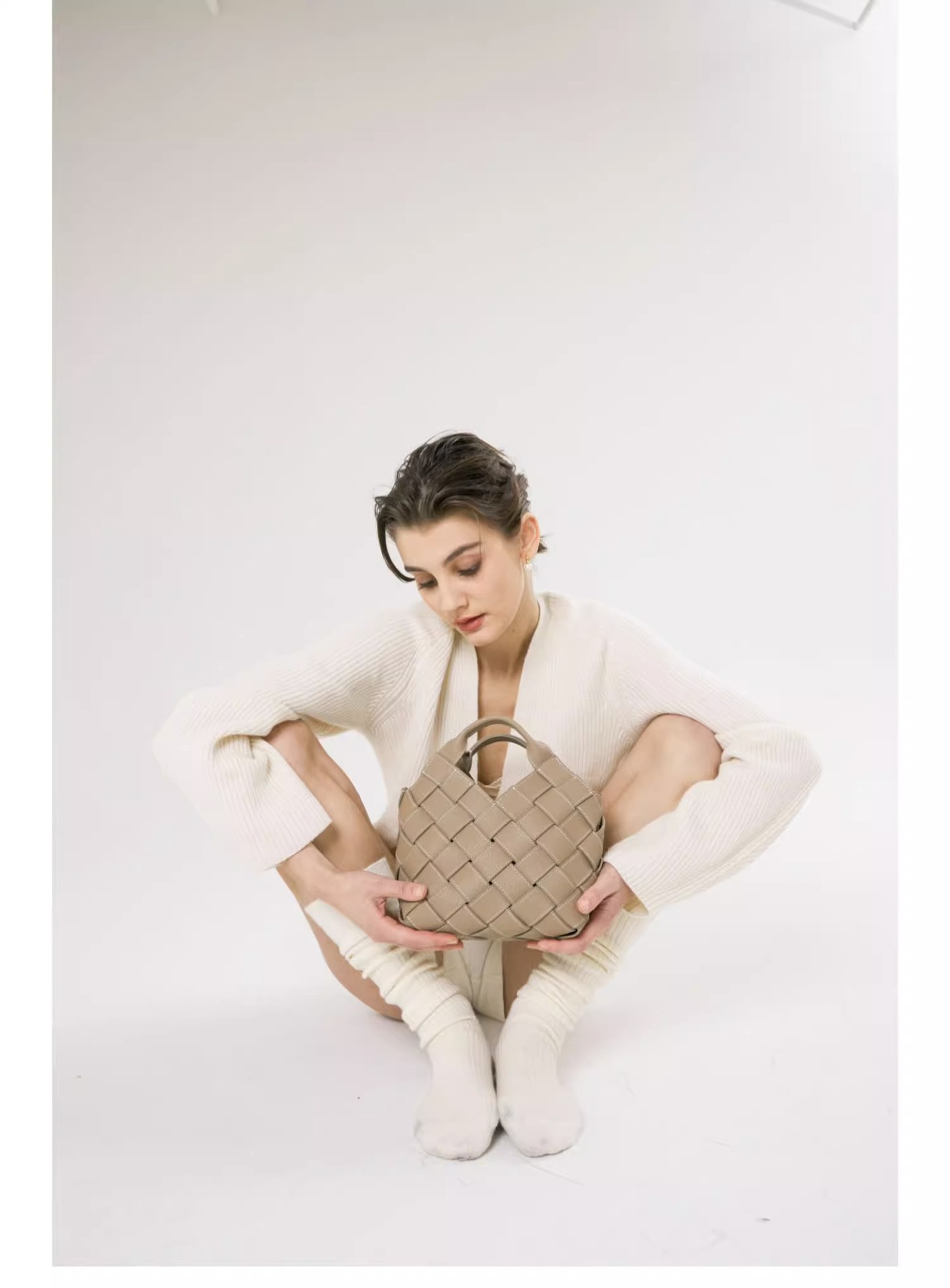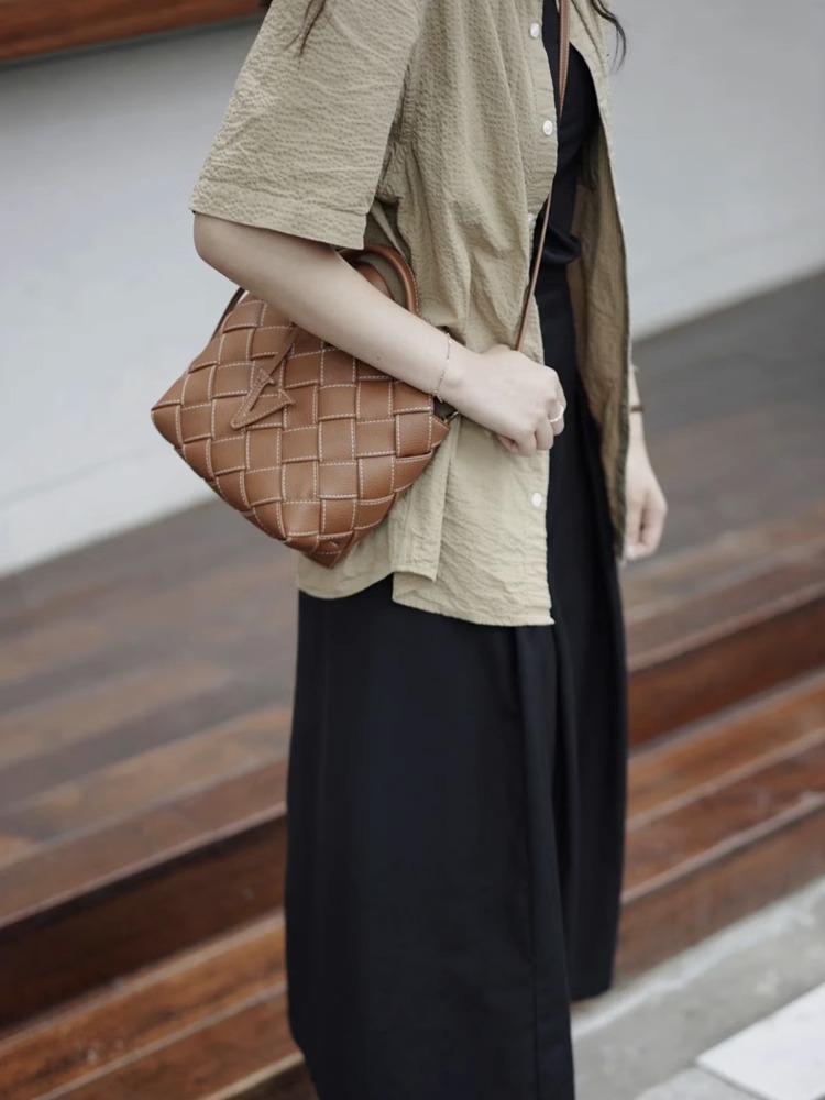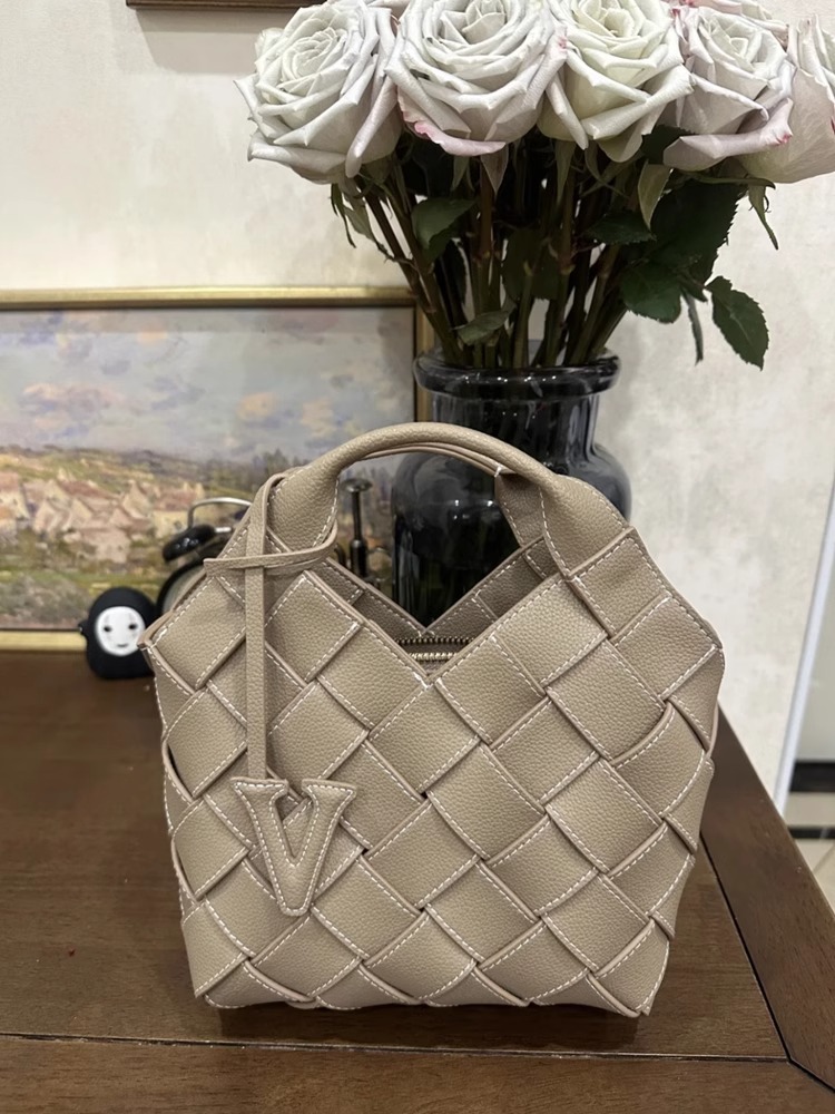欧美时尚 轻奢高级质感牛皮菜篮子编织包单肩手提包女一件代发