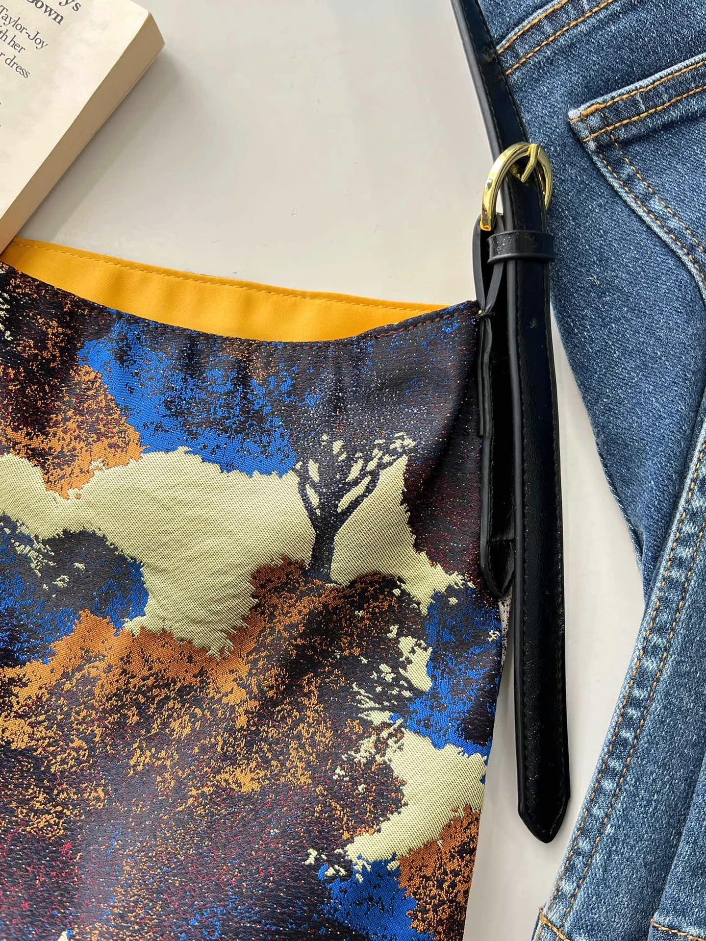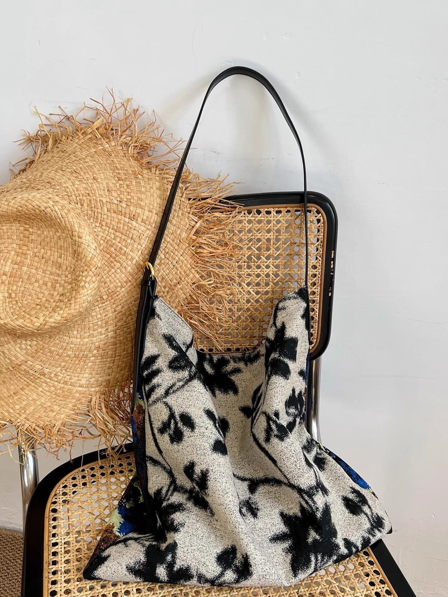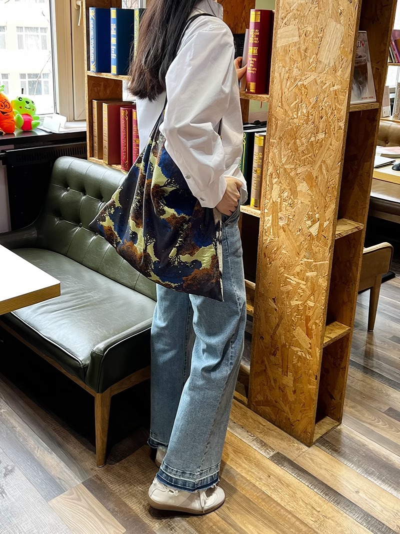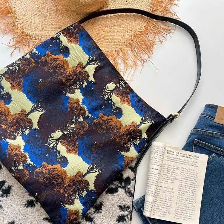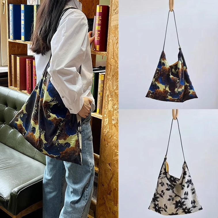法式松弛感~复古时髦神秘森林油画印花双面单肩休闲背包托特女包