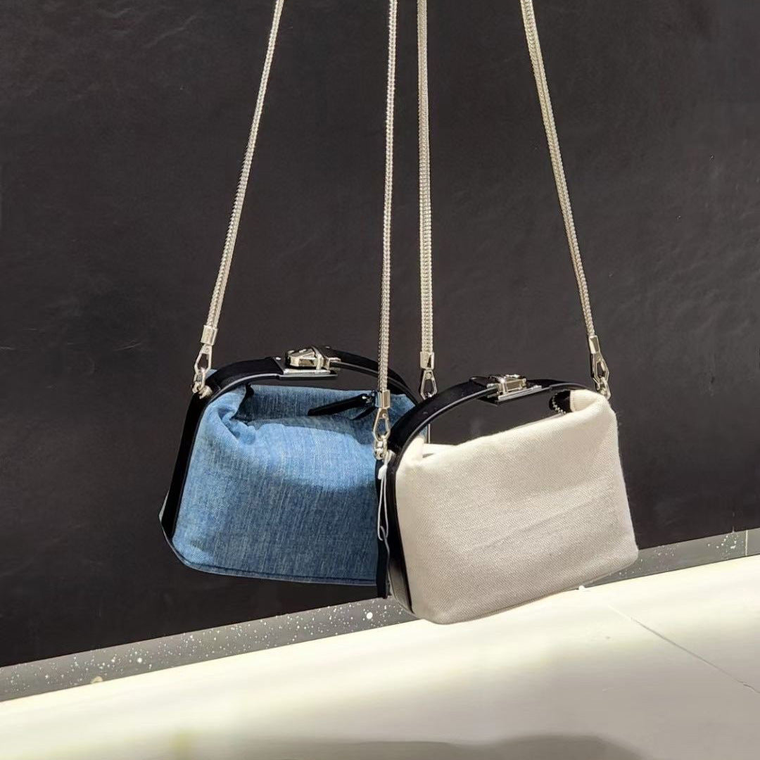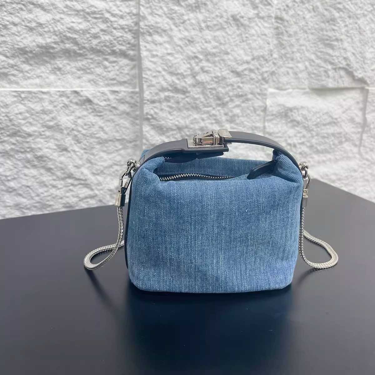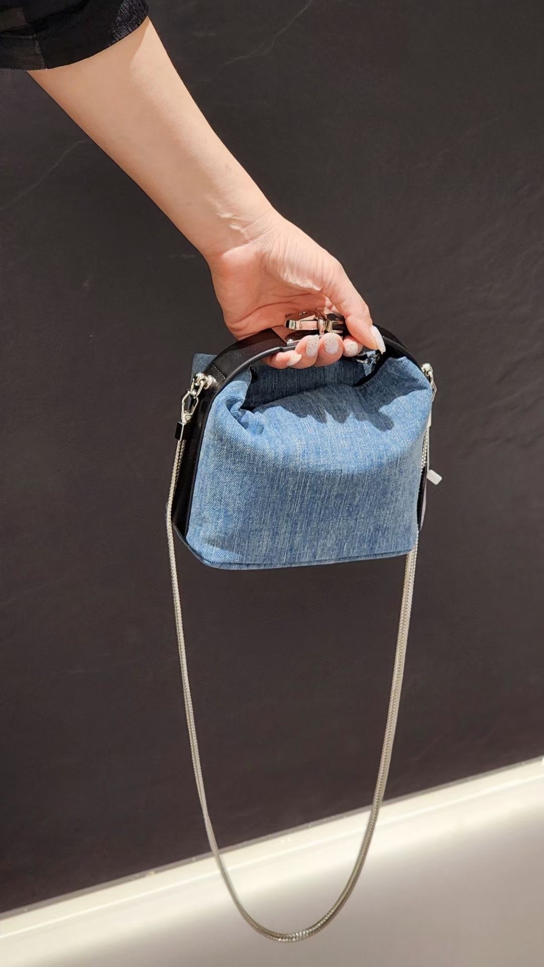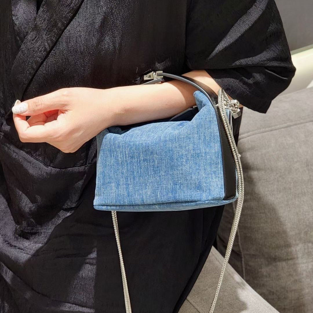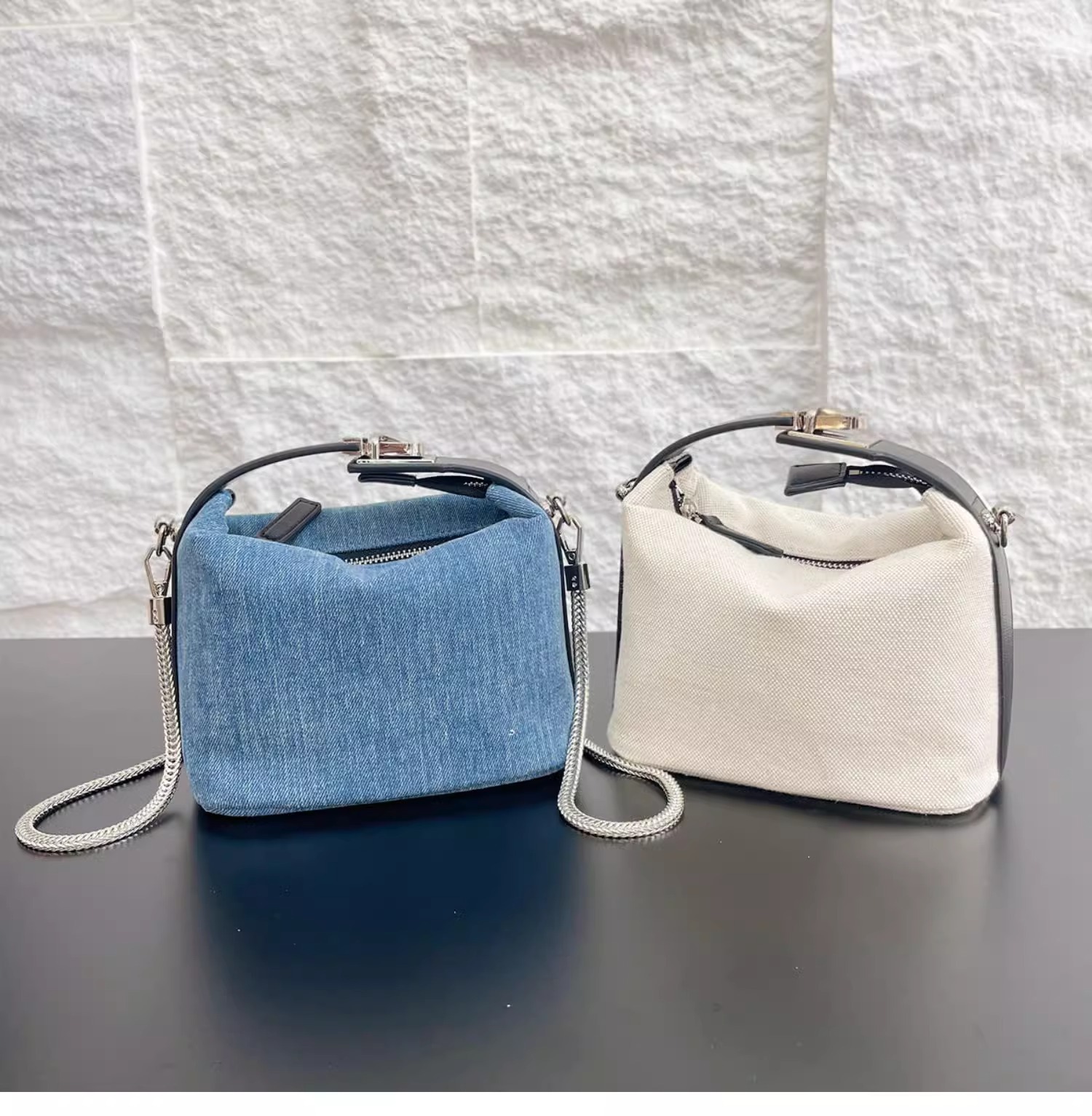 牛皮拼接牛仔布帆布手提饭盒包链条饺子包时尚百搭单肩斜挎小包女