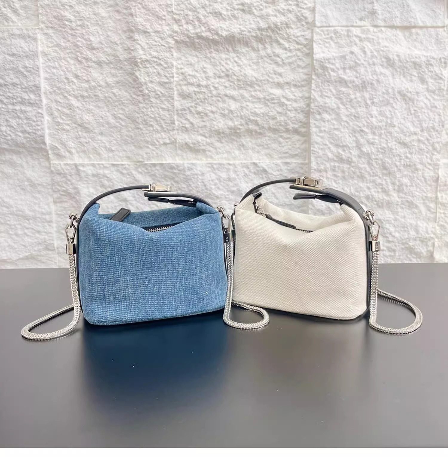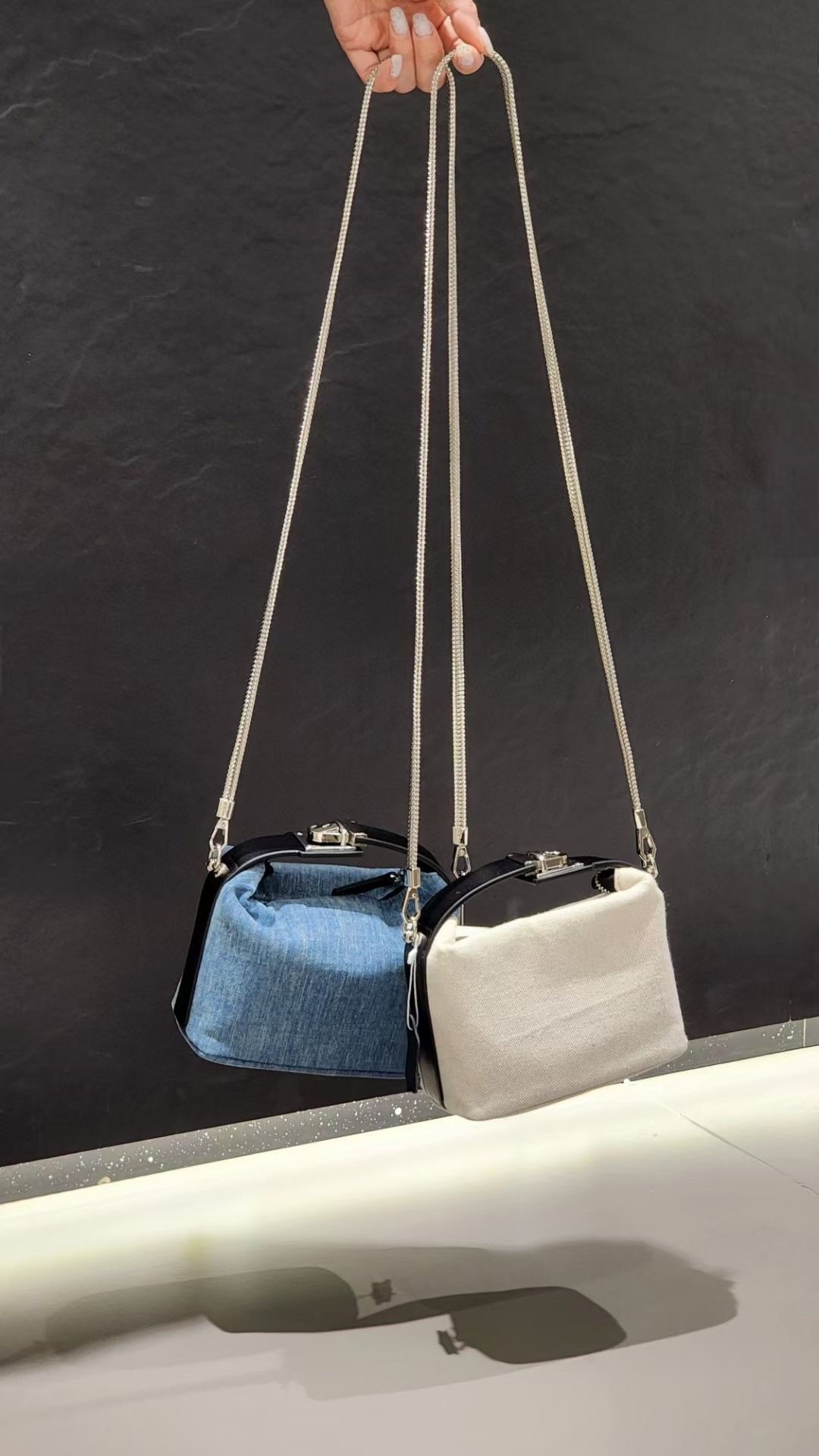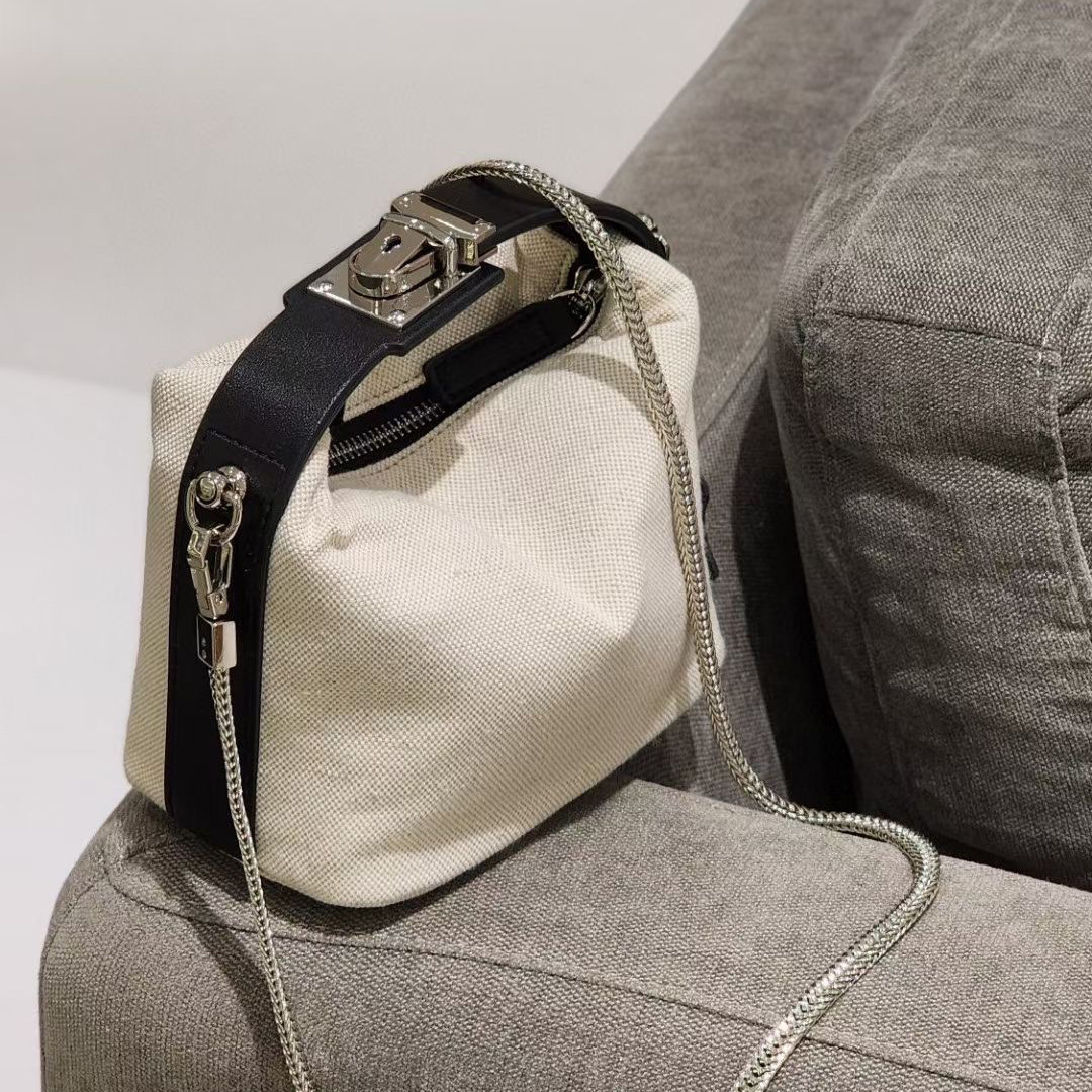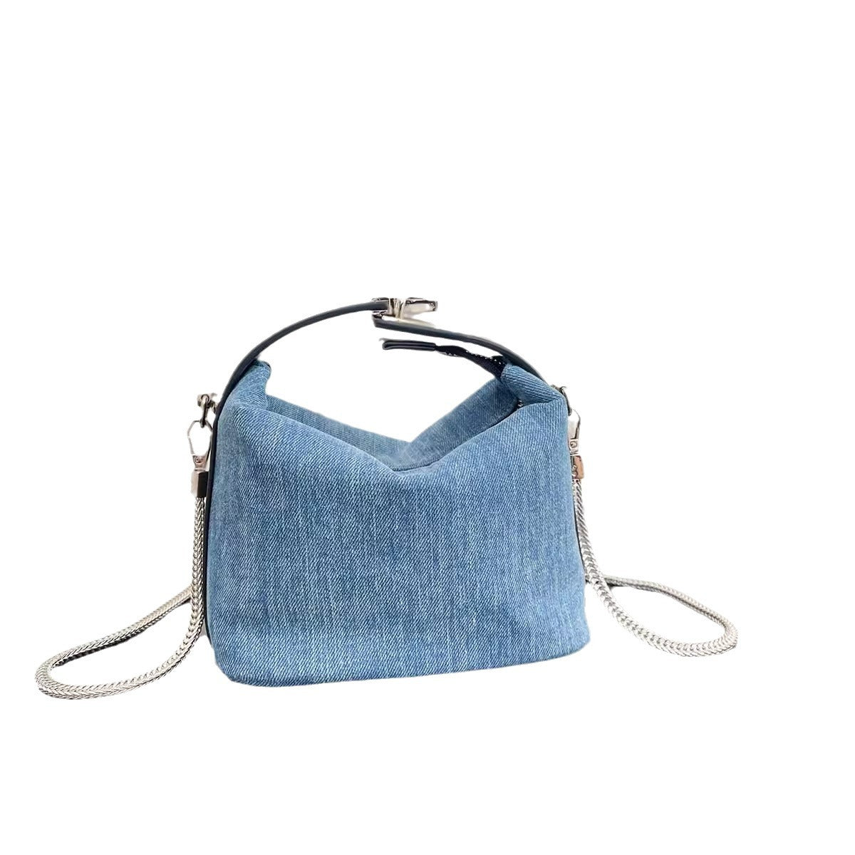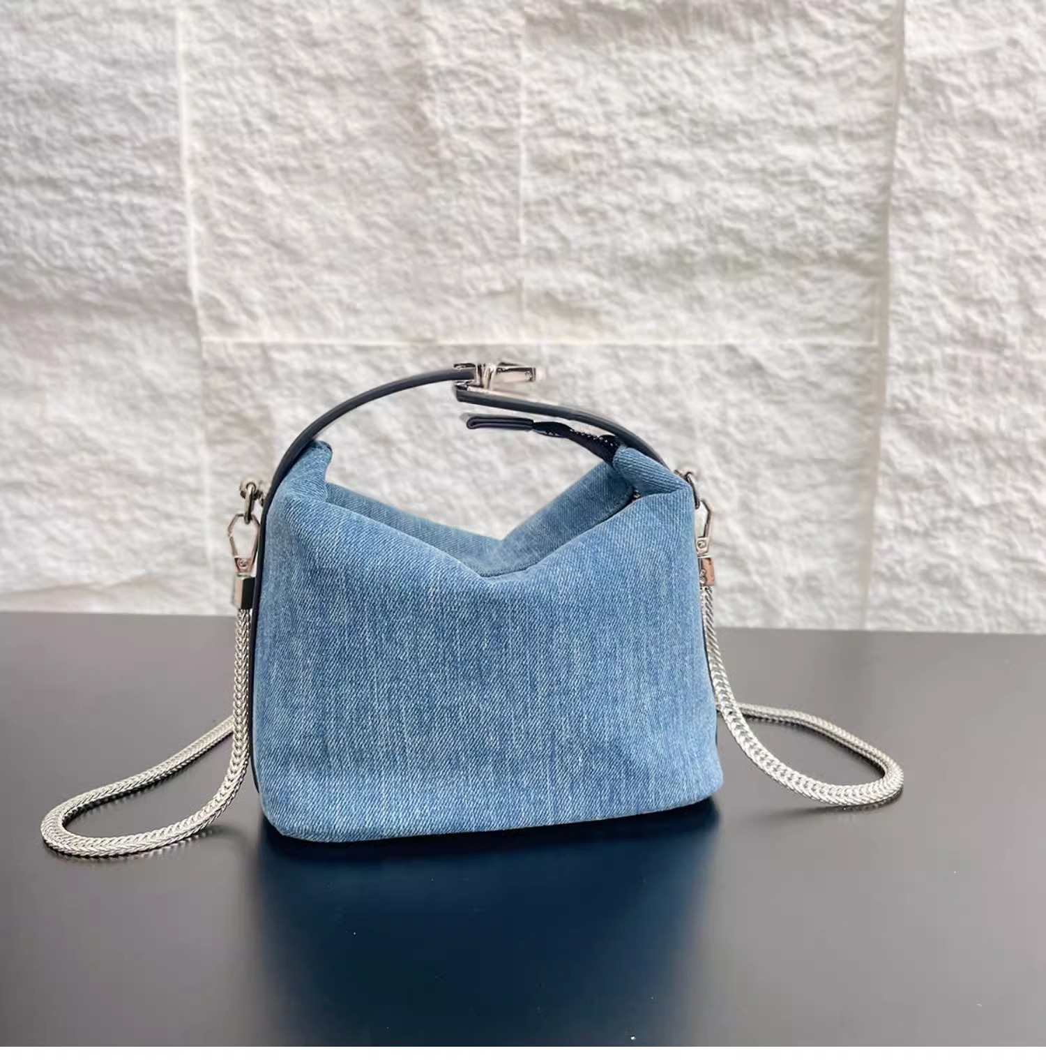 牛皮拼接牛仔布帆布手提饭盒包链条饺子包时尚百搭单肩斜挎小包女