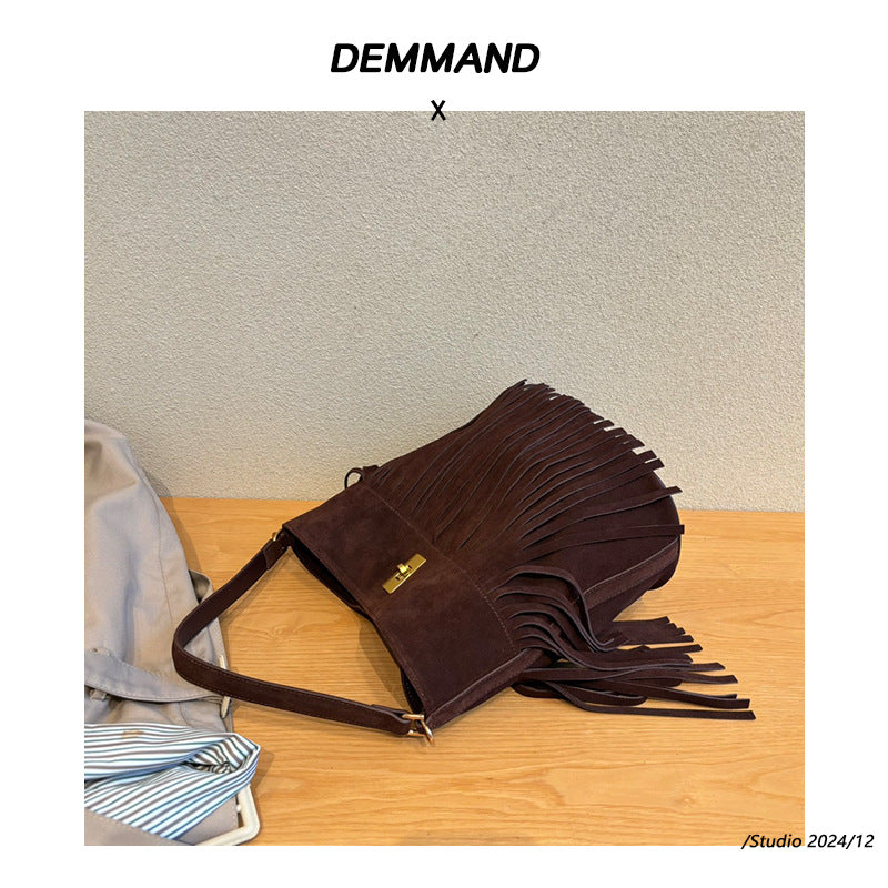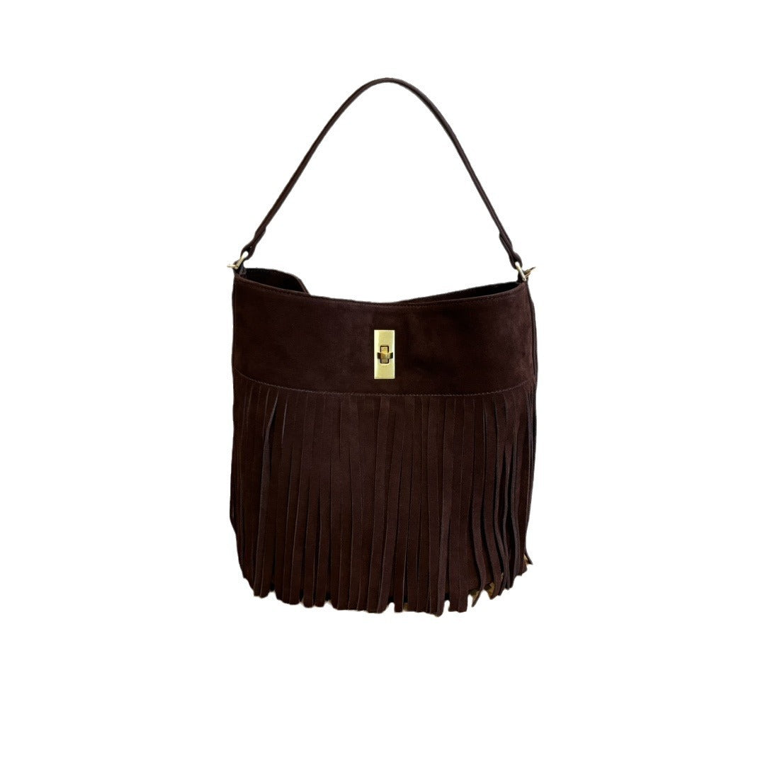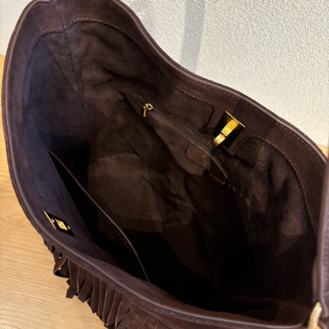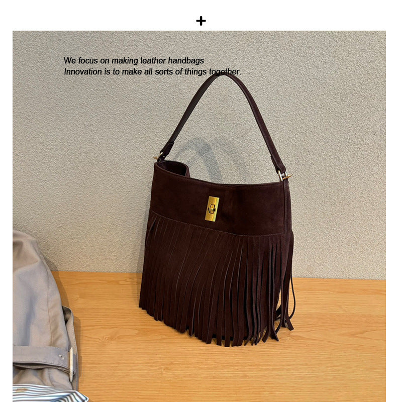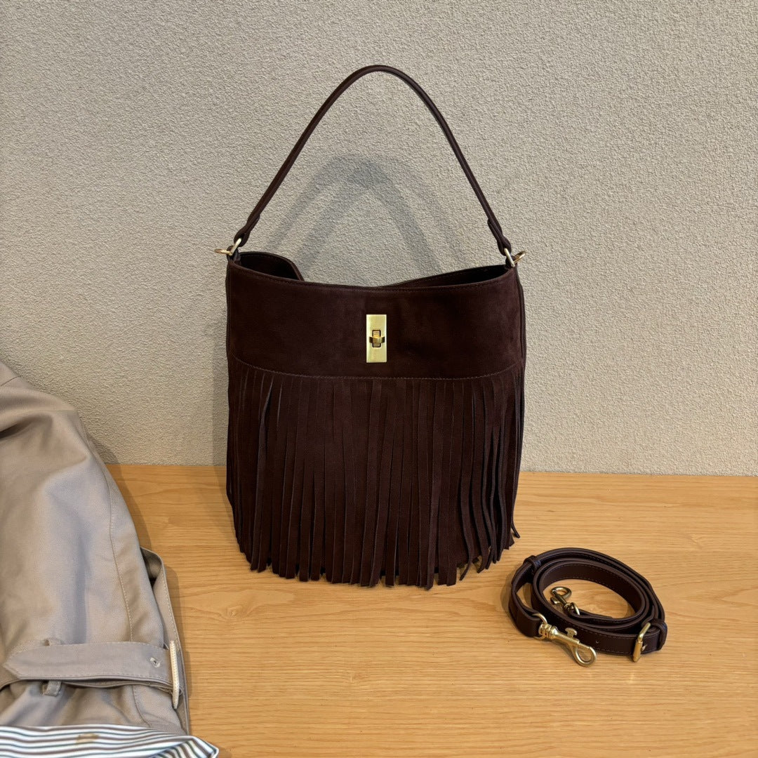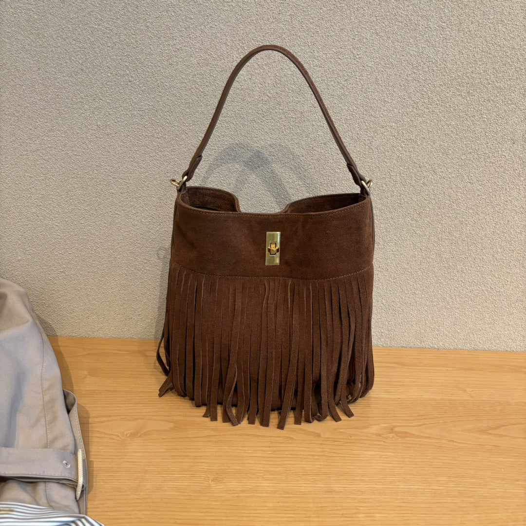 秋冬季复古麂皮绒面包包女2024新款百搭斜挎包流苏磨砂单肩水桶包