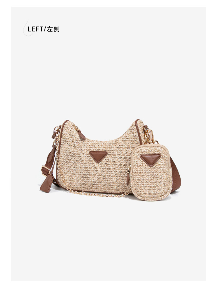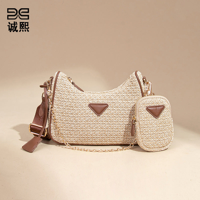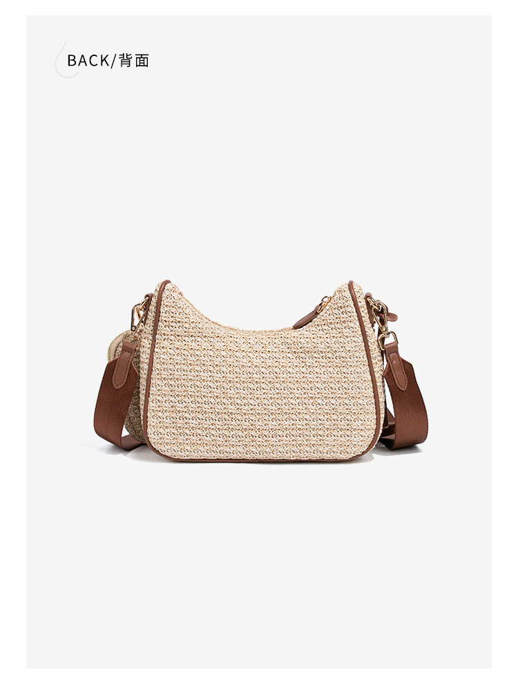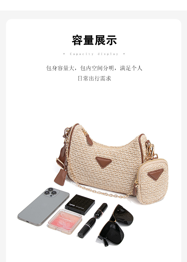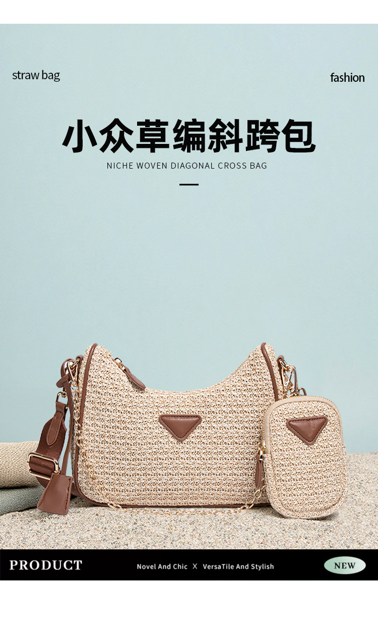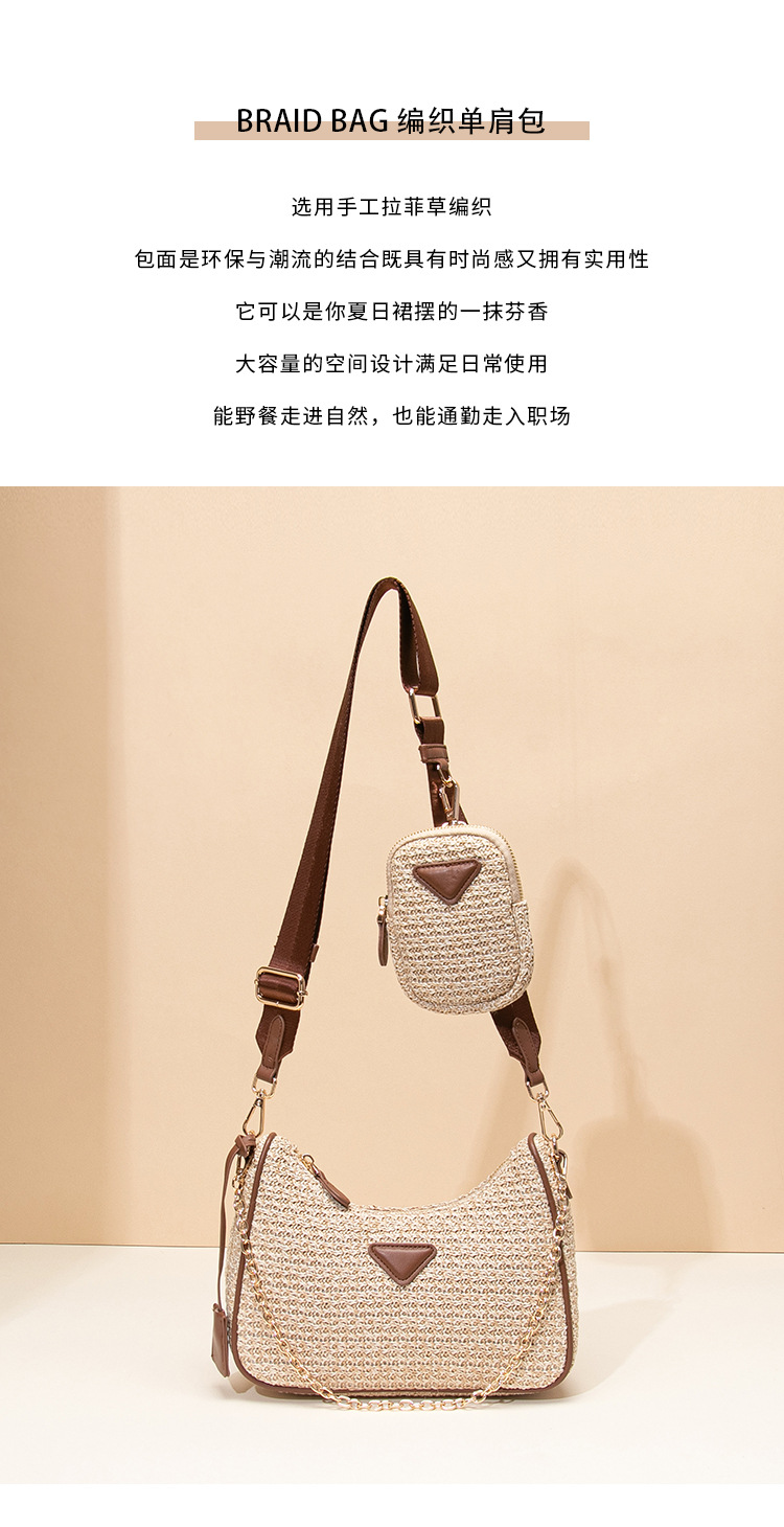 简约小清新斜挎沙滩包拉菲草两件套单肩腋下包时尚小众草编月牙包