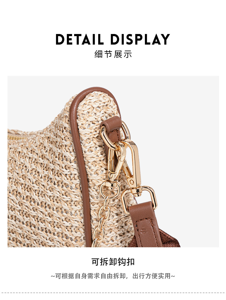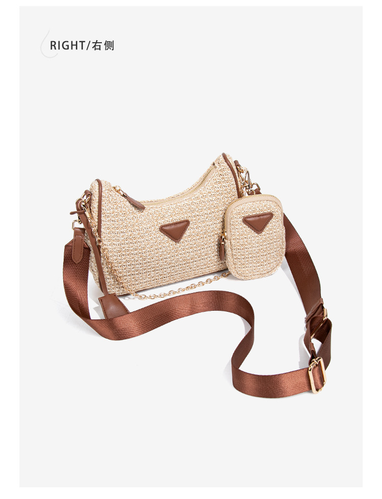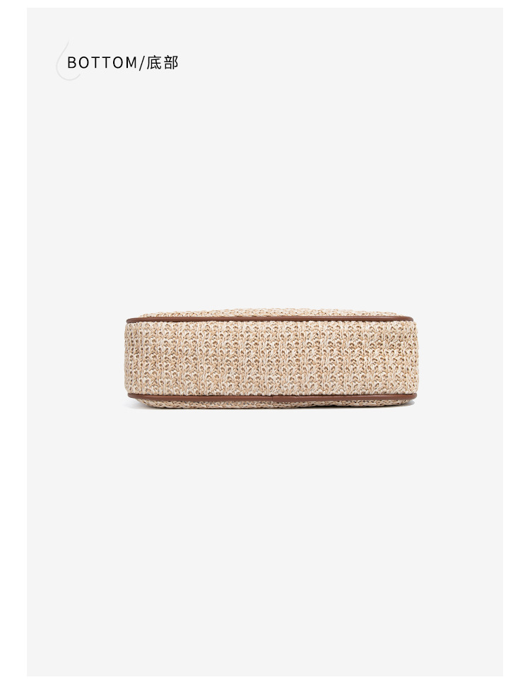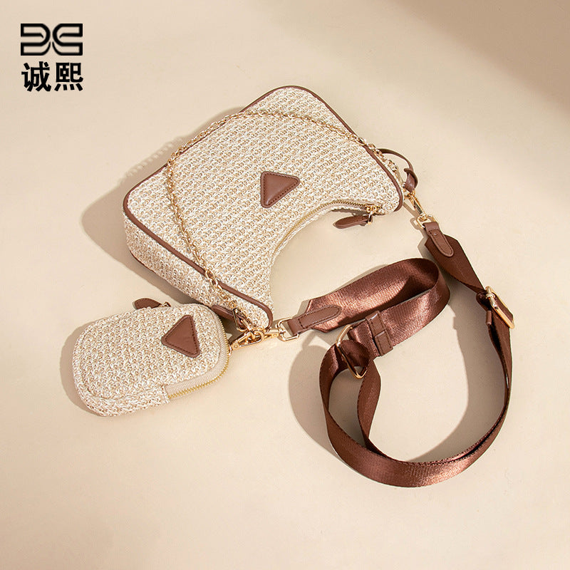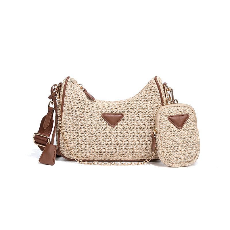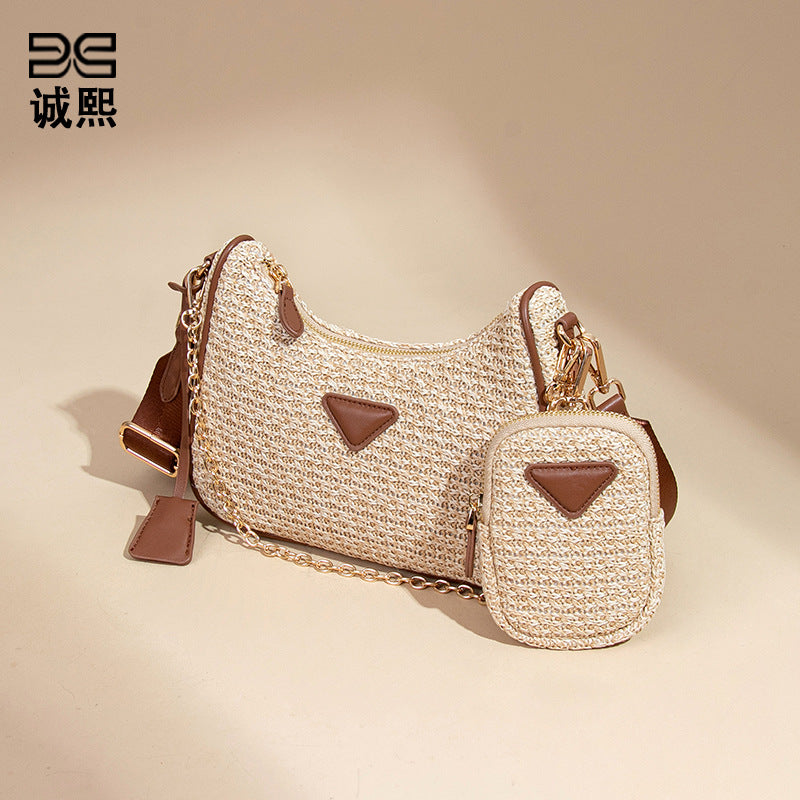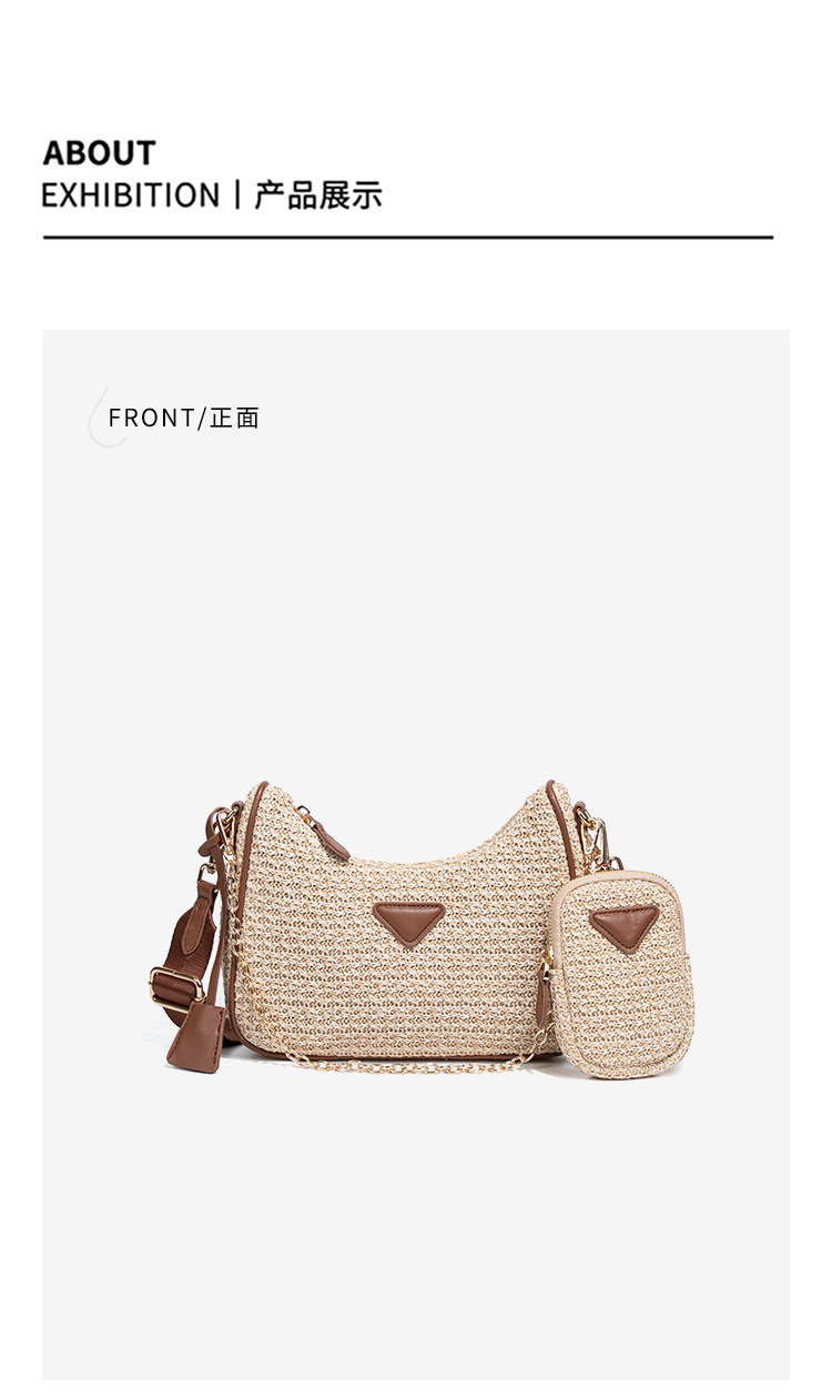 简约小清新斜挎沙滩包拉菲草两件套单肩腋下包时尚小众草编月牙包