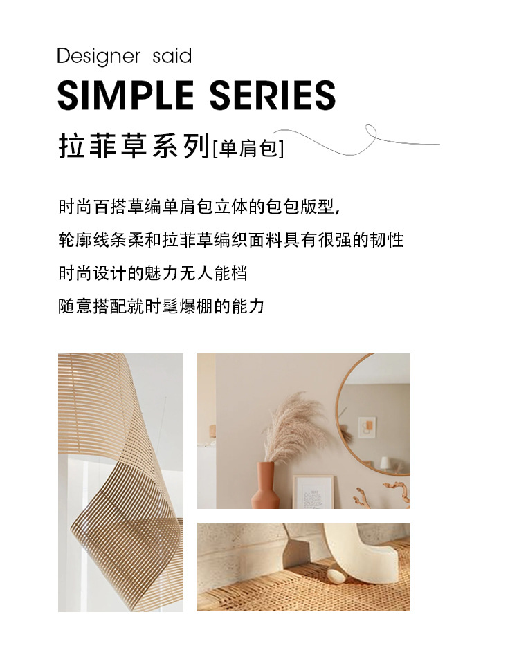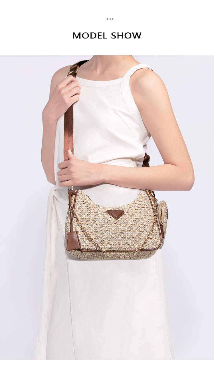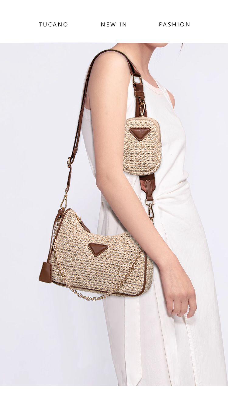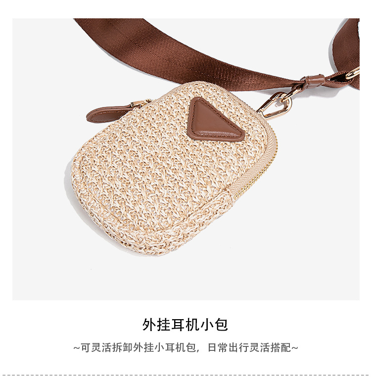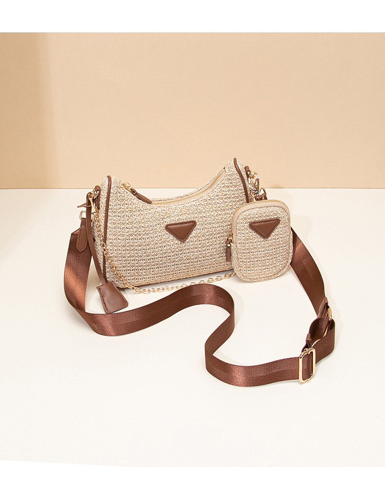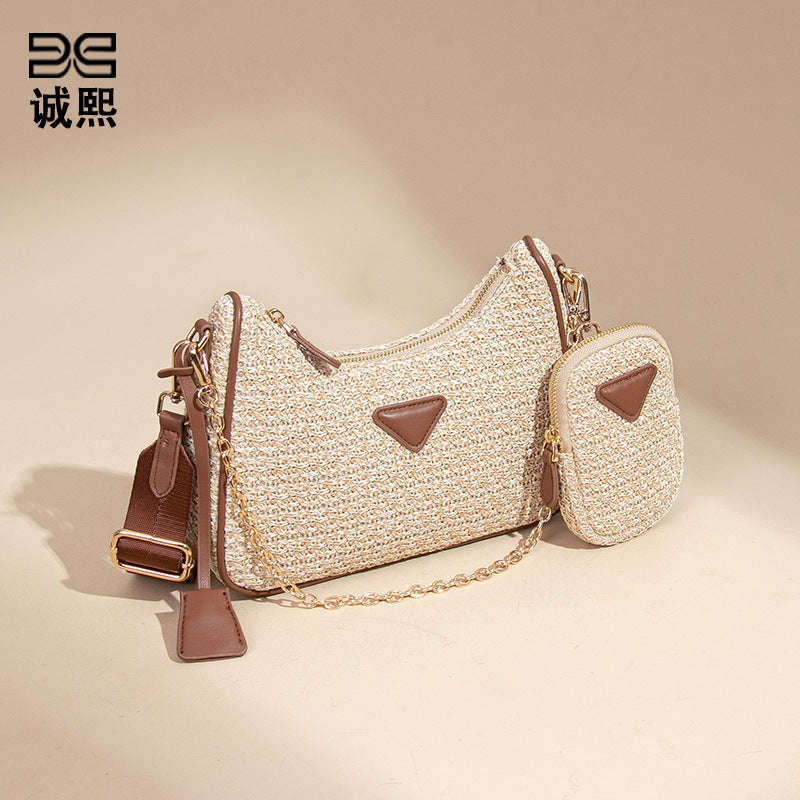 简约小清新斜挎沙滩包拉菲草两件套单肩腋下包时尚小众草编月牙包