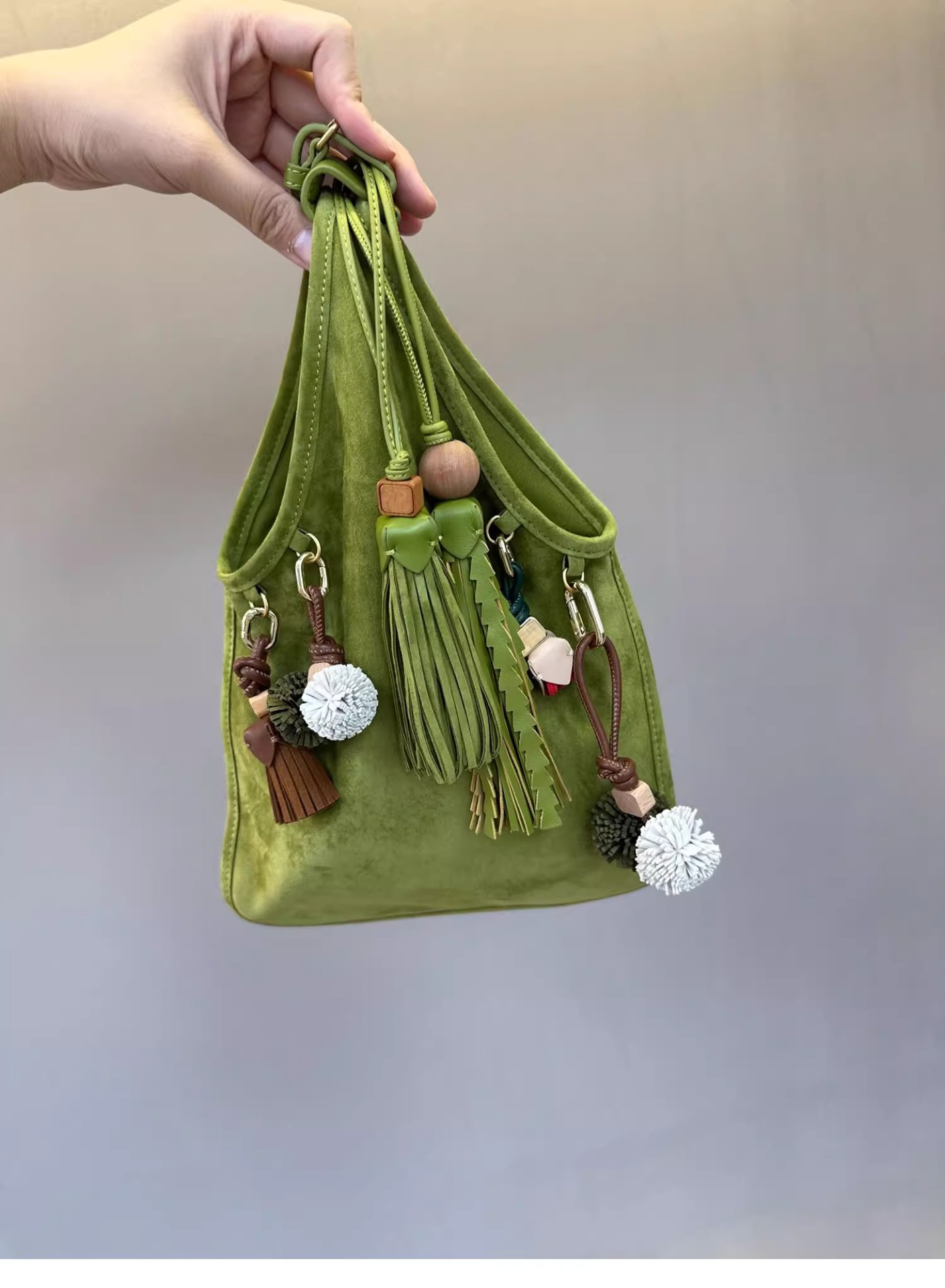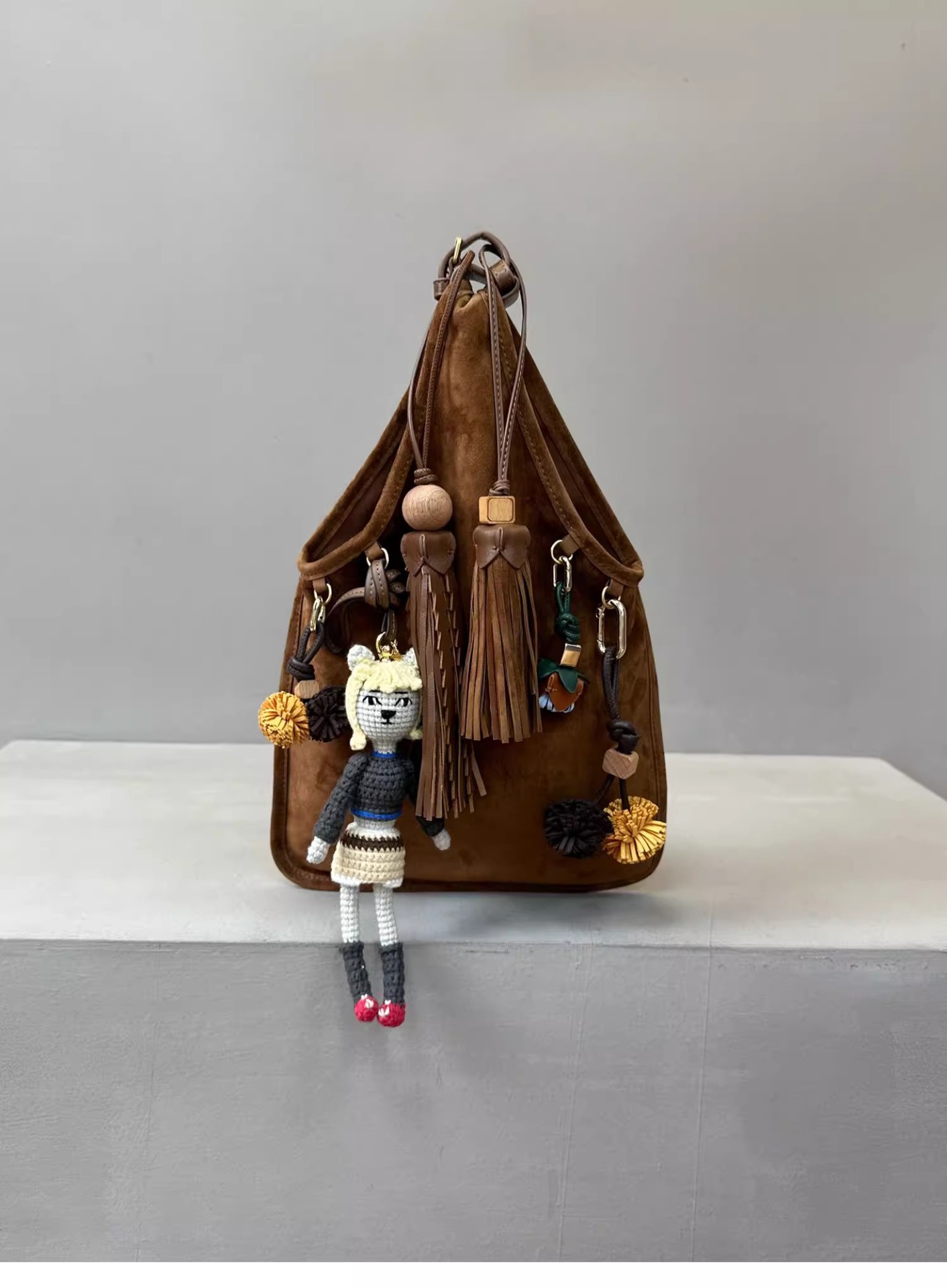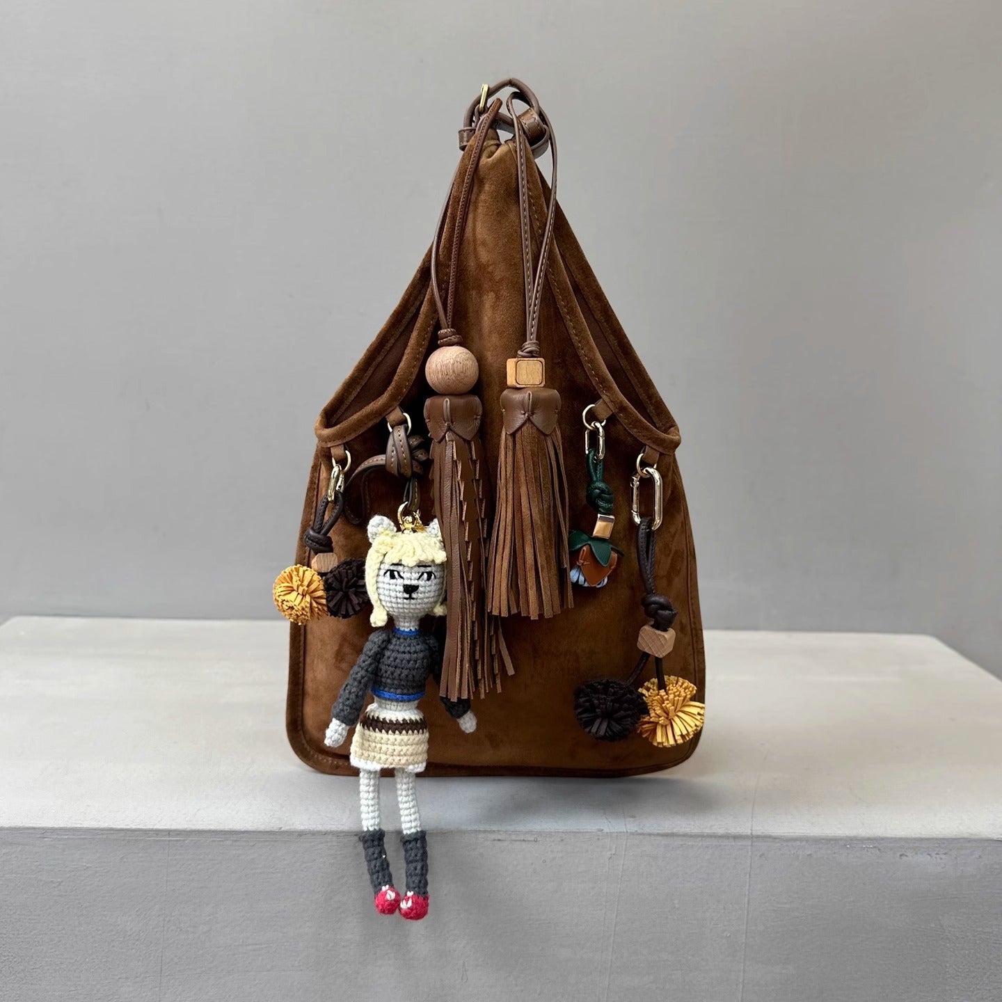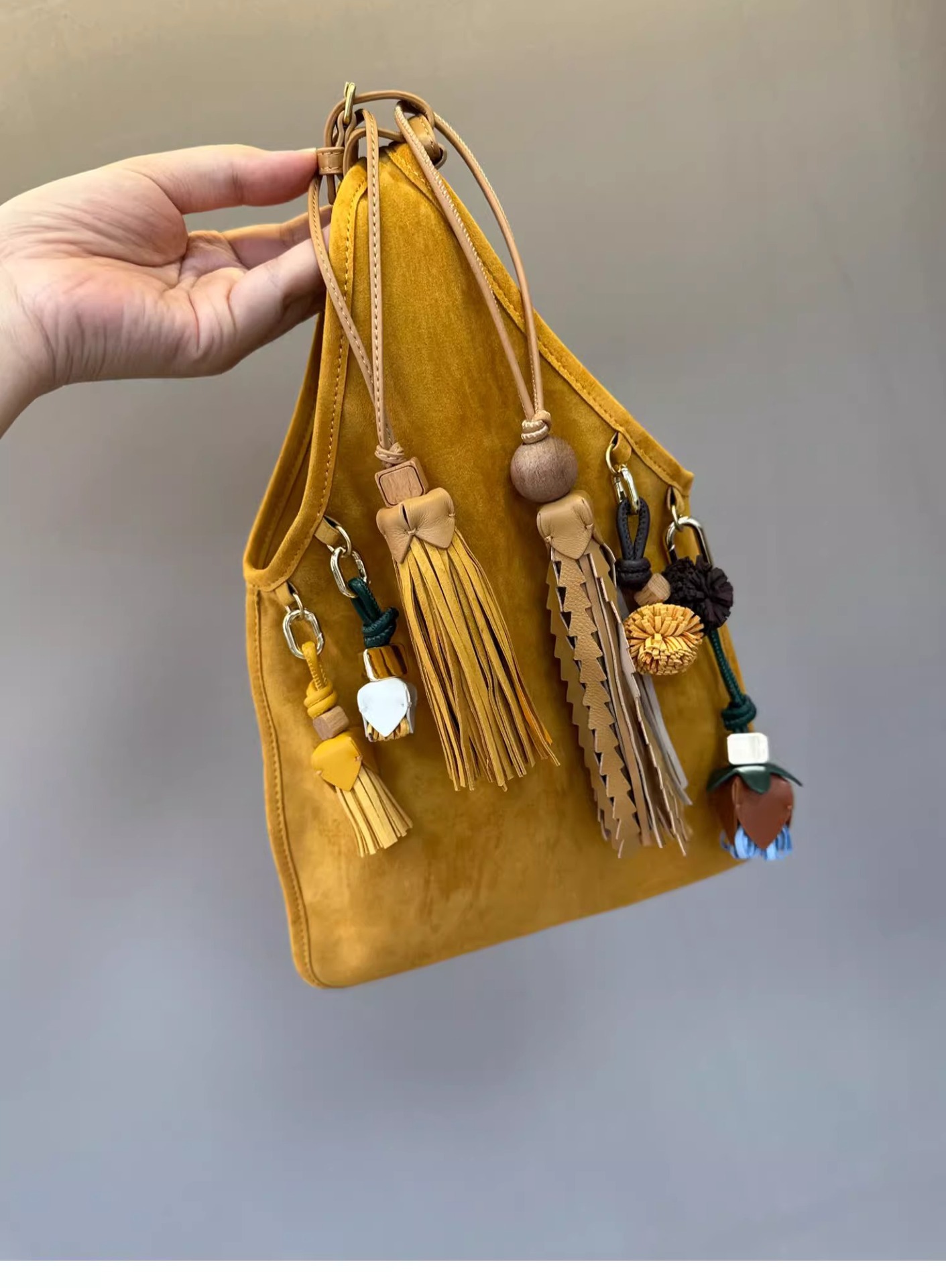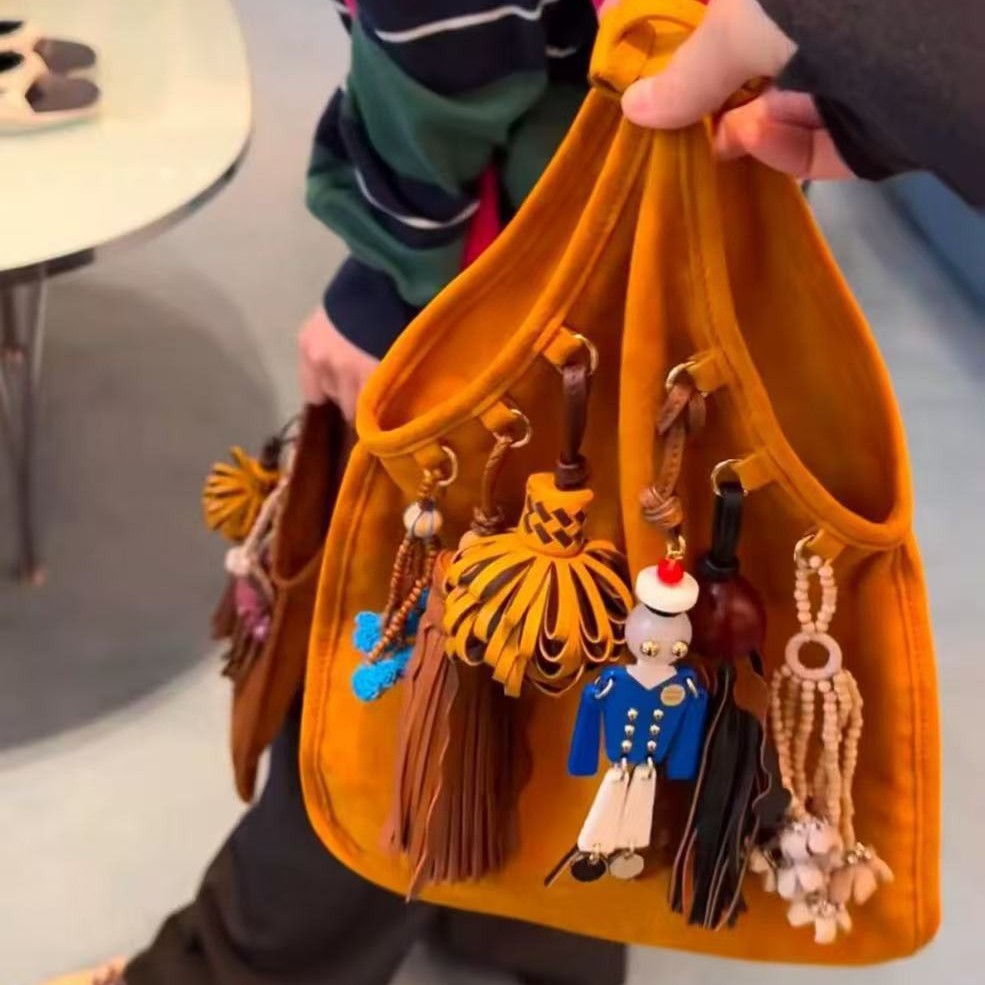 繆家2025新款麂皮流苏腋下包翻毛真皮复古手提包女玩偶挂件手拎包
