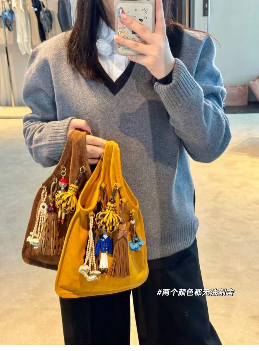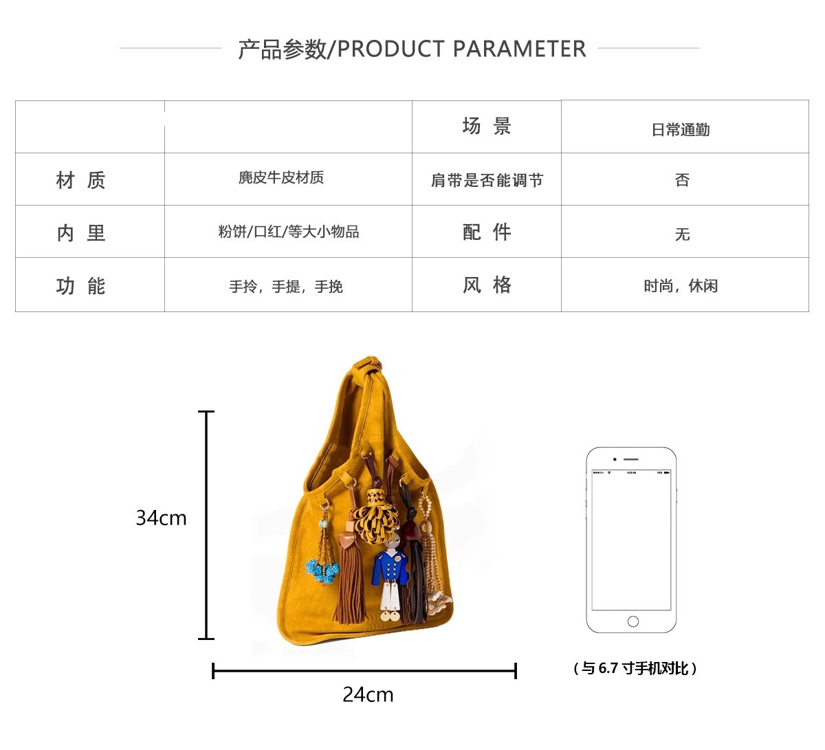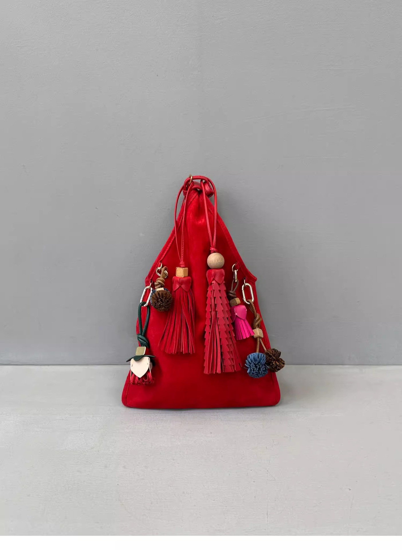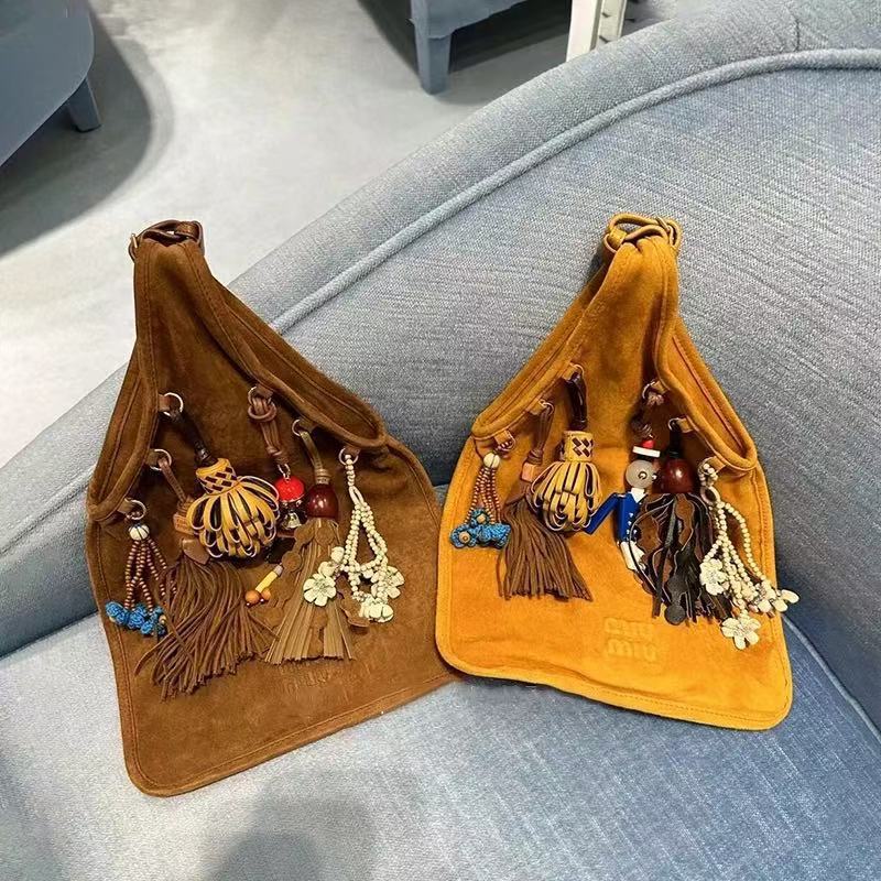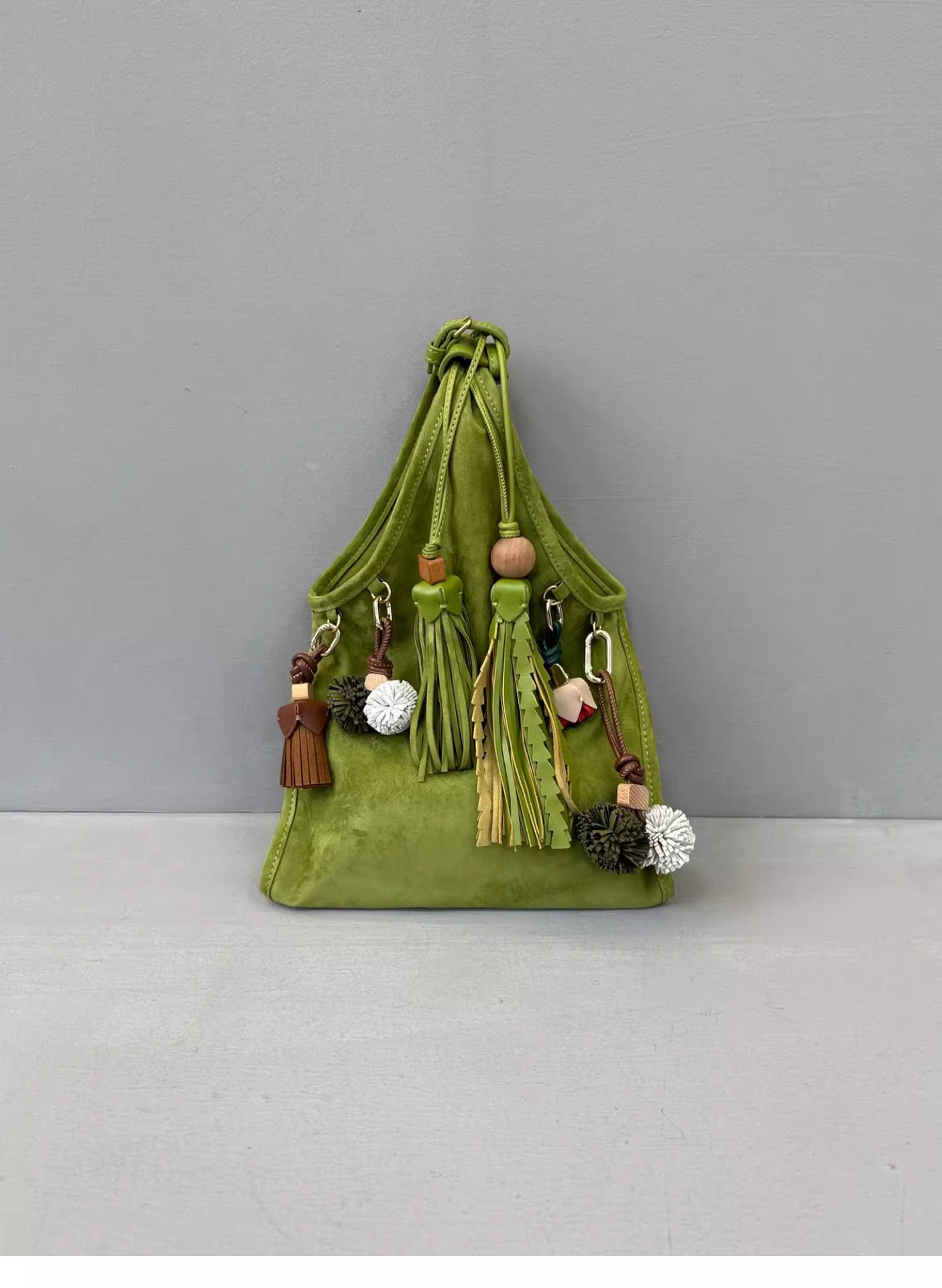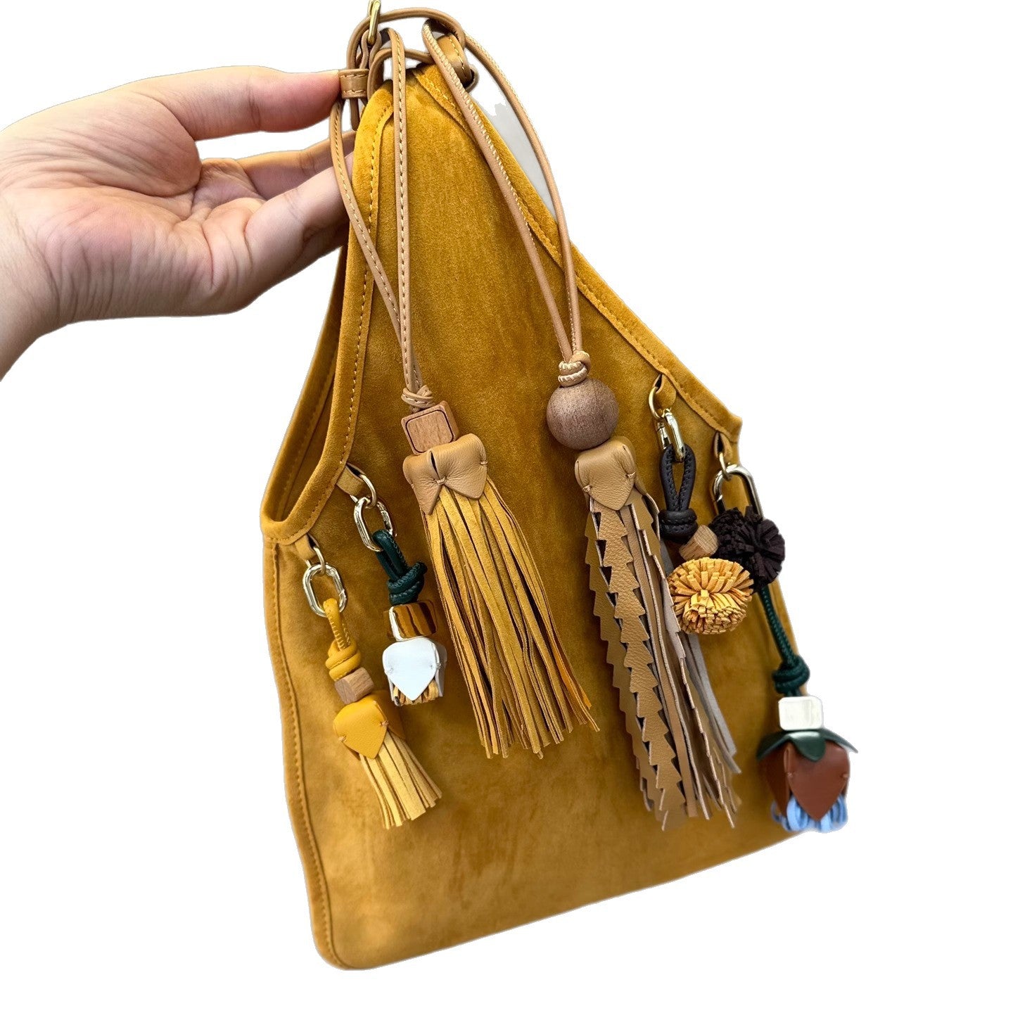 繆家2025新款麂皮流苏腋下包翻毛真皮复古手提包女玩偶挂件手拎包