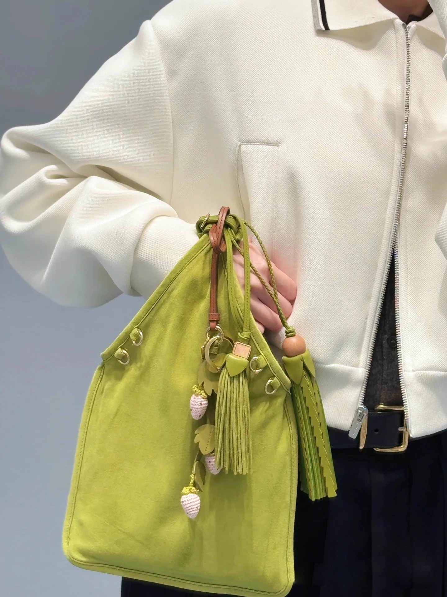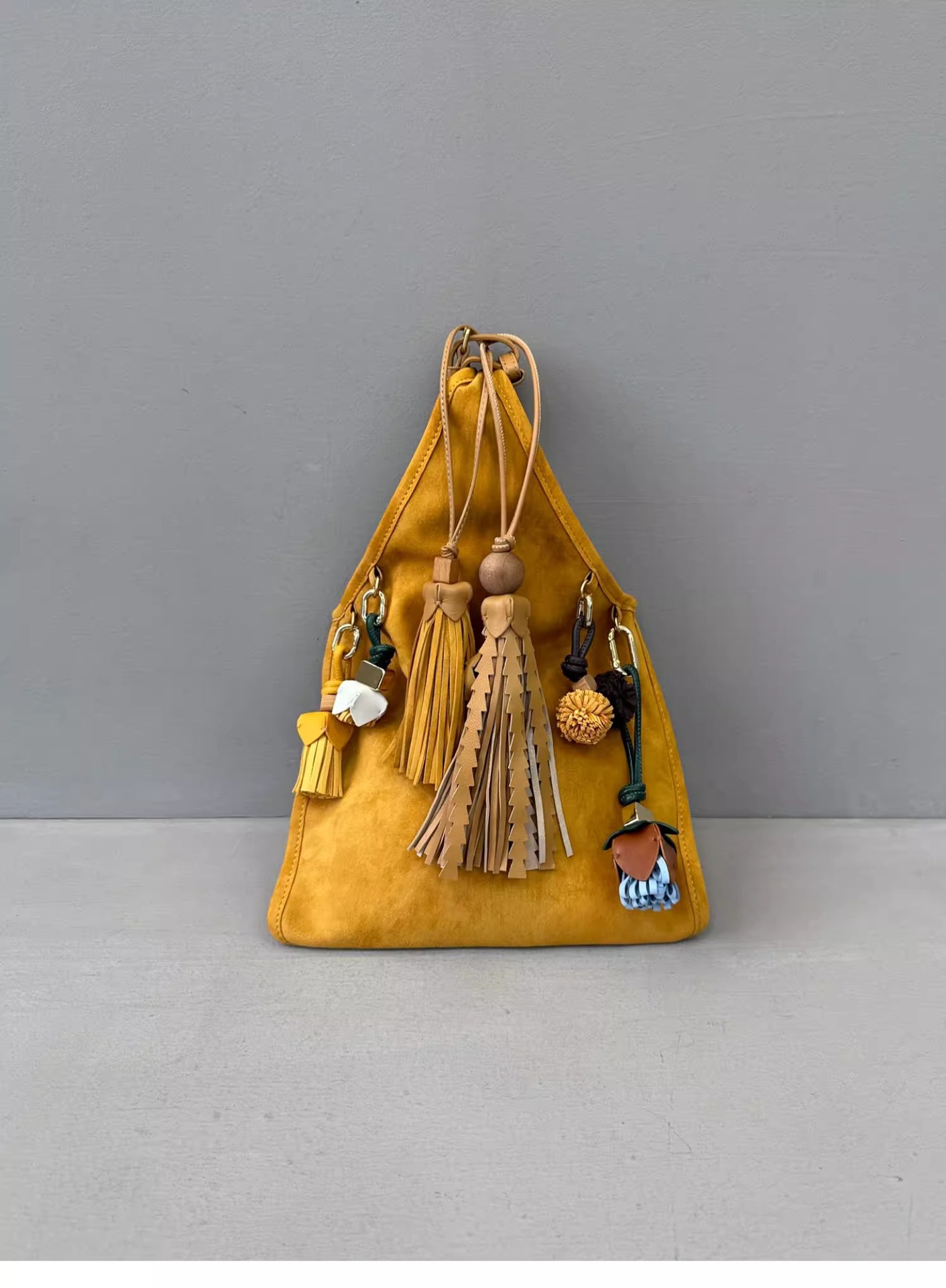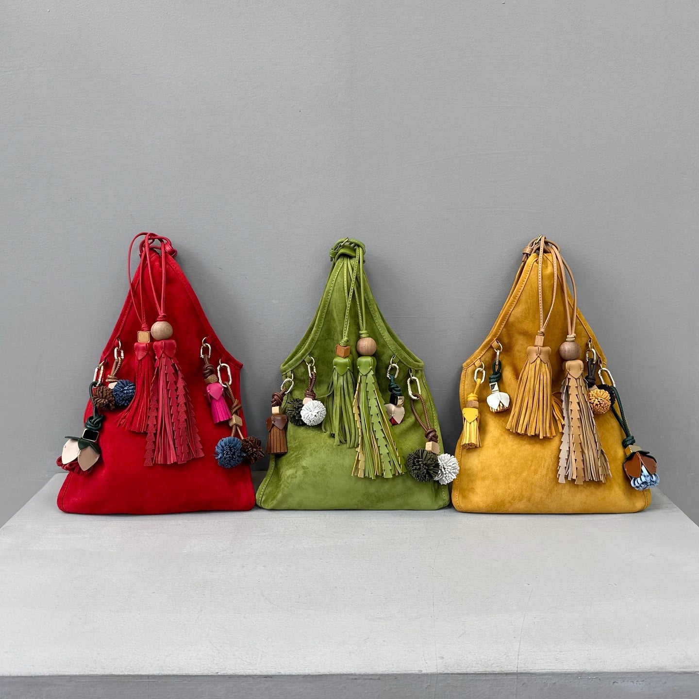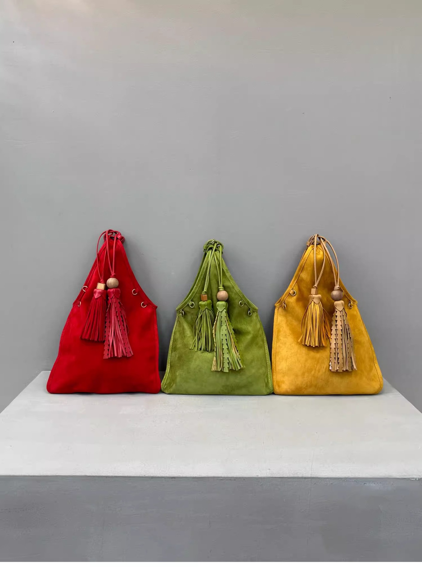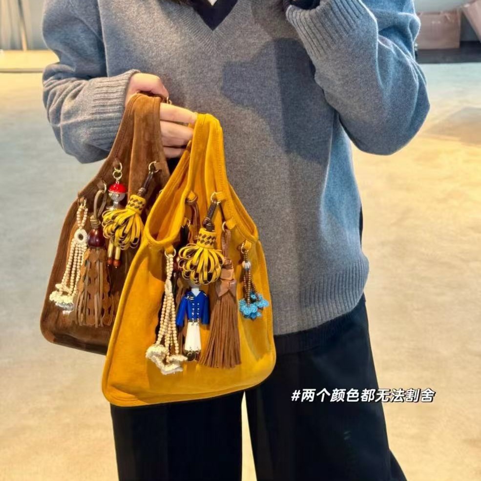 繆家2025新款麂皮流苏腋下包翻毛真皮复古手提包女玩偶挂件手拎包
