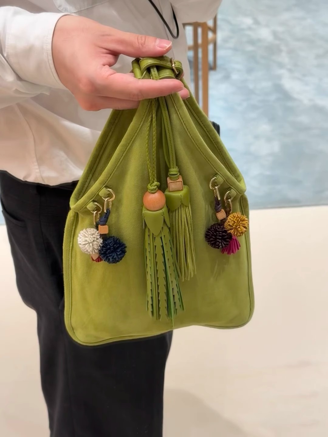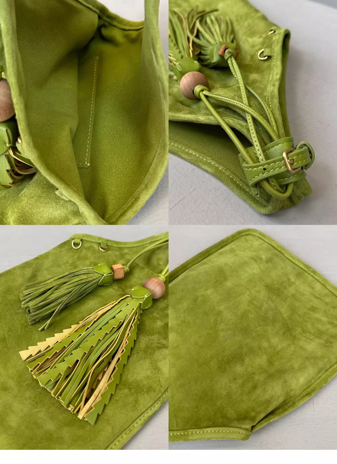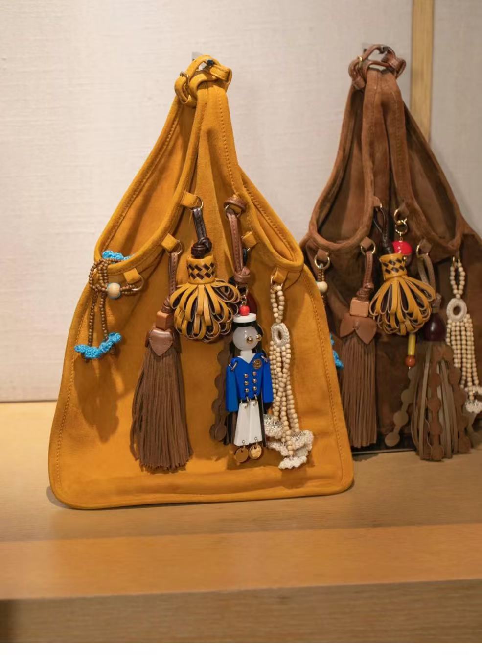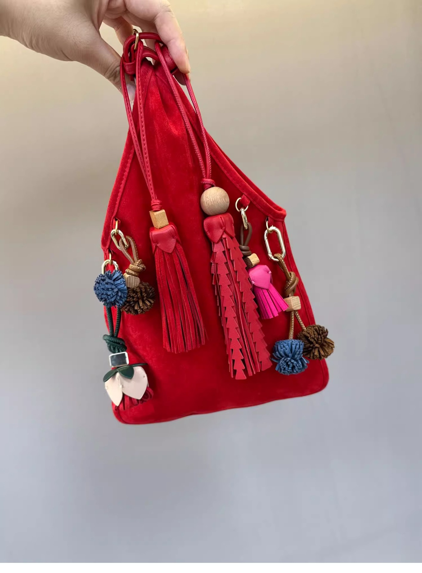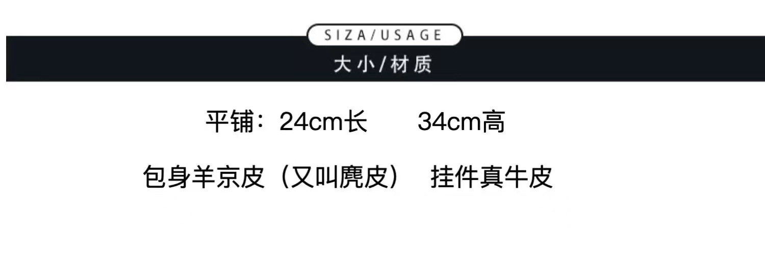 繆家2025新款麂皮流苏腋下包翻毛真皮复古手提包女玩偶挂件手拎包
