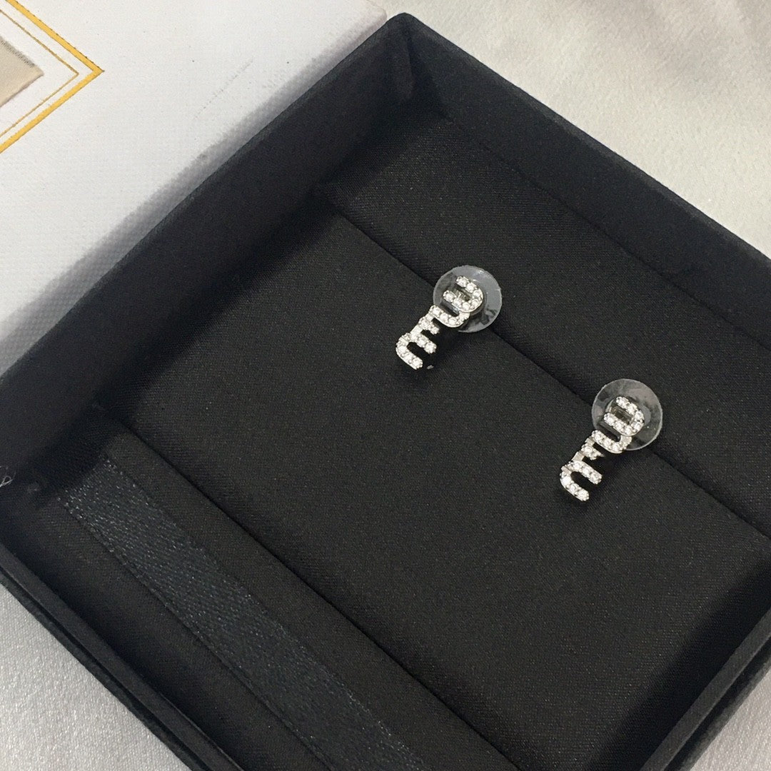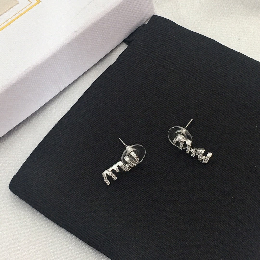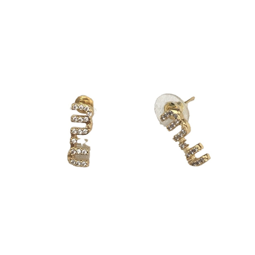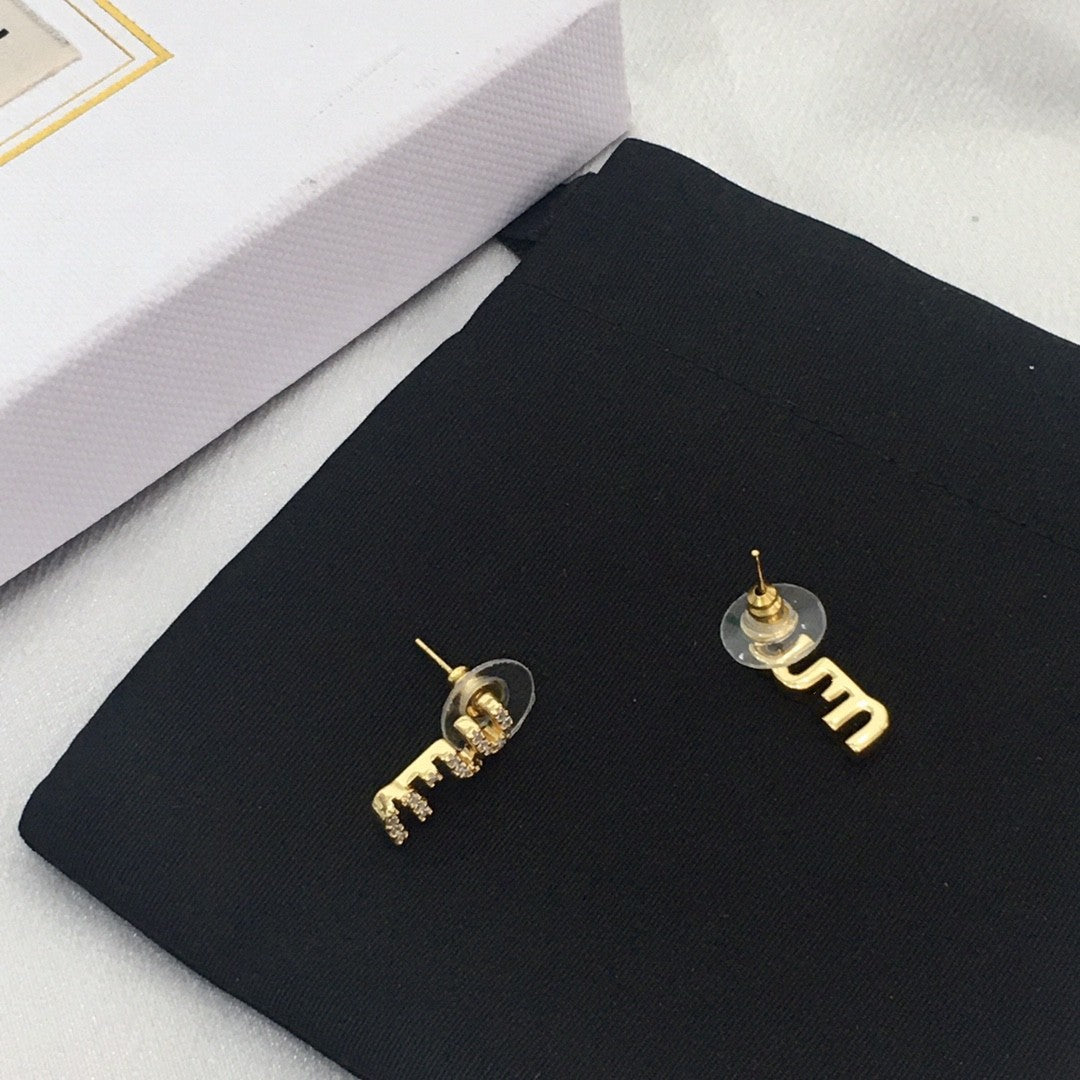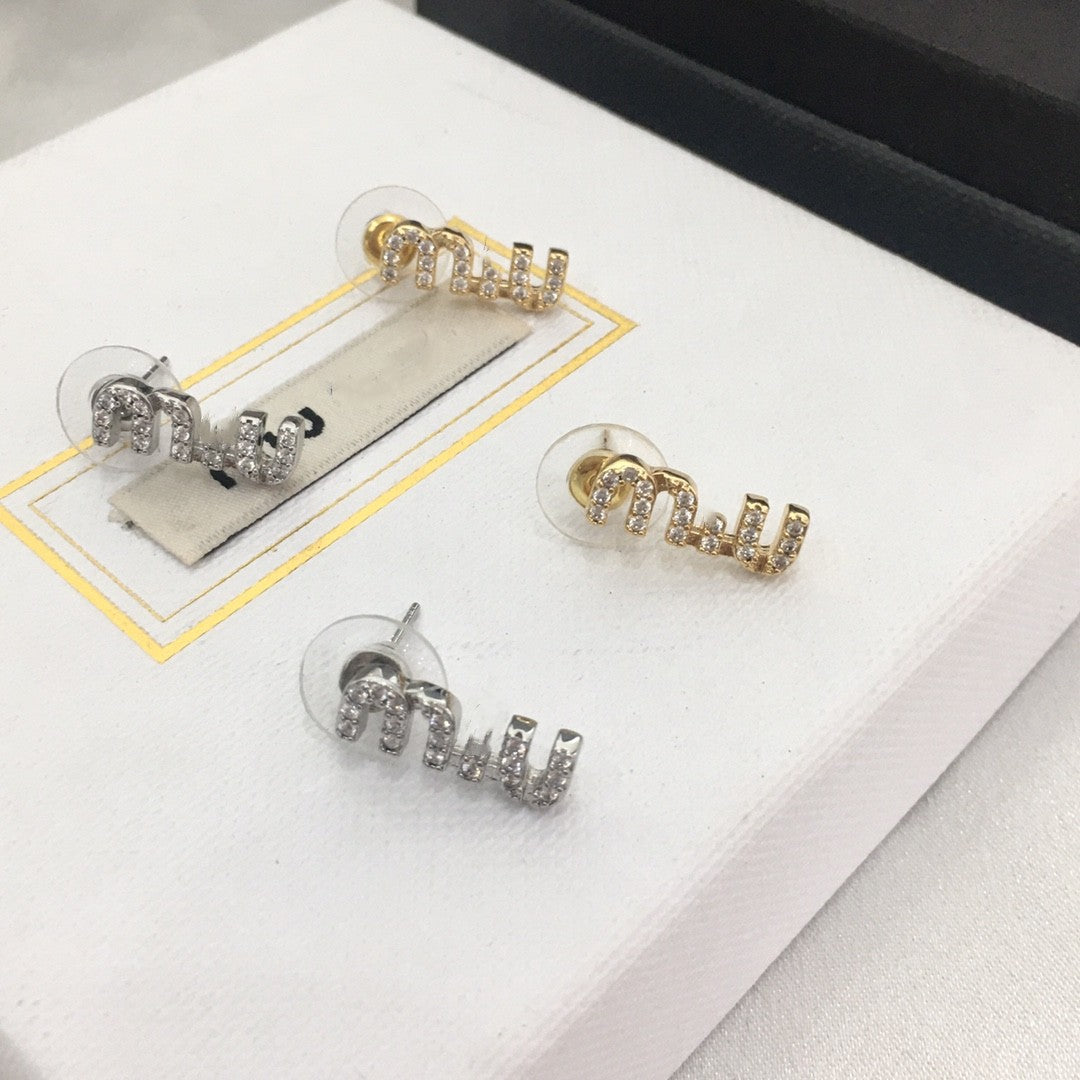缪家新款字母耳钉女高级感个性气质黄铜镀金镶钻MIU耳环
