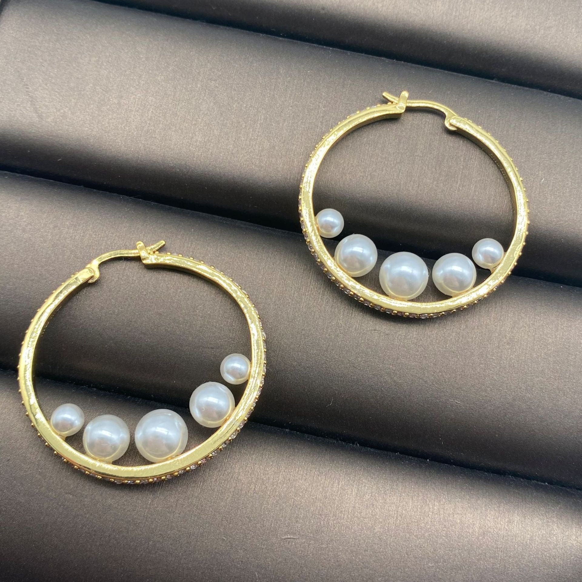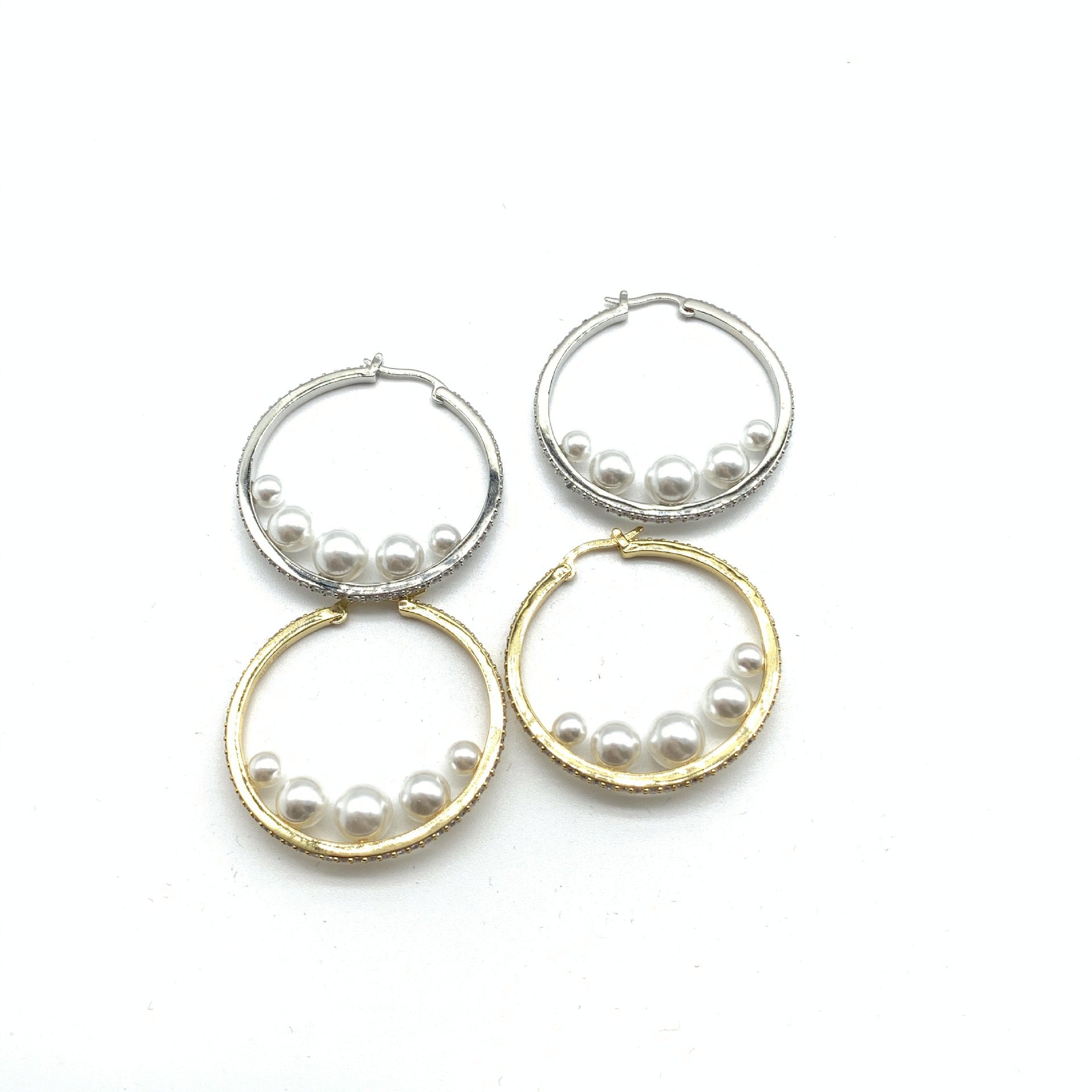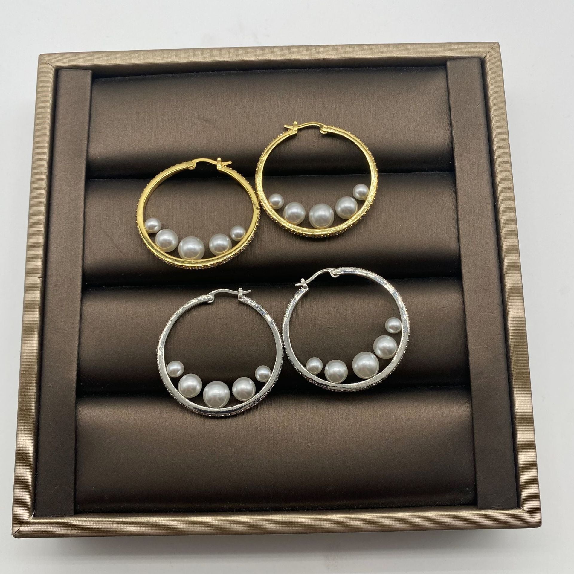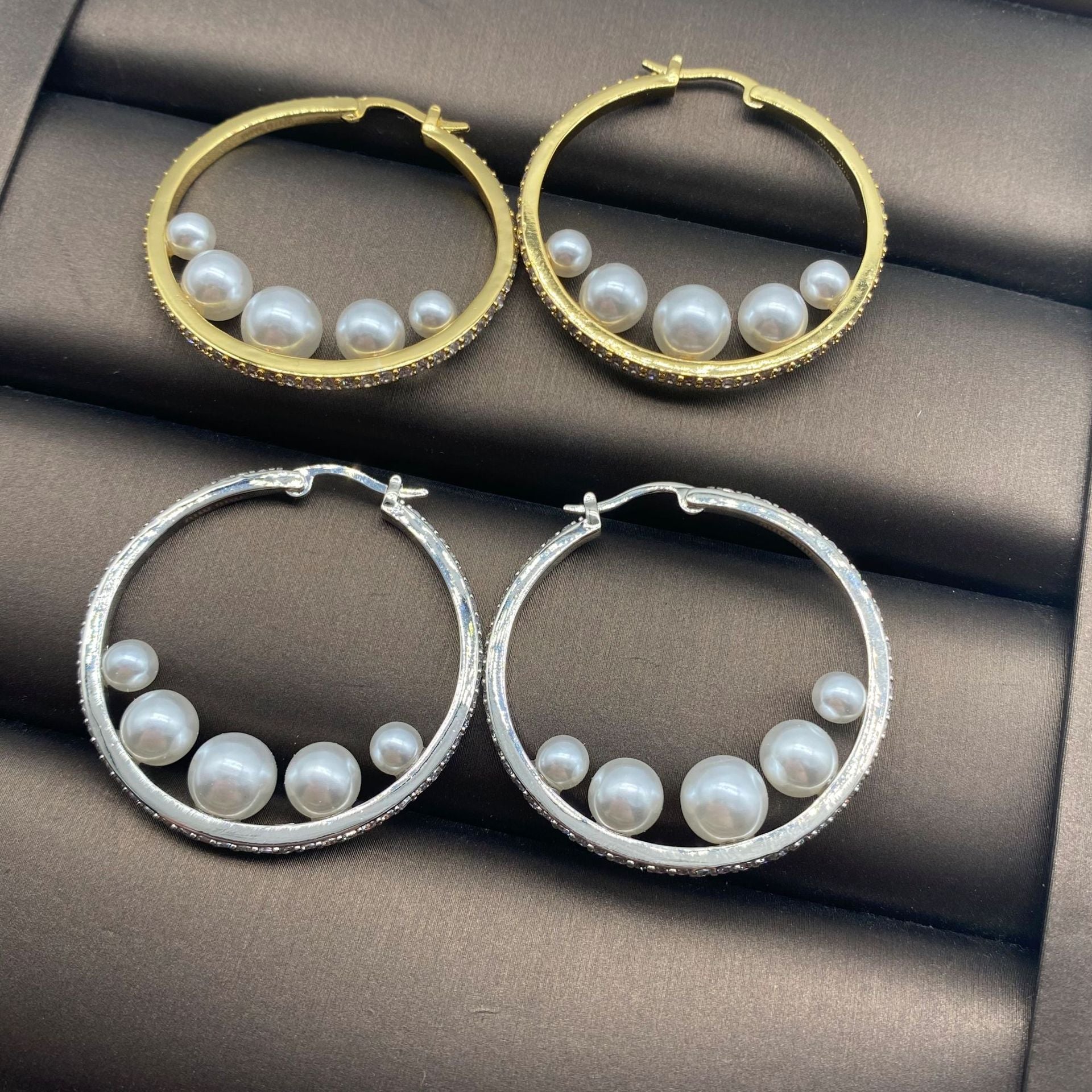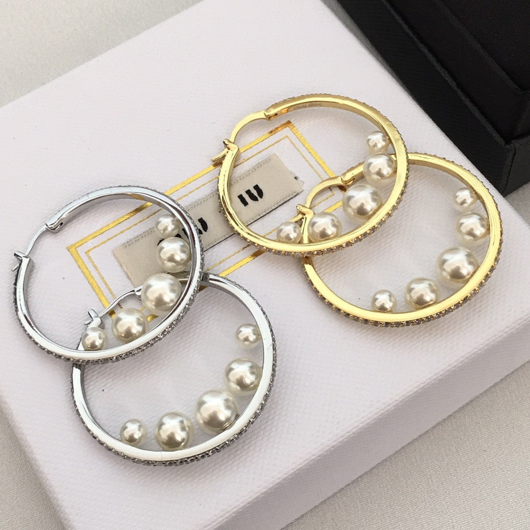 缪家新款耳圈珍珠水钻欧美简约大气时尚耳饰圆圈珍珠水晶耳钉女