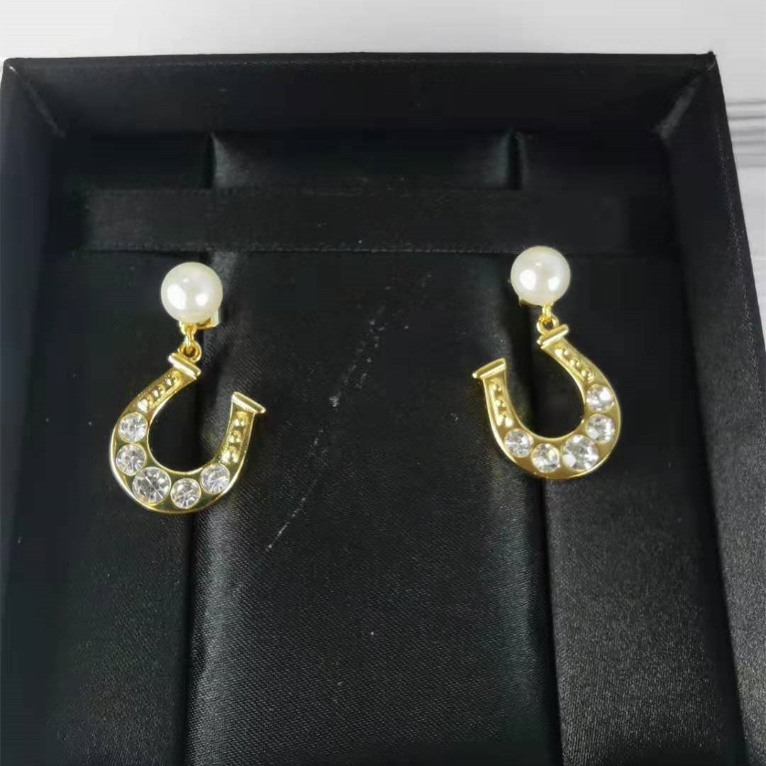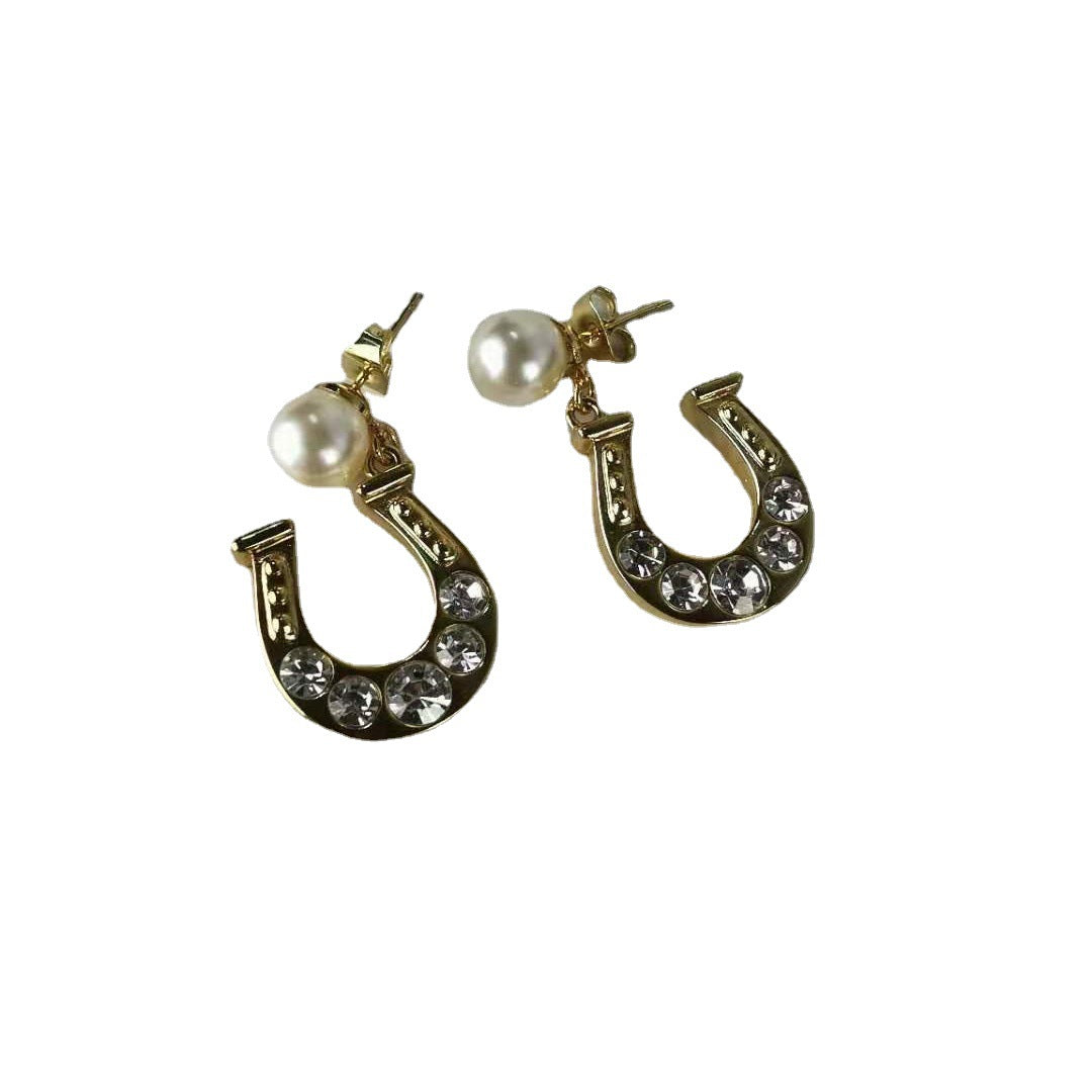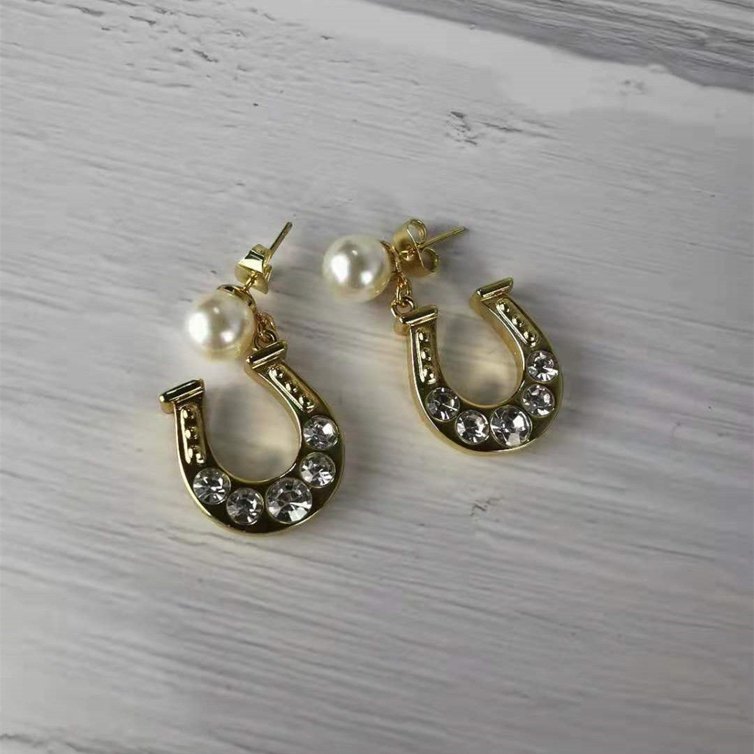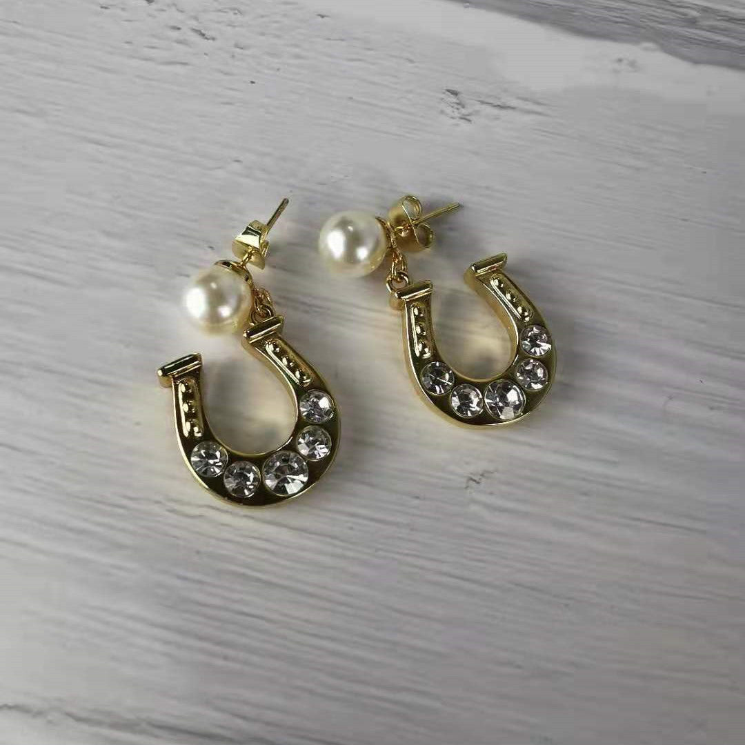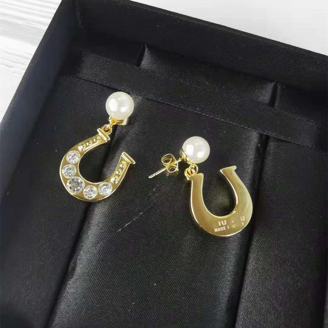 缪家新款金色U形几何马蹄珍珠镶钻耳钉耳环甜美气质高级感耳饰