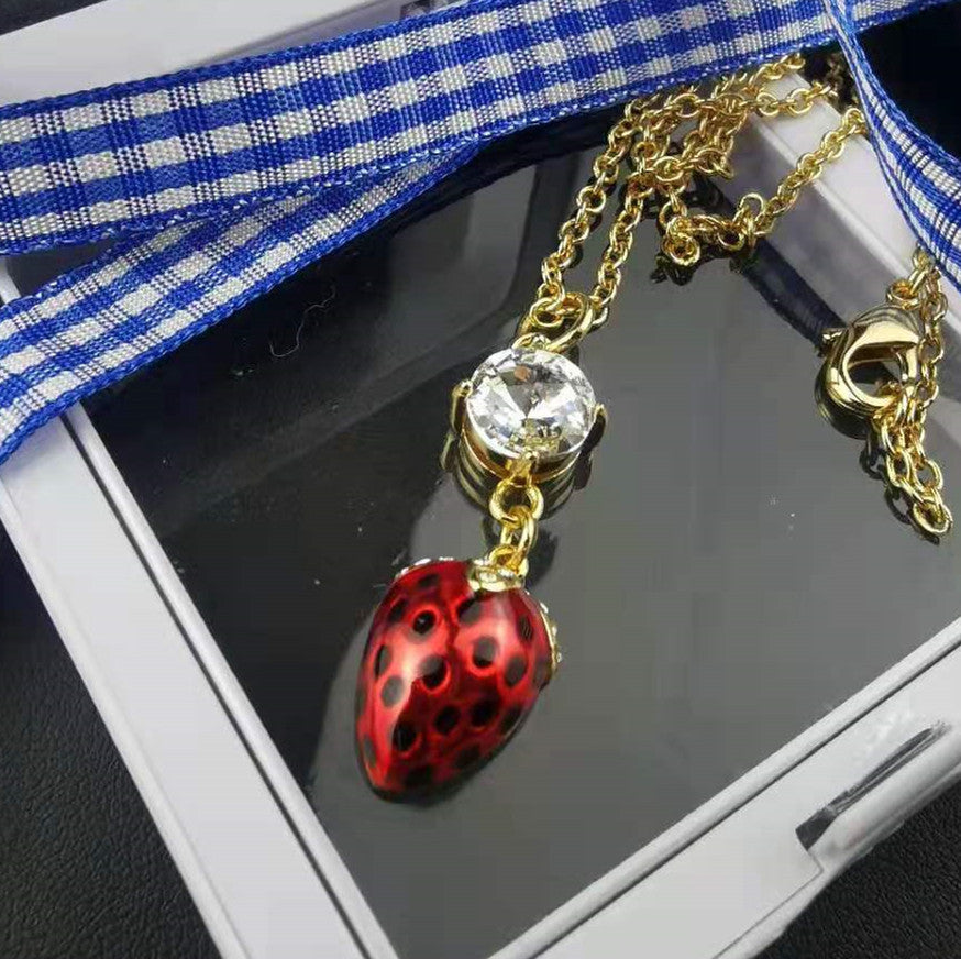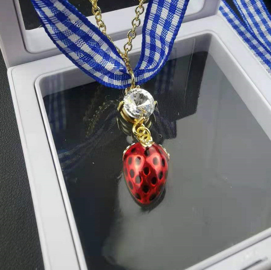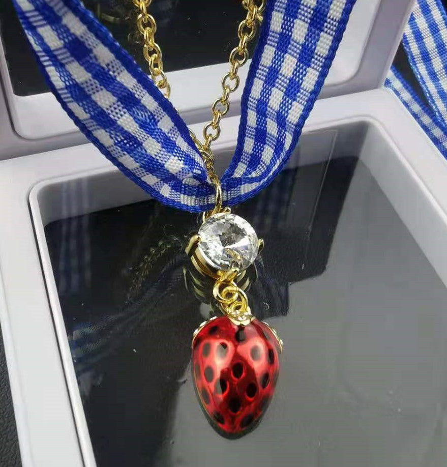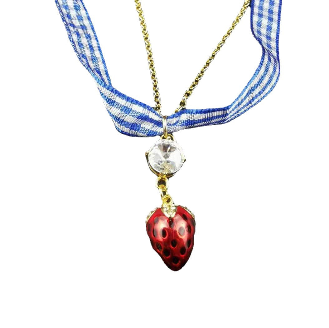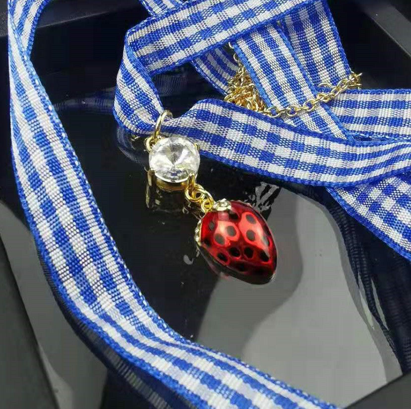 缪家新款项链女草莓镶钻蓝色格子绑带甜美时尚个性一款二戴锁骨链