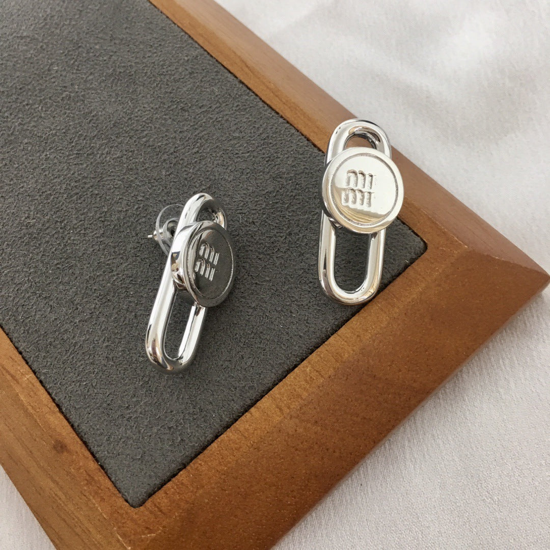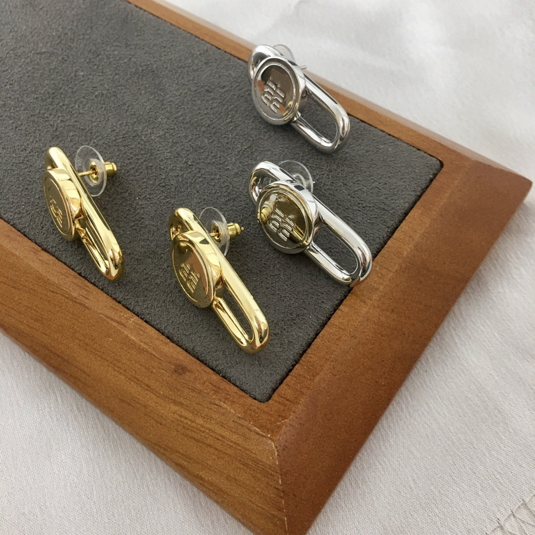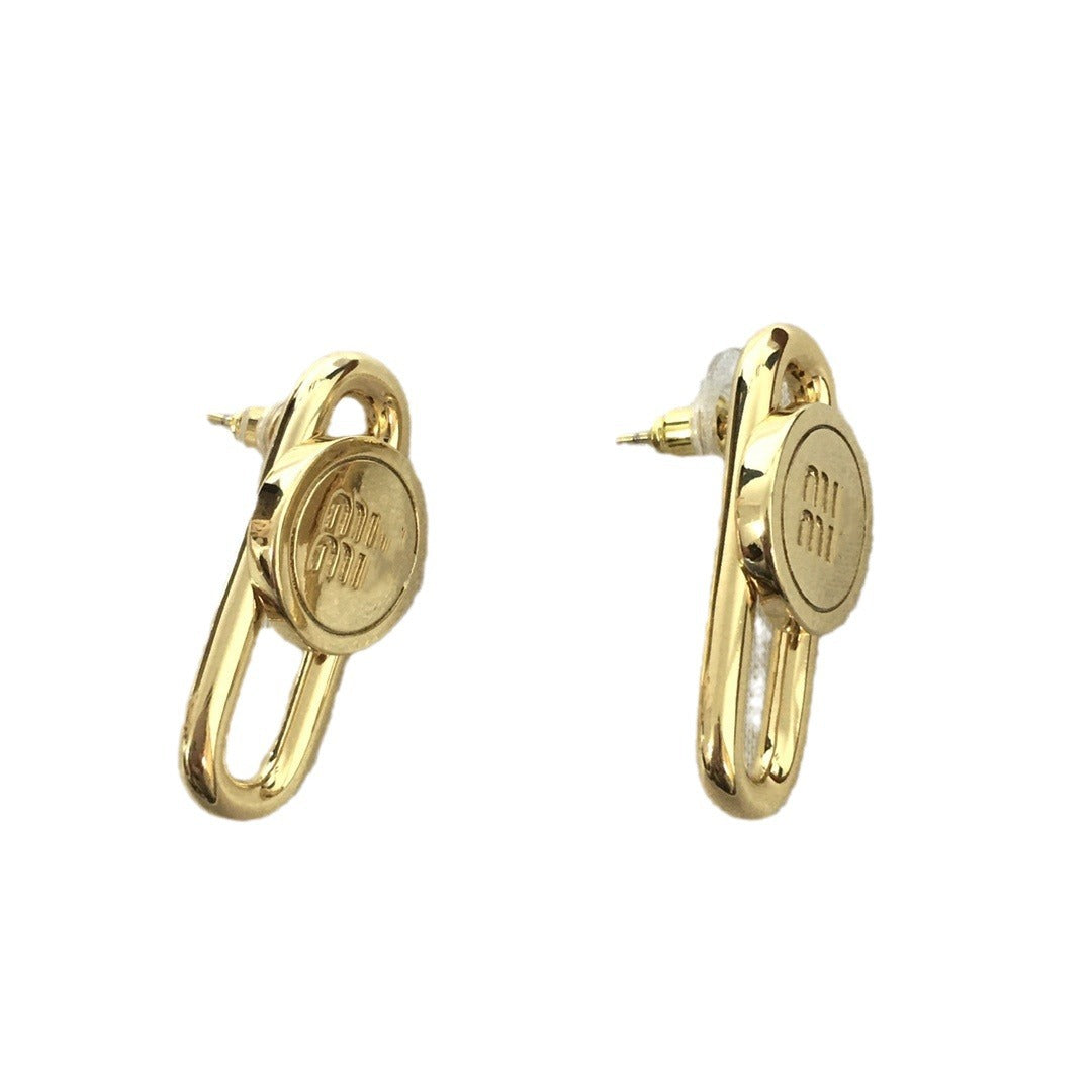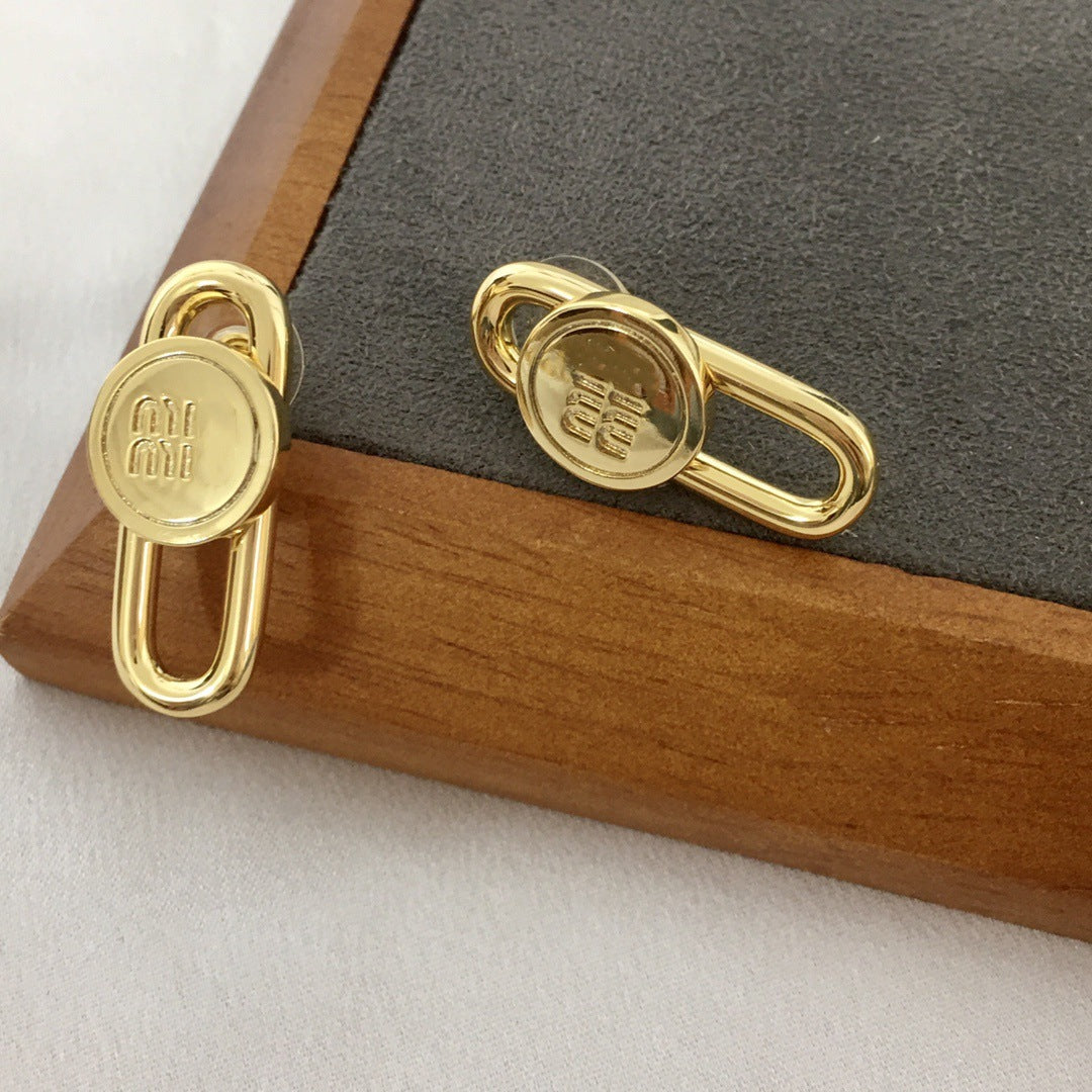 缪家新款MIU徽标耳钉女高级感个性气质光面黄铜镀金长条环形耳环