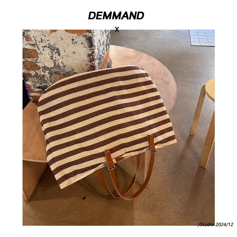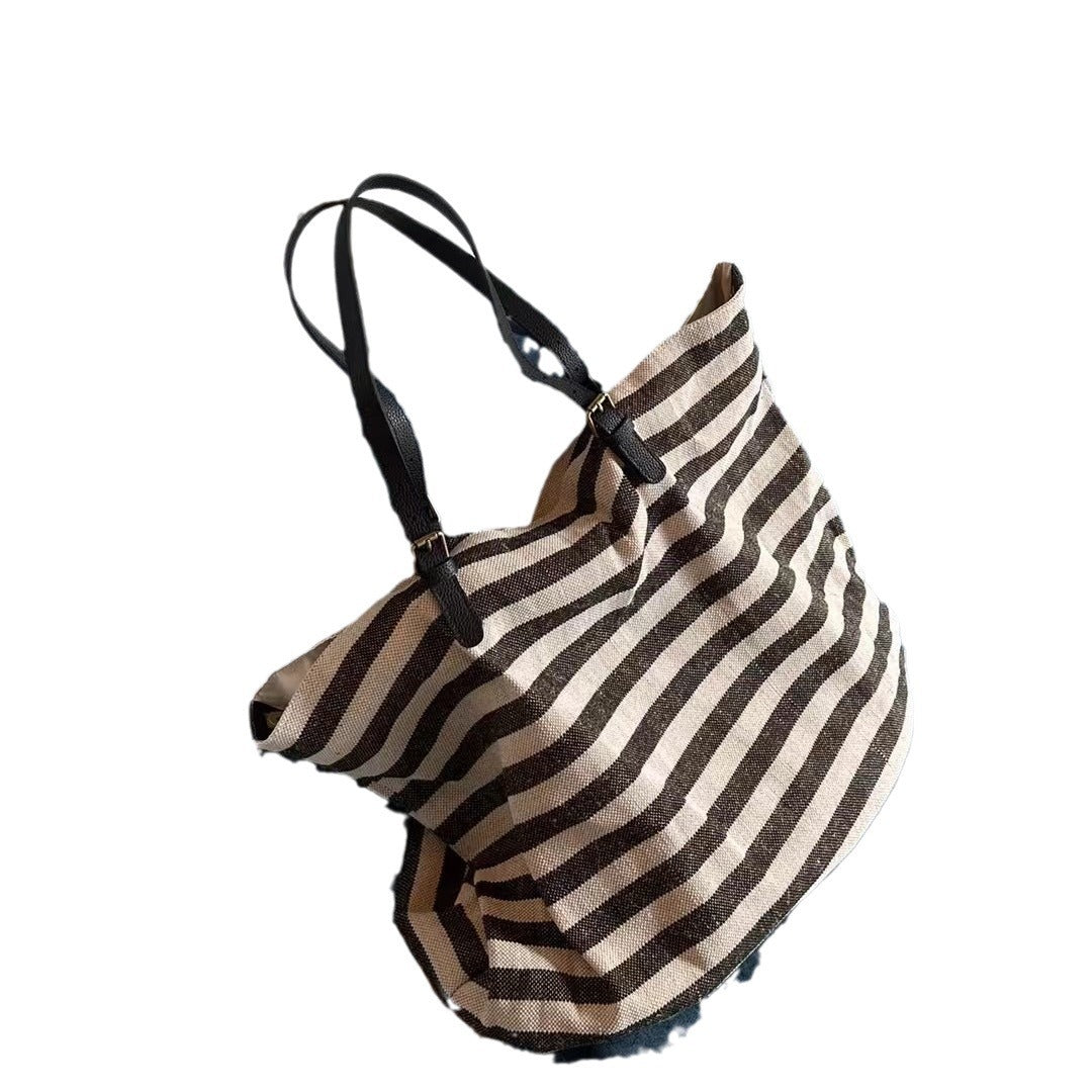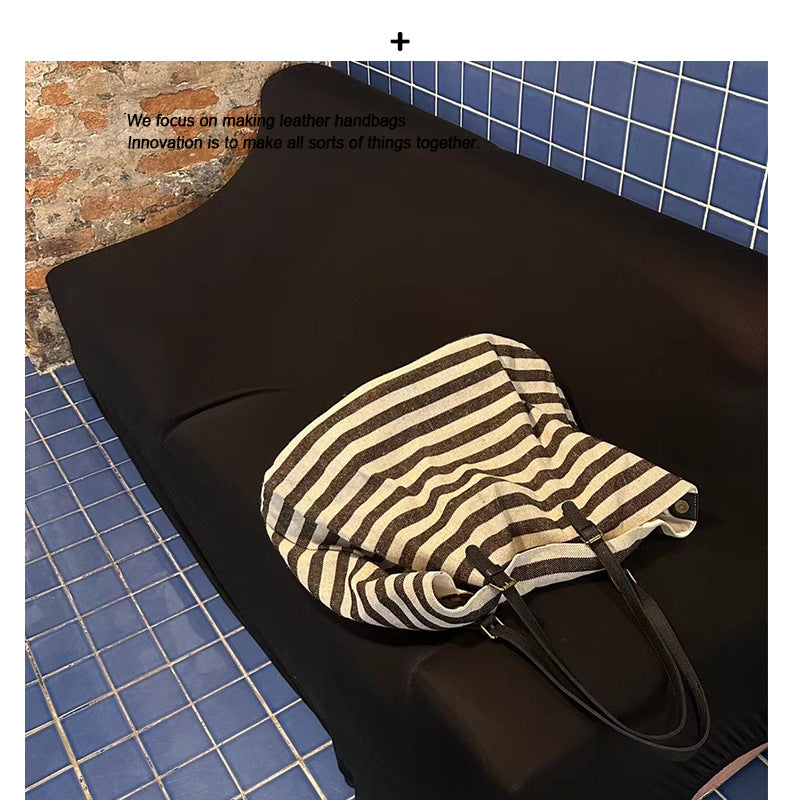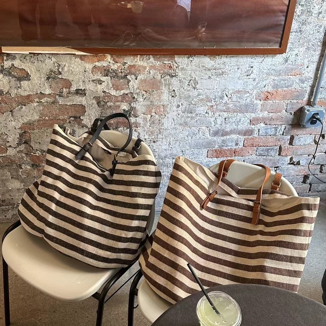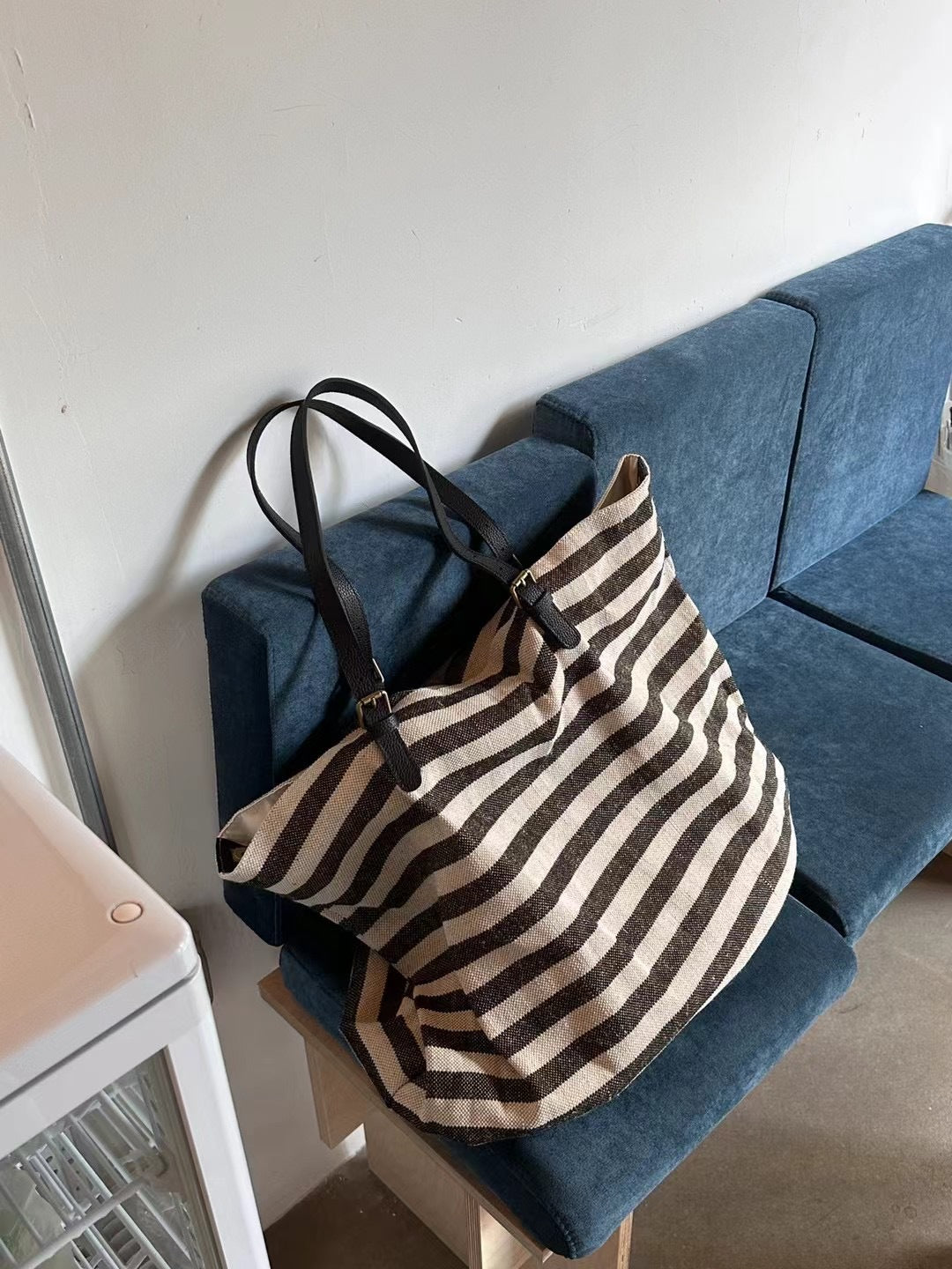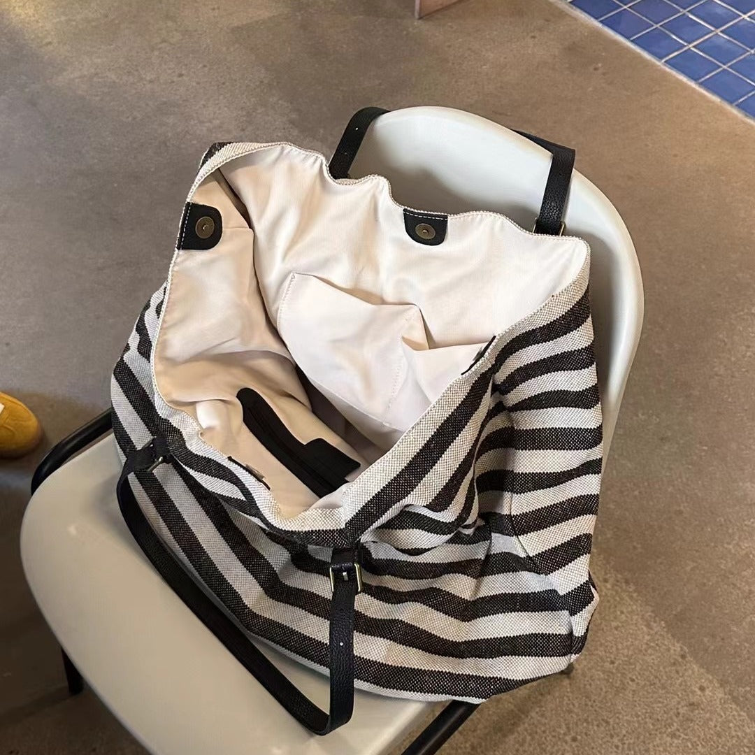 网红同款包包女士2024新款大容量条纹棉麻牛皮单肩托特包手提大包