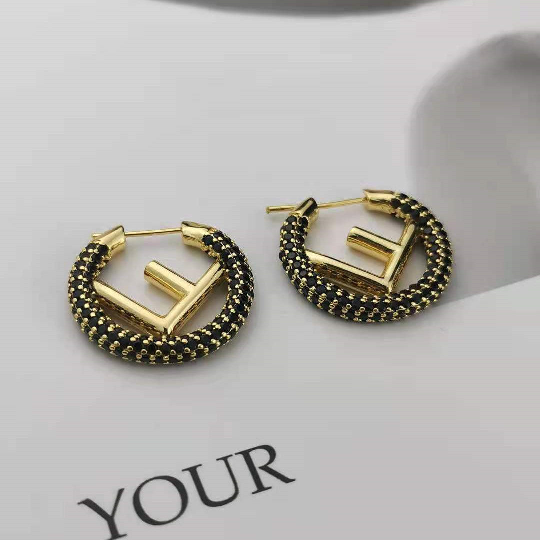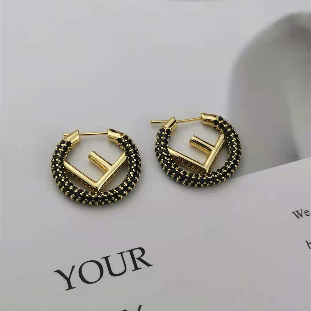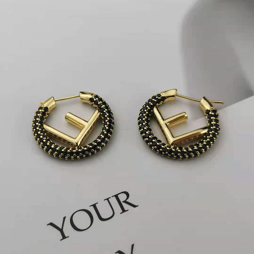 芬家21新款F字母镶钻圆圈耳环高级感气质批发耳饰黑白满钻F耳圈