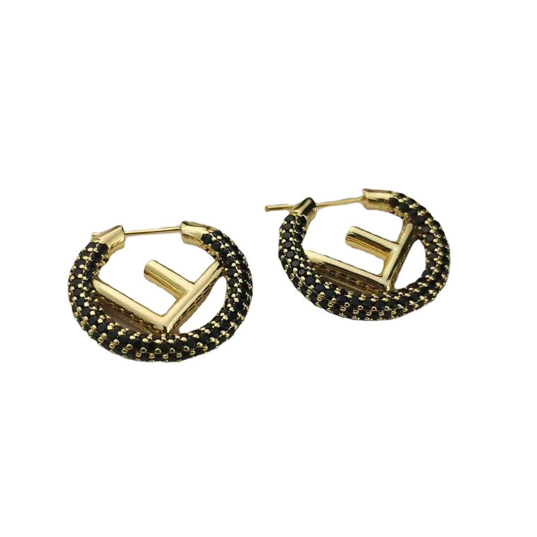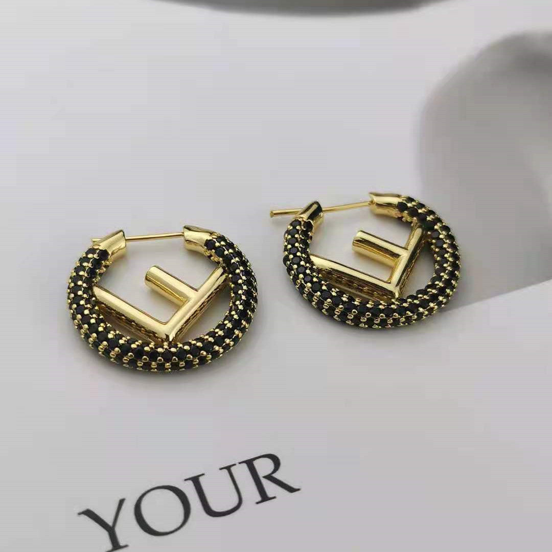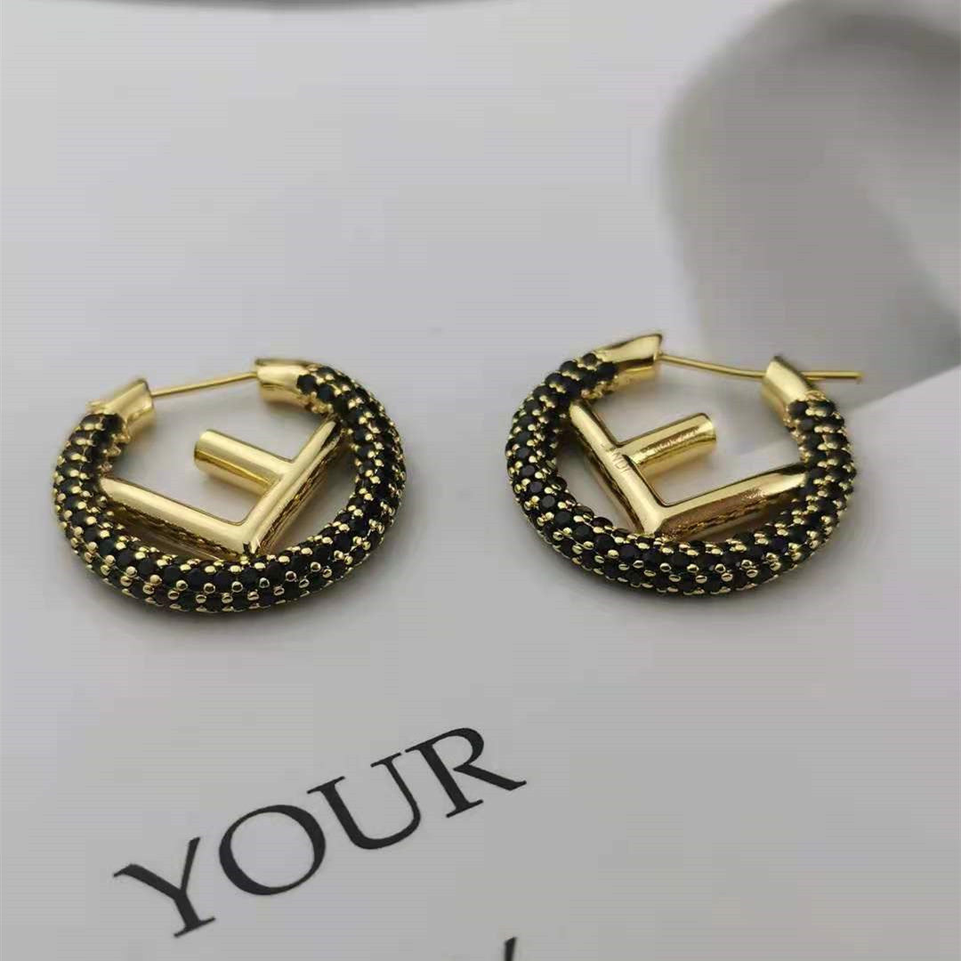 芬家21新款F字母镶钻圆圈耳环高级感气质批发耳饰黑白满钻F耳圈