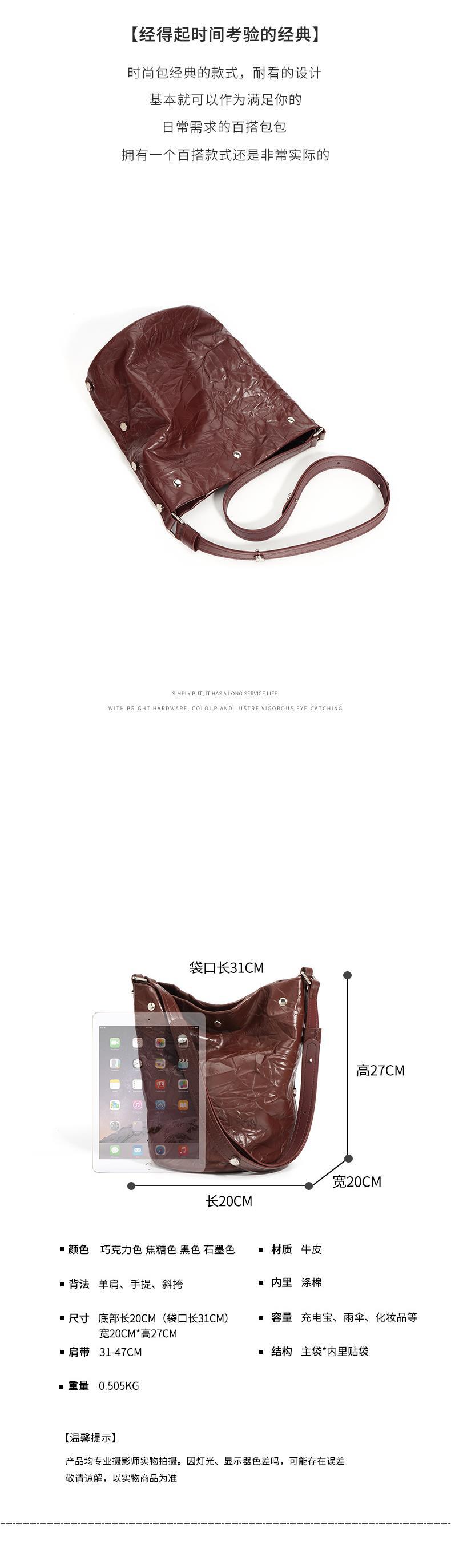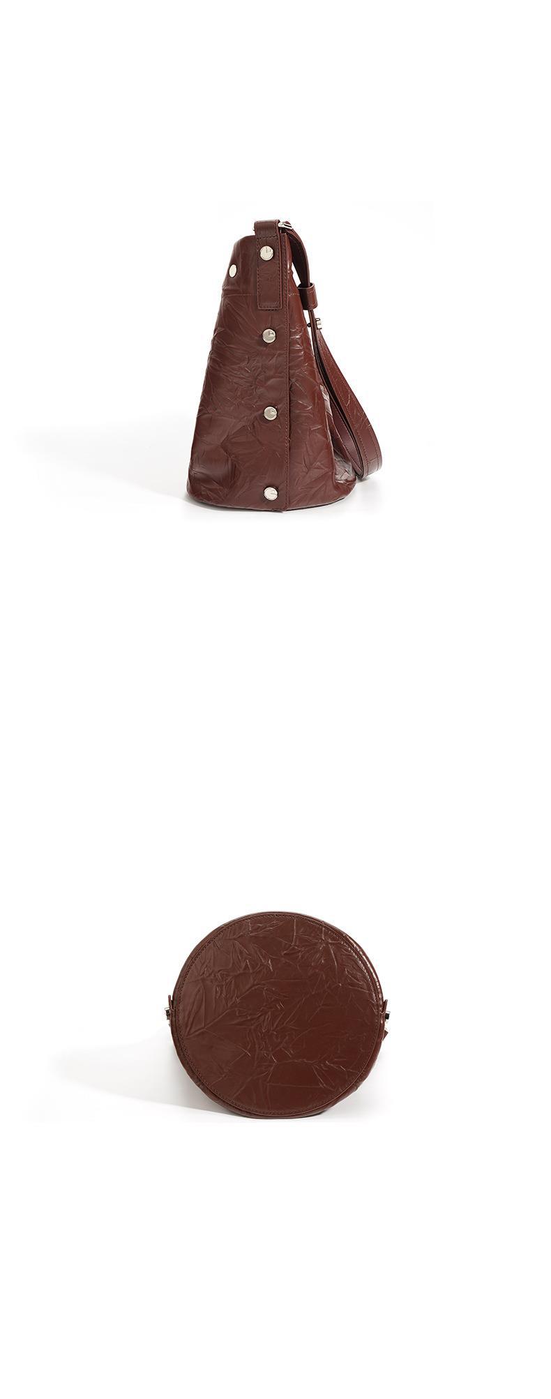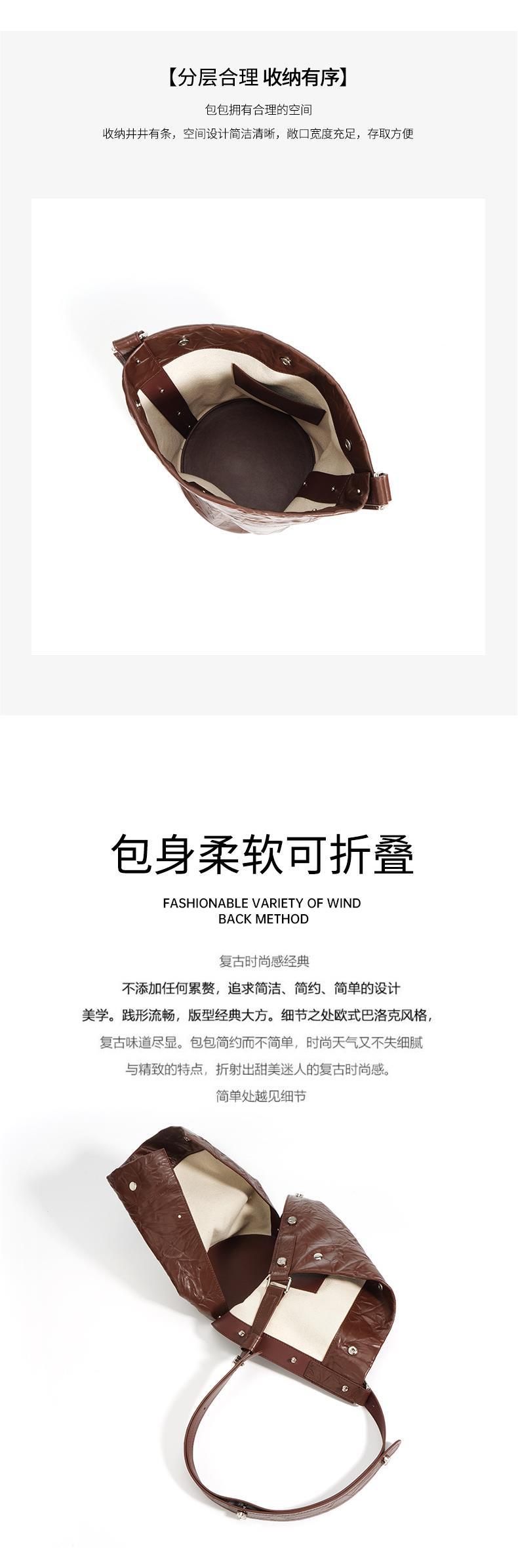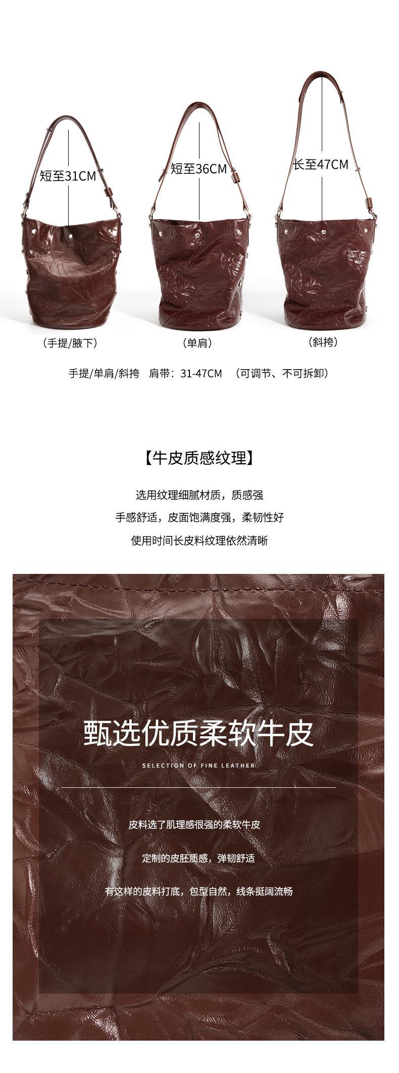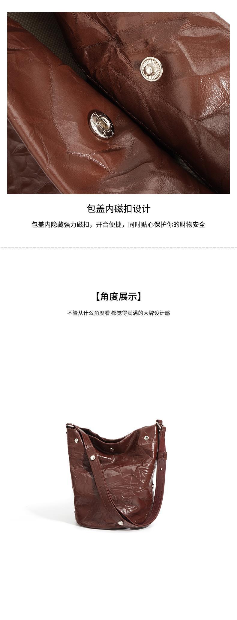 褶皱牛皮大容量水桶包通勤斜跨包单肩包潮流休闲复古真皮女包代发