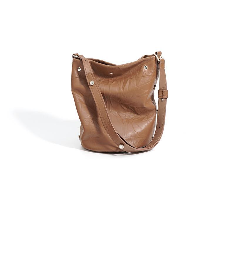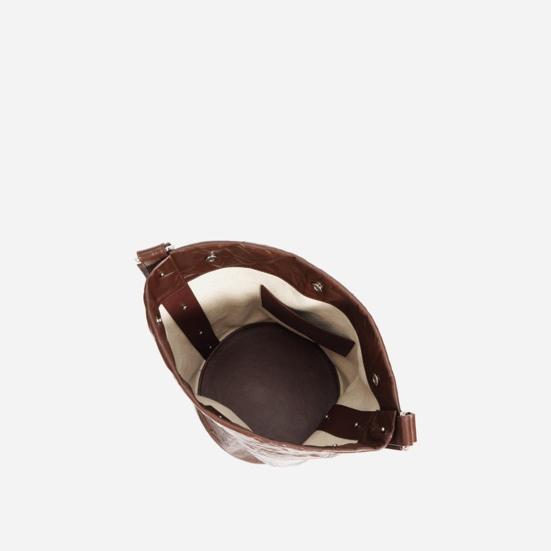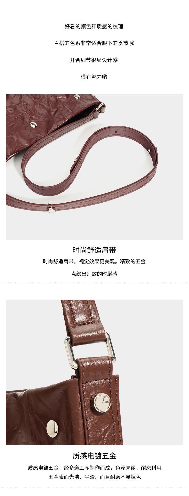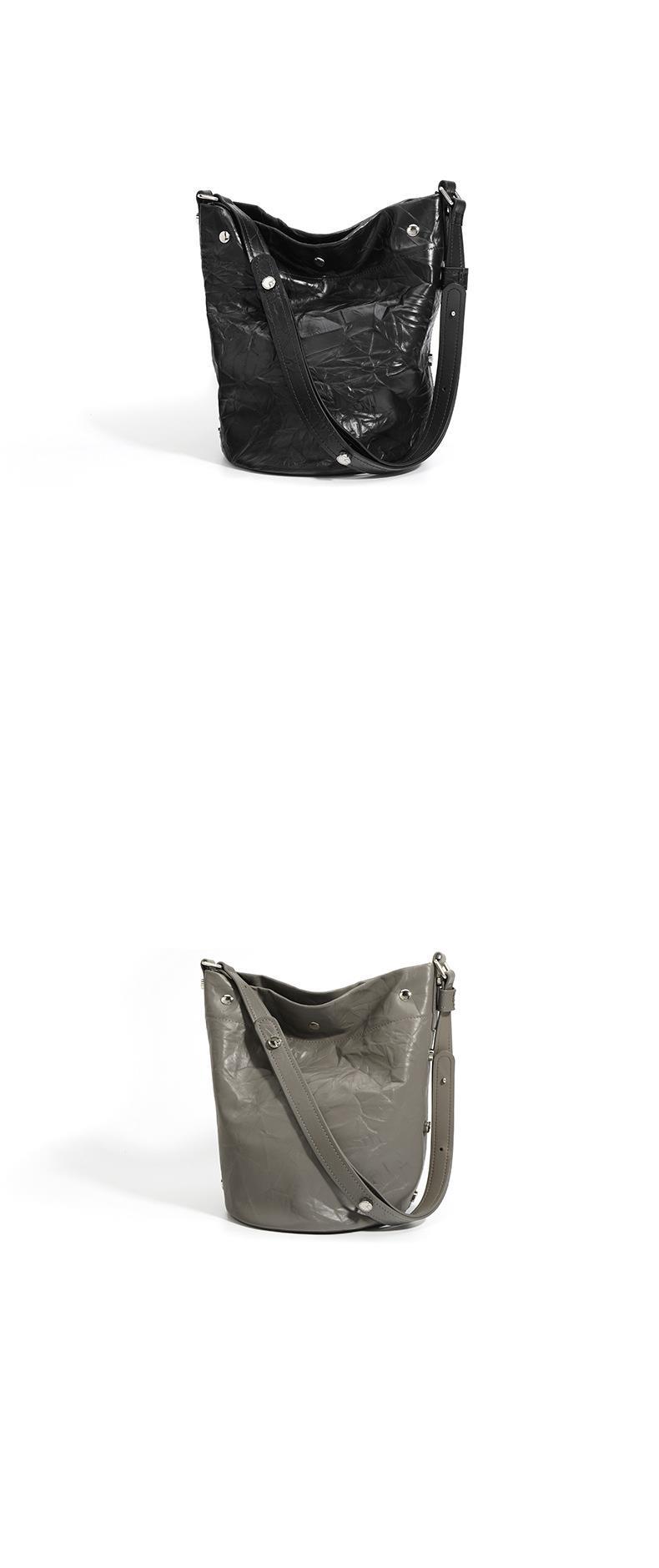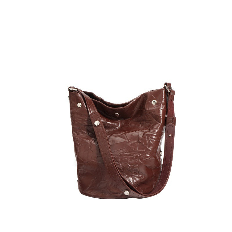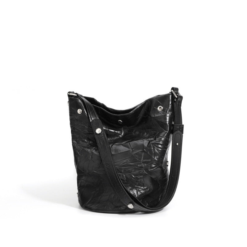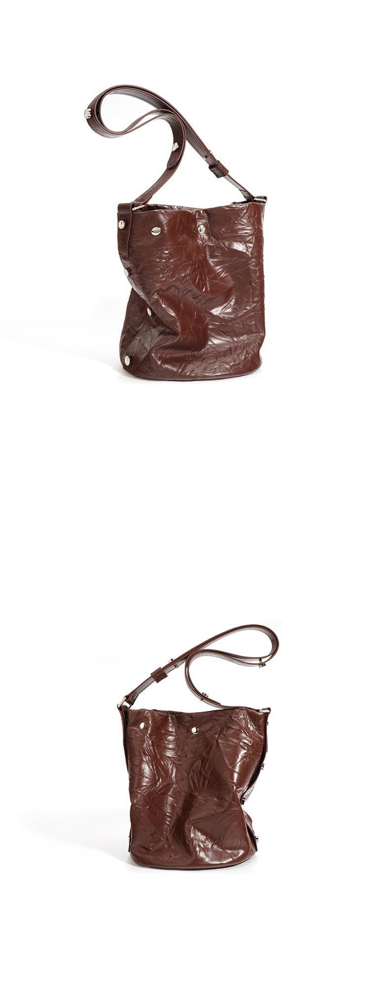 褶皱牛皮大容量水桶包通勤斜跨包单肩包潮流休闲复古真皮女包代发