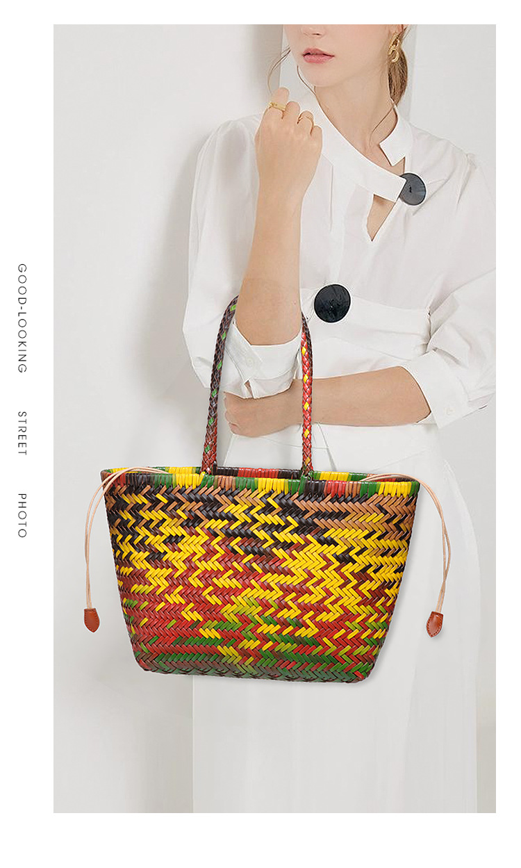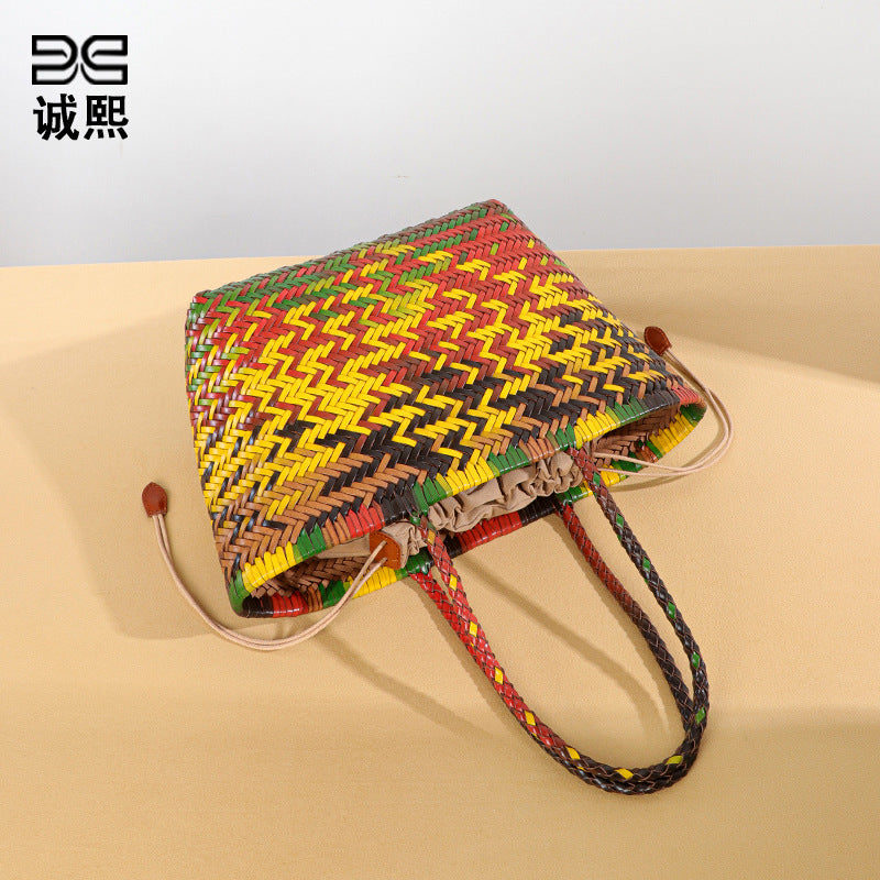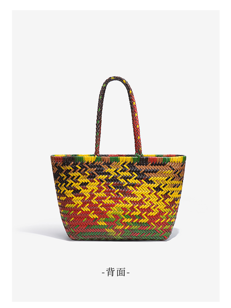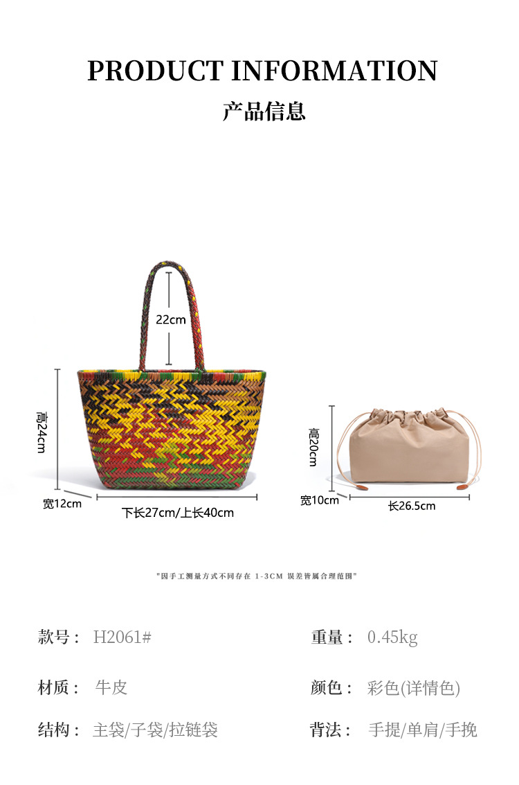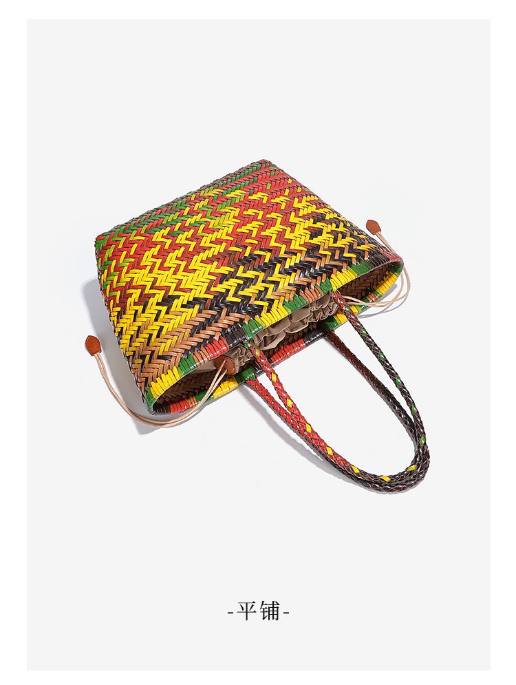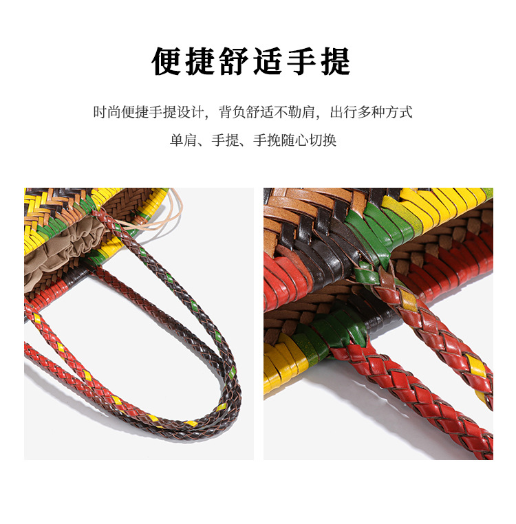 高端定制真皮菜篮子手提包彩色手工编织托特包森系潮流单肩腋下包