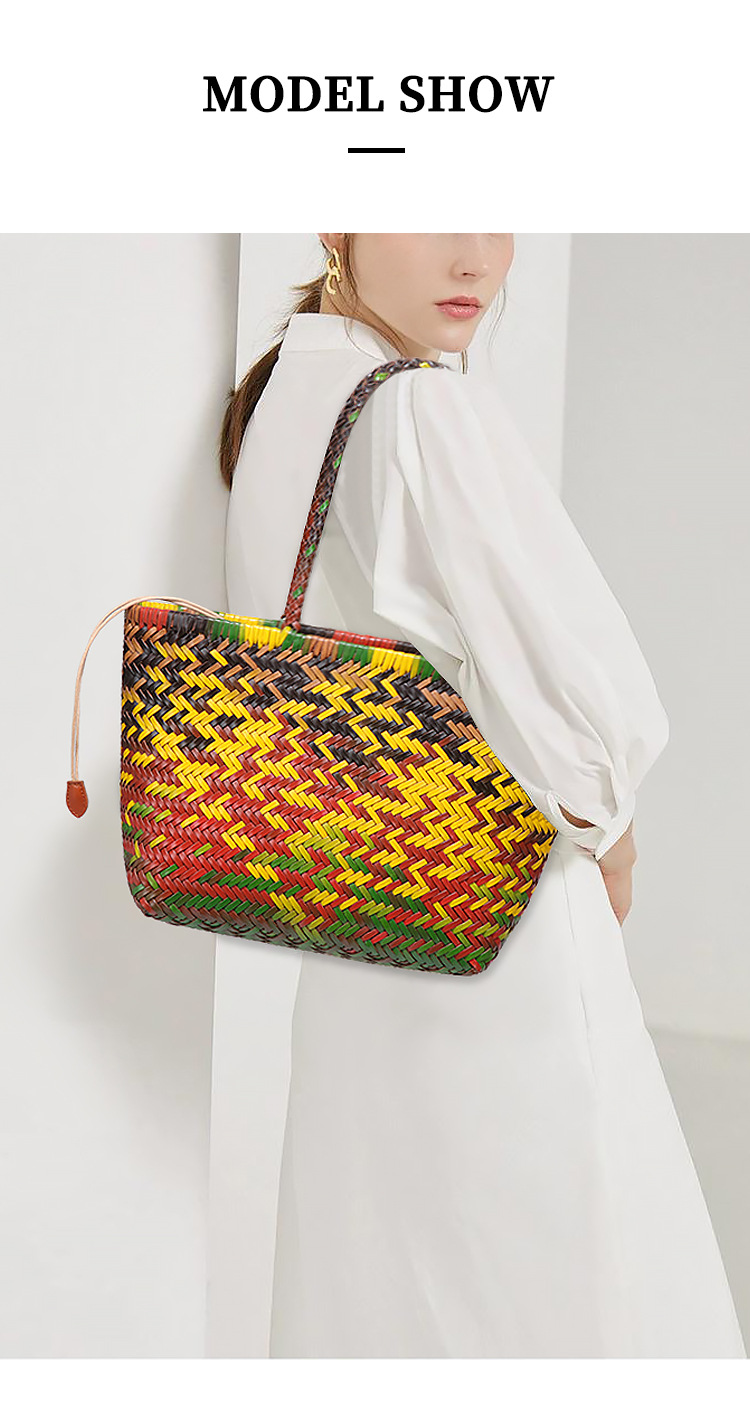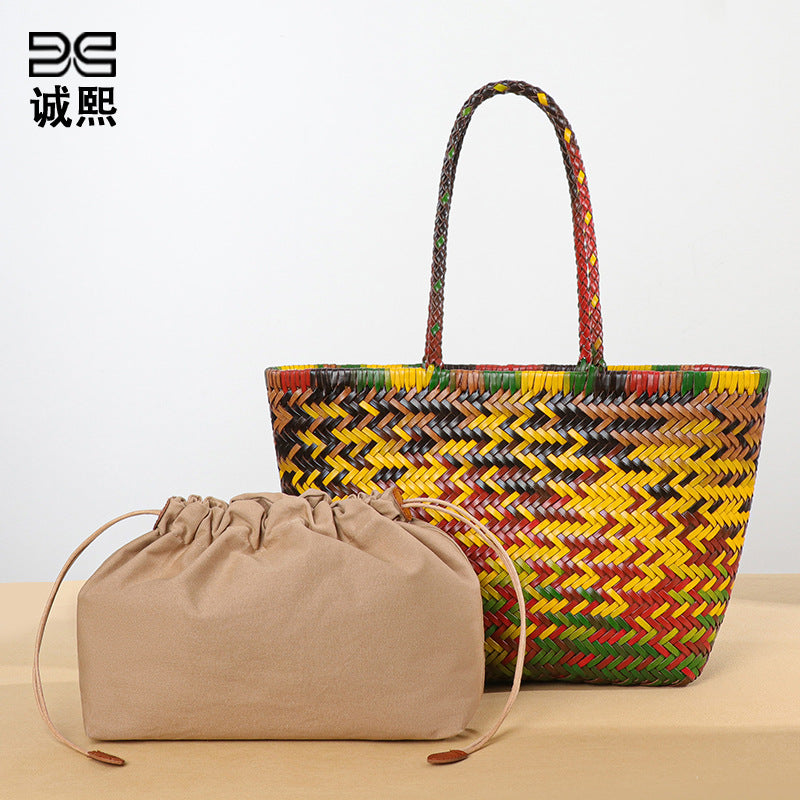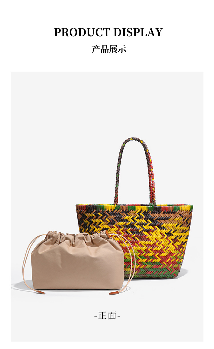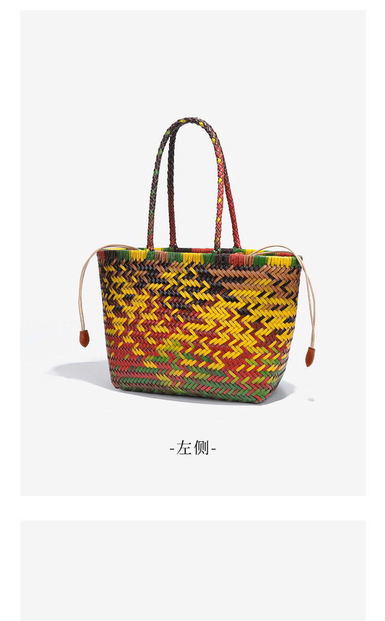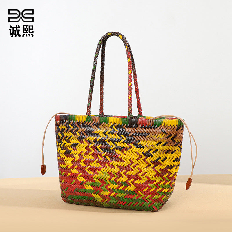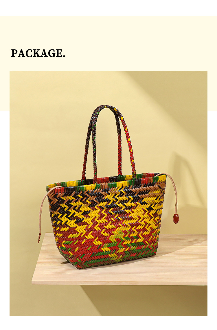 高端定制真皮菜篮子手提包彩色手工编织托特包森系潮流单肩腋下包