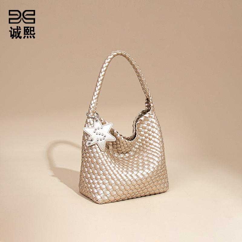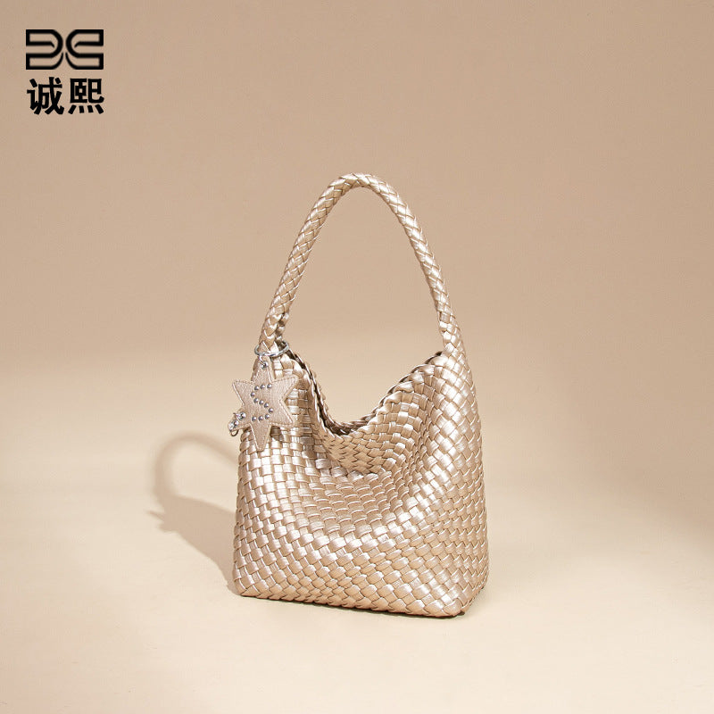 经典百搭枪枪小号手提女包休闲单肩腋下包时尚纯色手工编织子母包