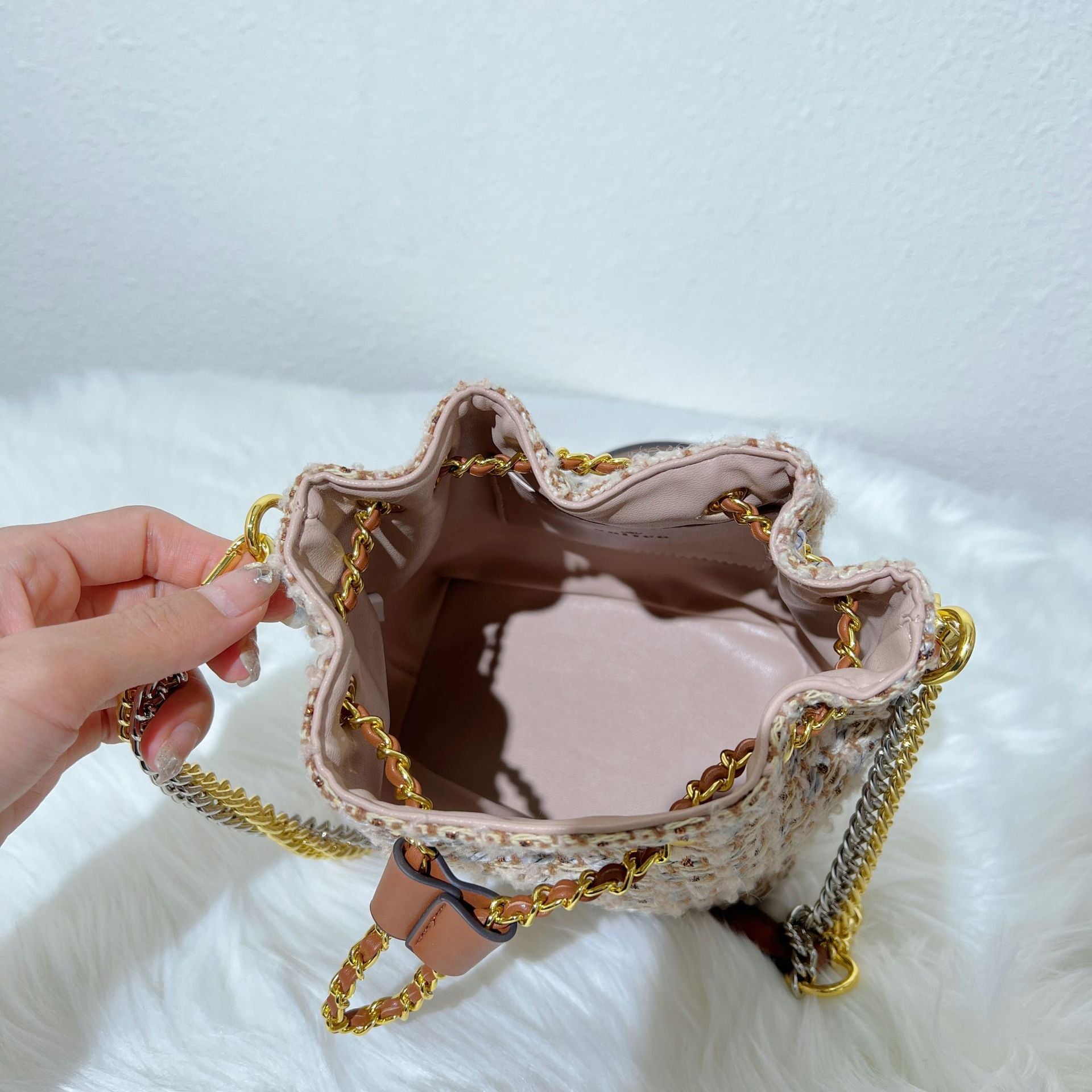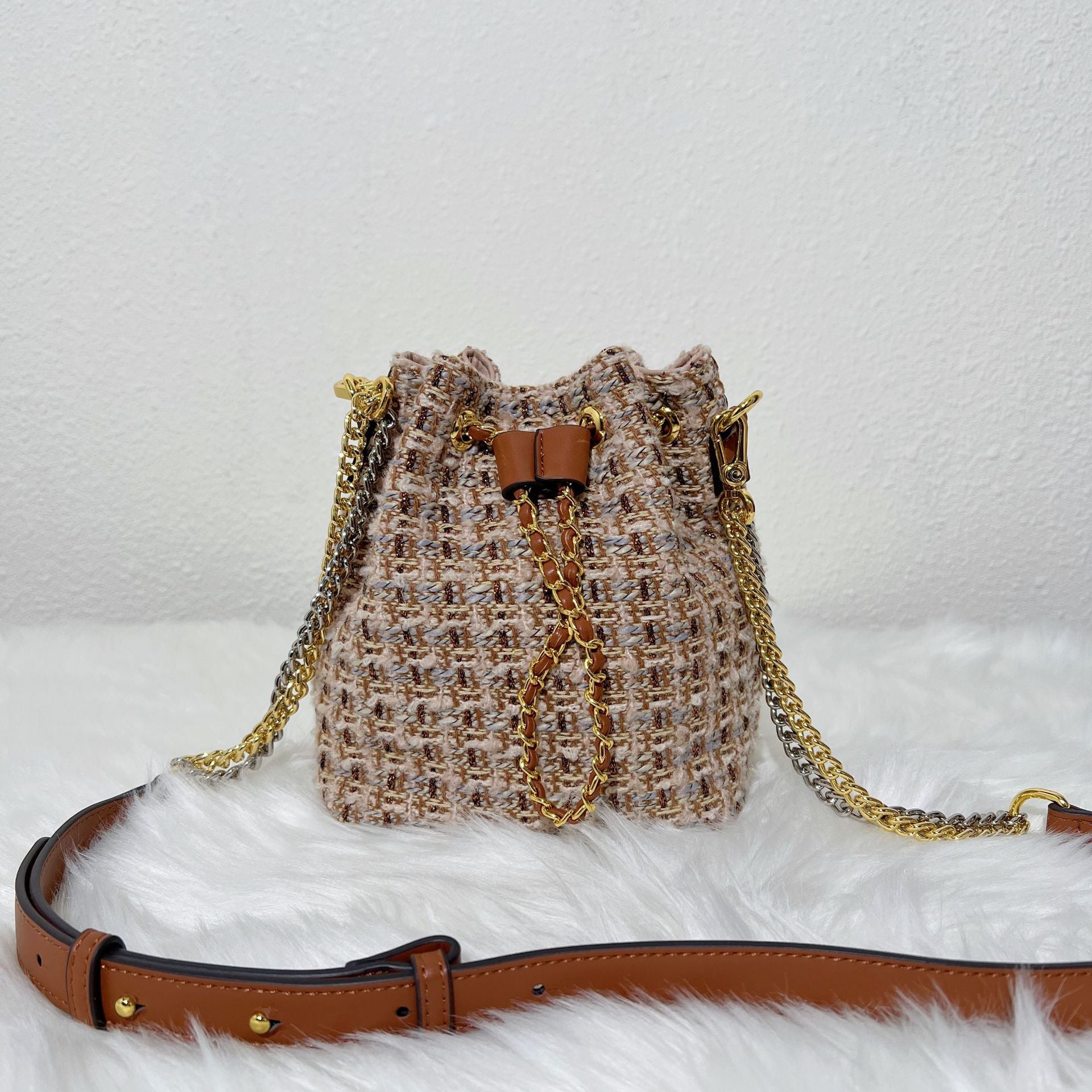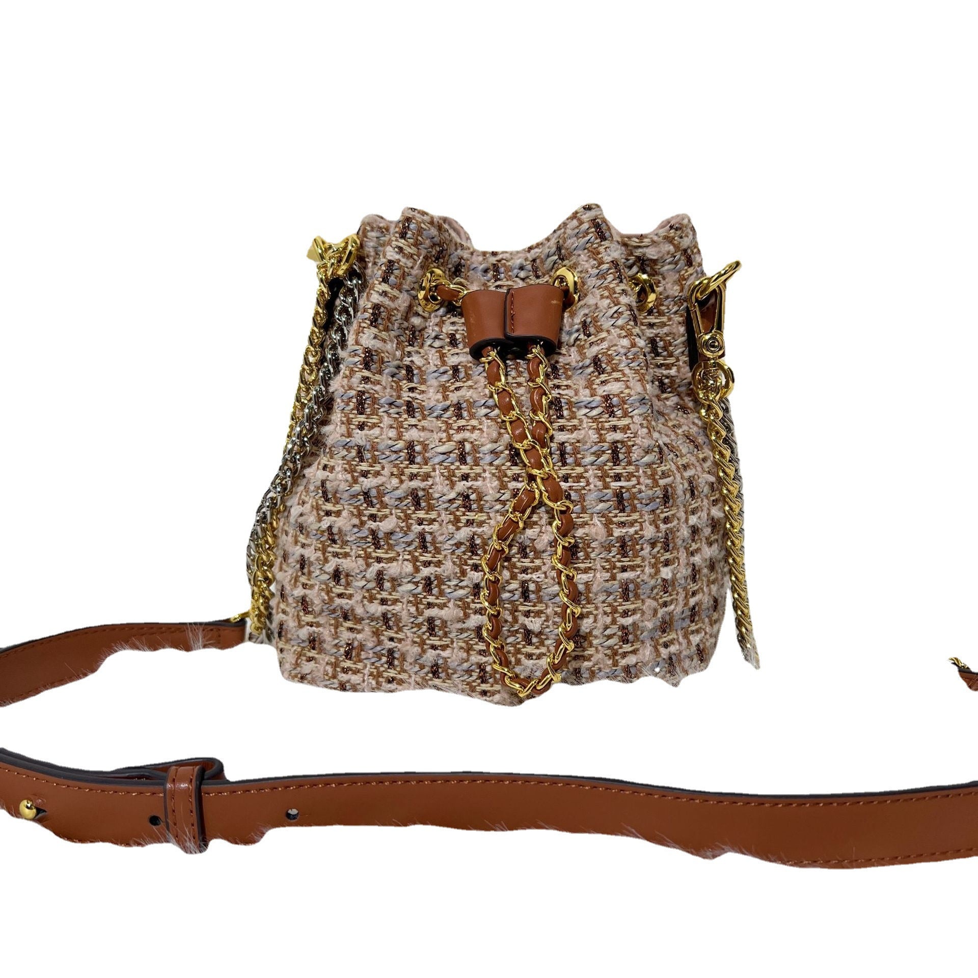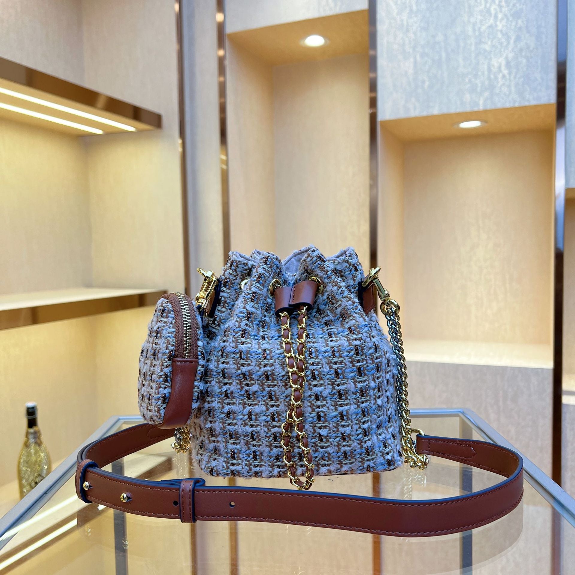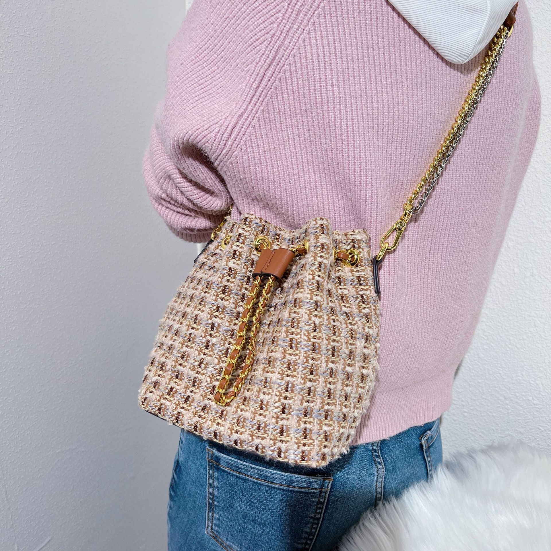 2024秋冬新品时尚复古呢子水桶包抽绳双色链条包单肩斜跨女包包潮