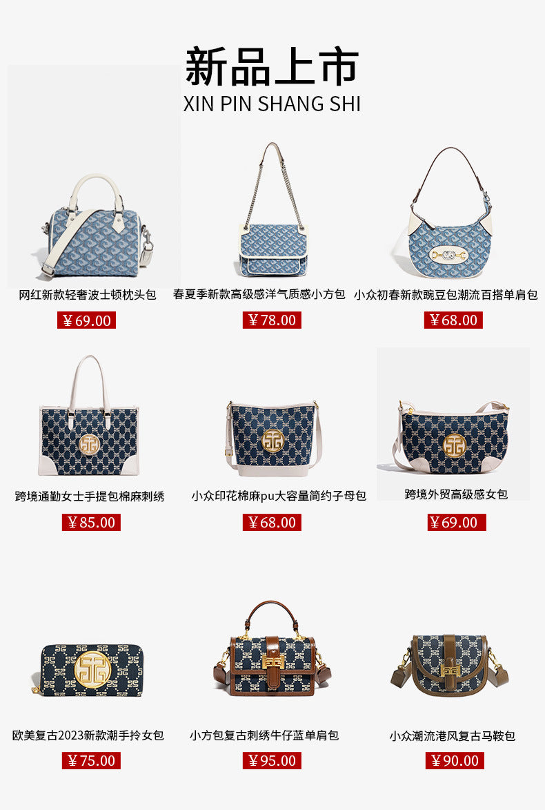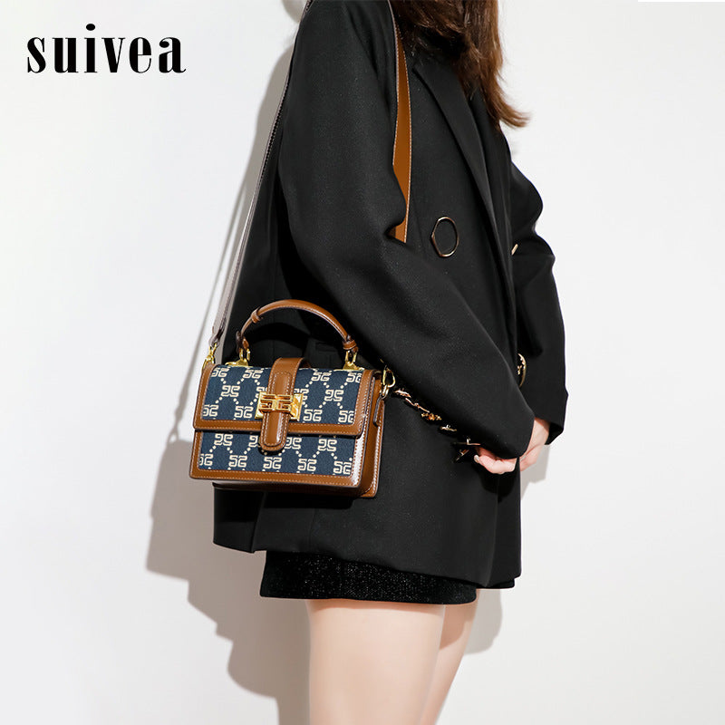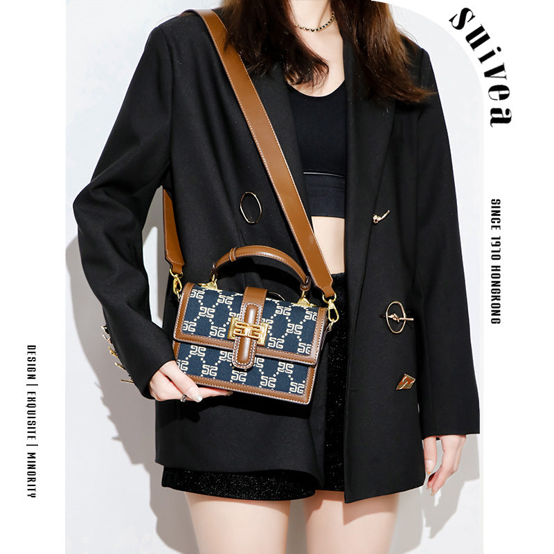 2025新款手提盒子小方包复古刺绣牛仔蓝单肩包通勤百搭斜挎女包包