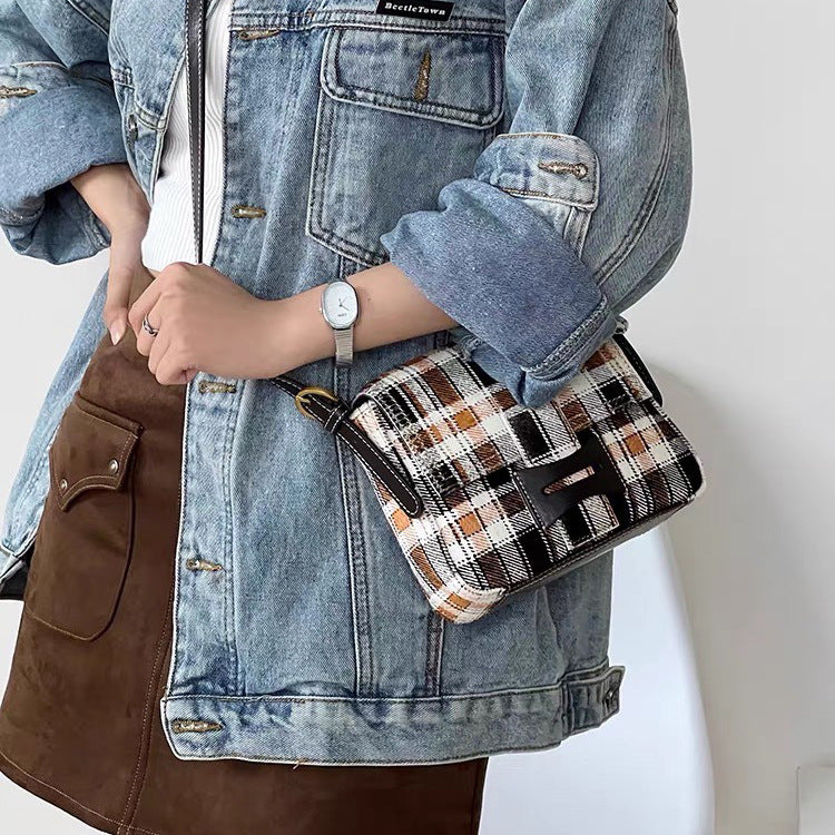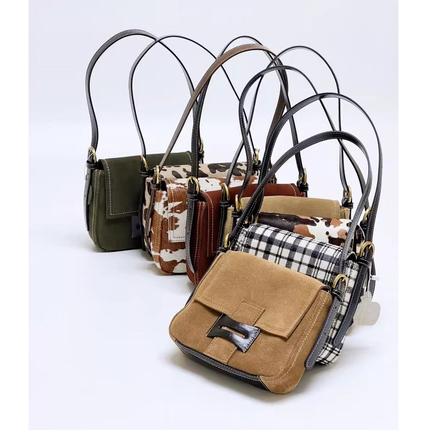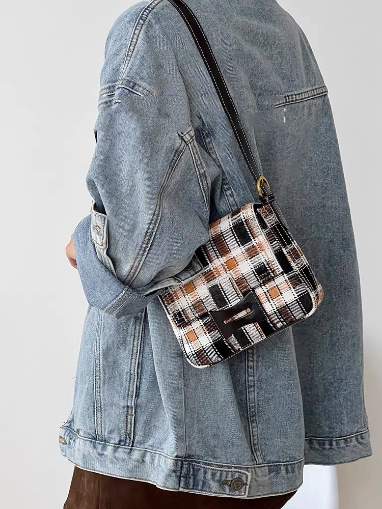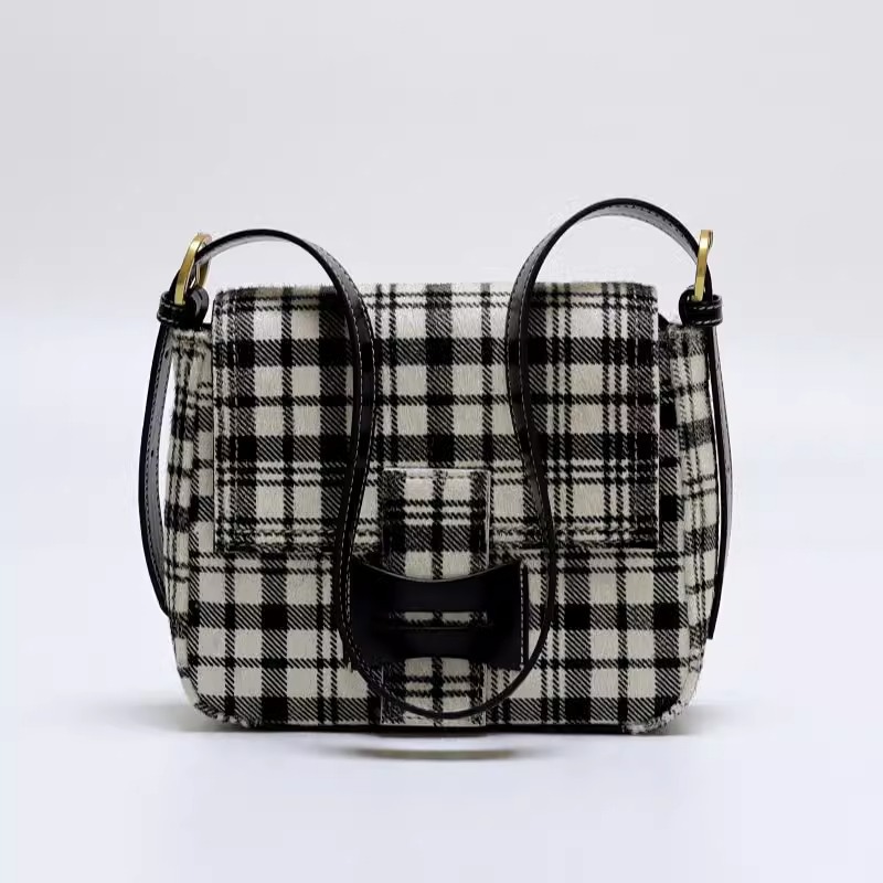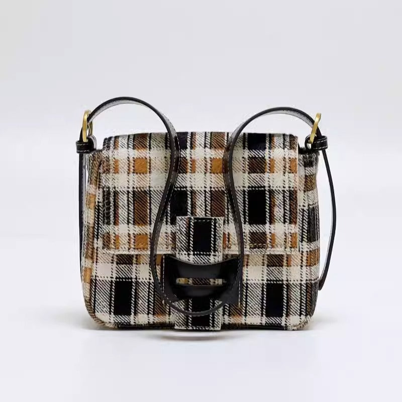Get格纹头层马毛拼油蜡牛皮时髦又飒飒单肩女磨砂皮复古邮差包包