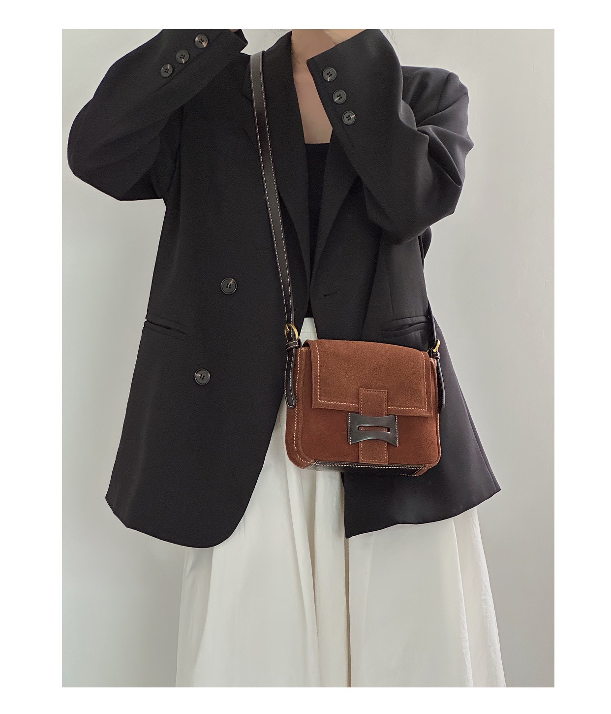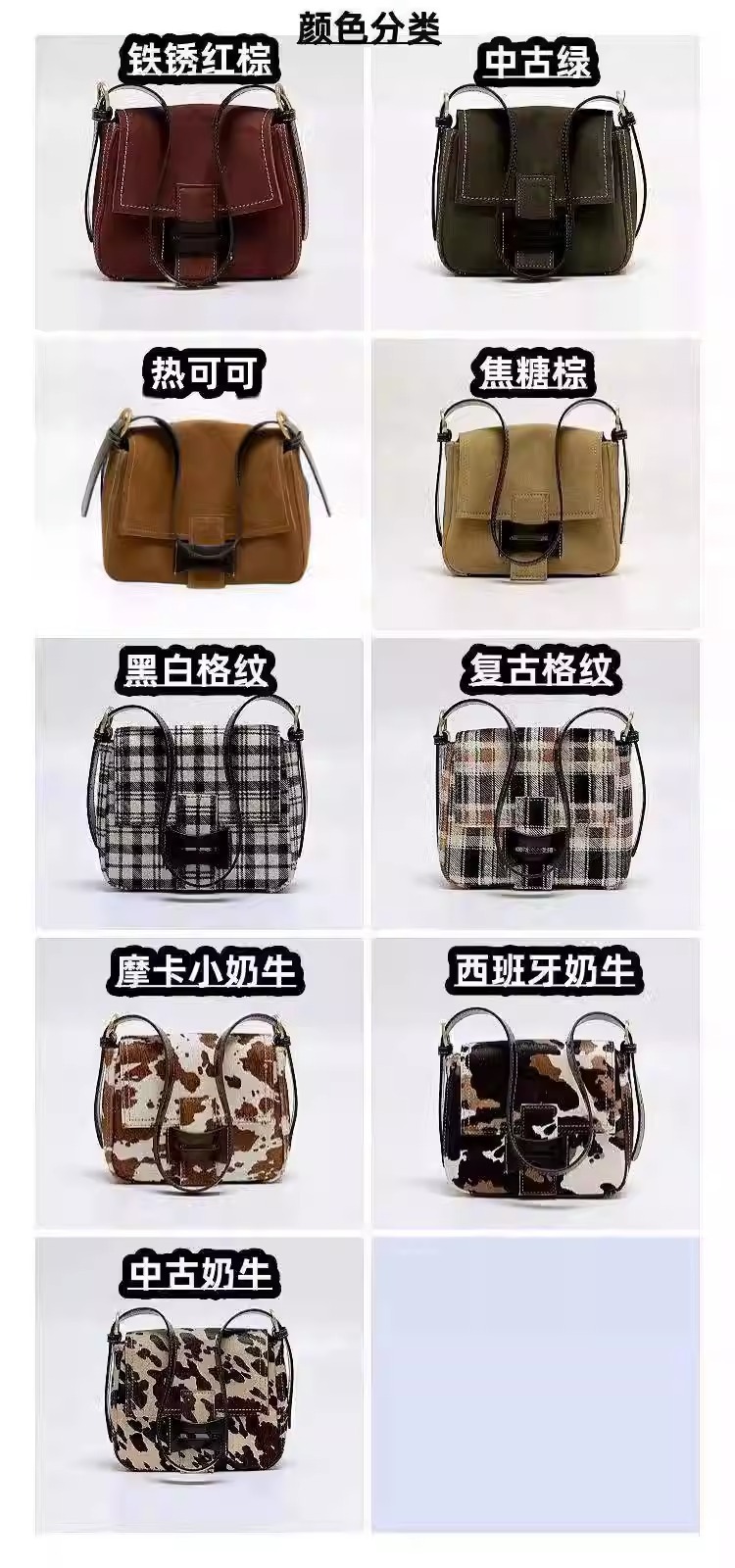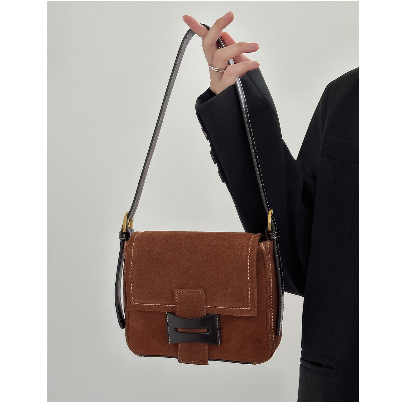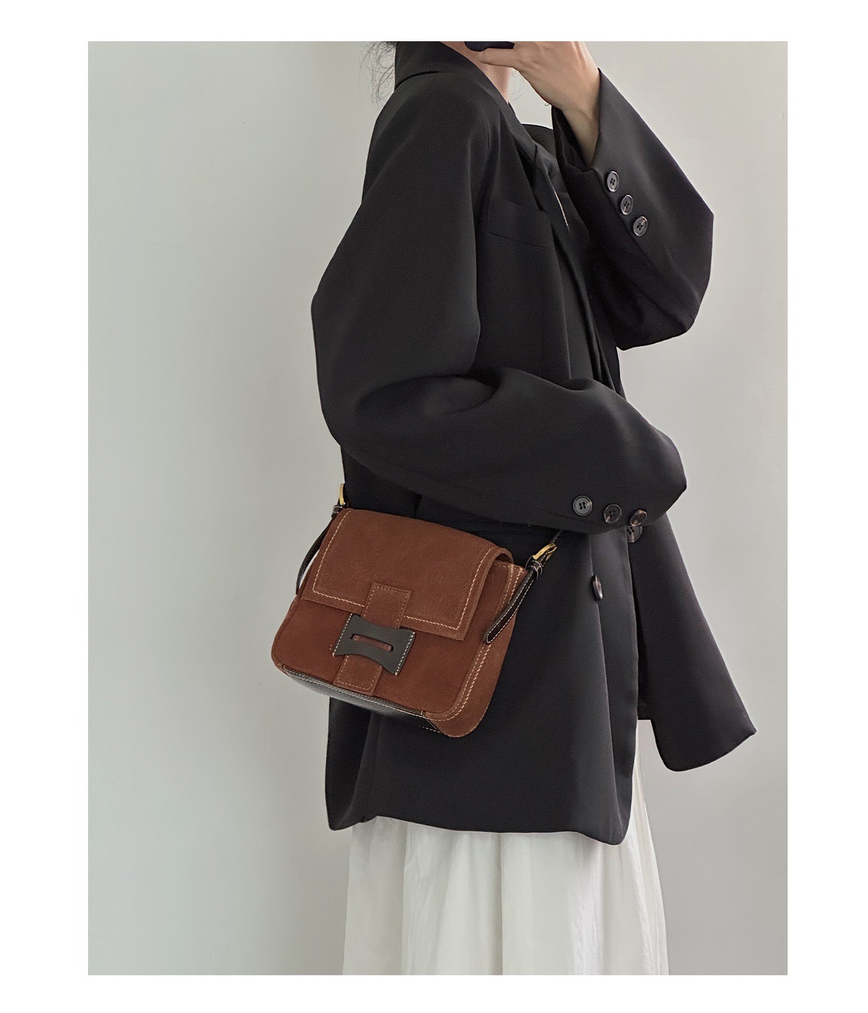 Get到一只爱不释手的小包 手感柔软的麂皮绒 后幅拼接油蜡牛皮防蹭 单肩斜挎背都毫无压力 复古氛围感拉满 秋冬bi备 先chic起来