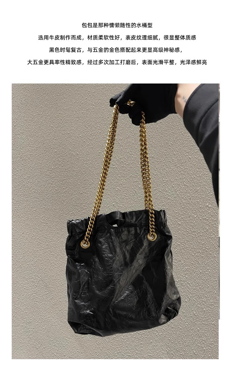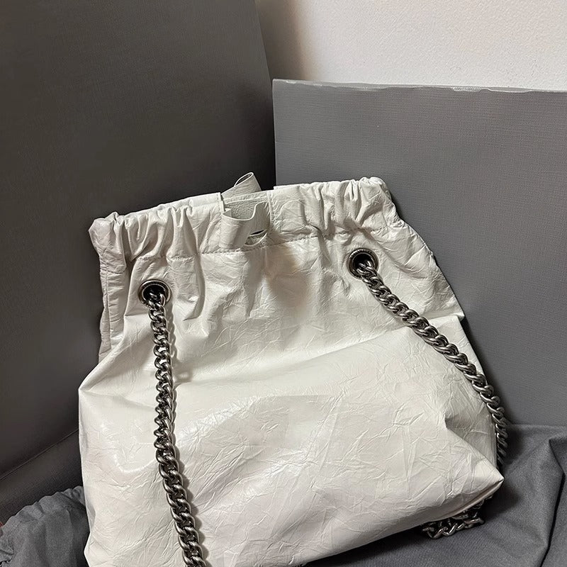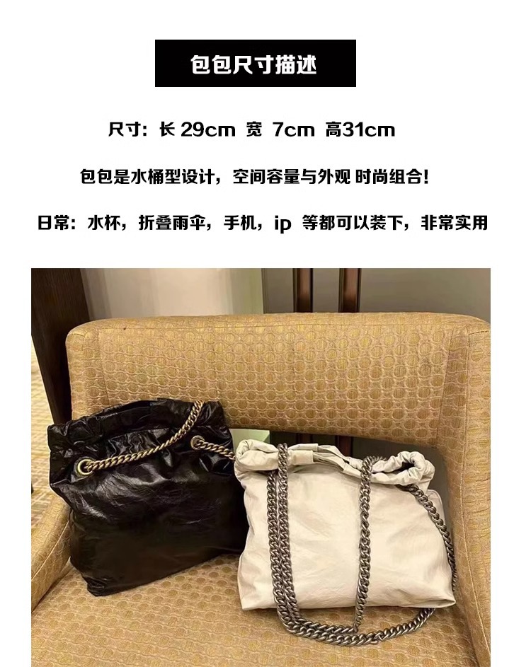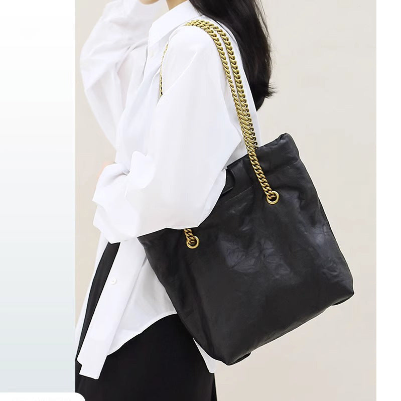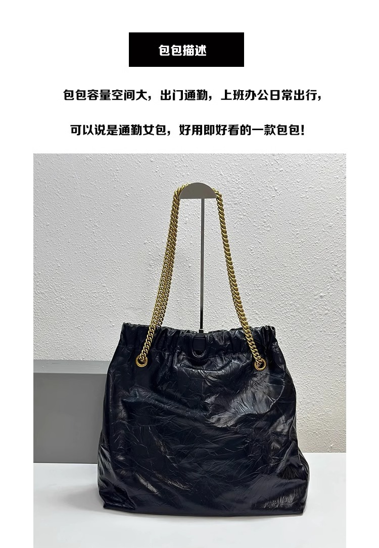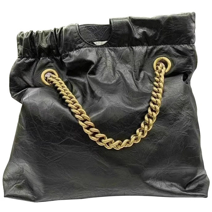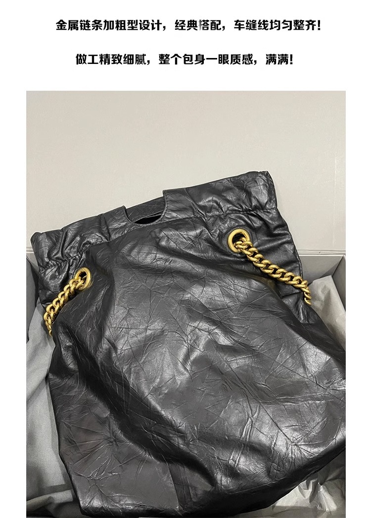 ins风慵懒随性手抓纹头层植鞣牛皮 链条单肩托特大包高质感垃圾袋