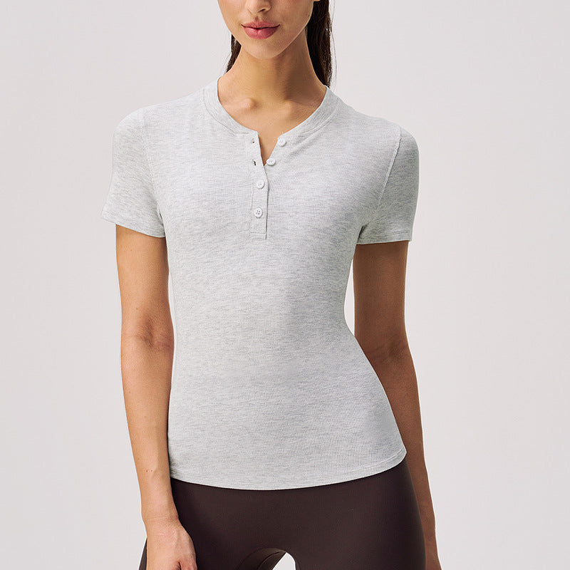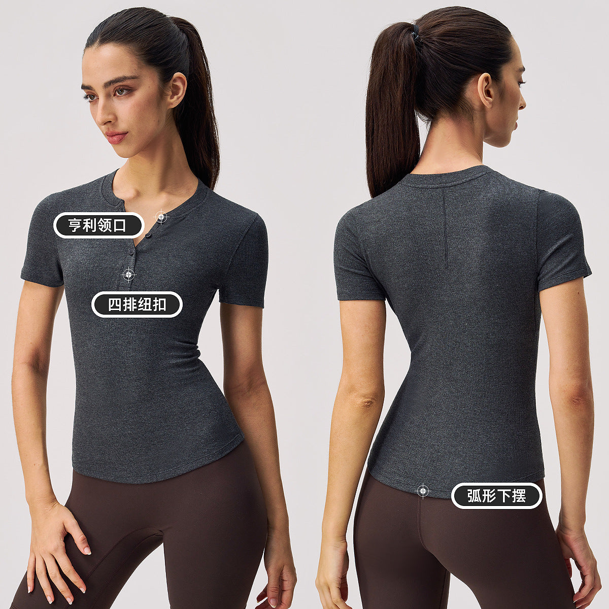 lulu亨利衫女半开领螺纹修身短袖显瘦运动上衣透气瑜伽服短款T恤