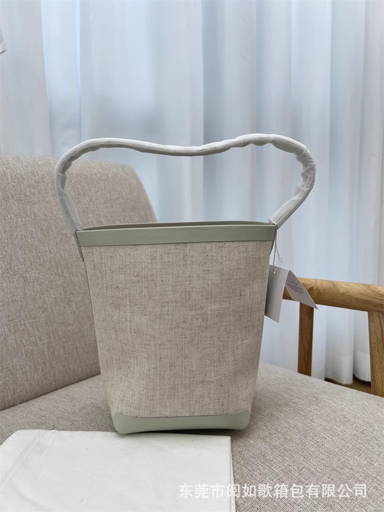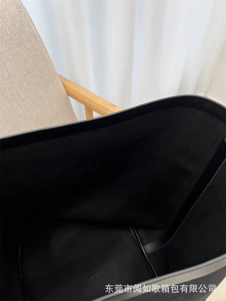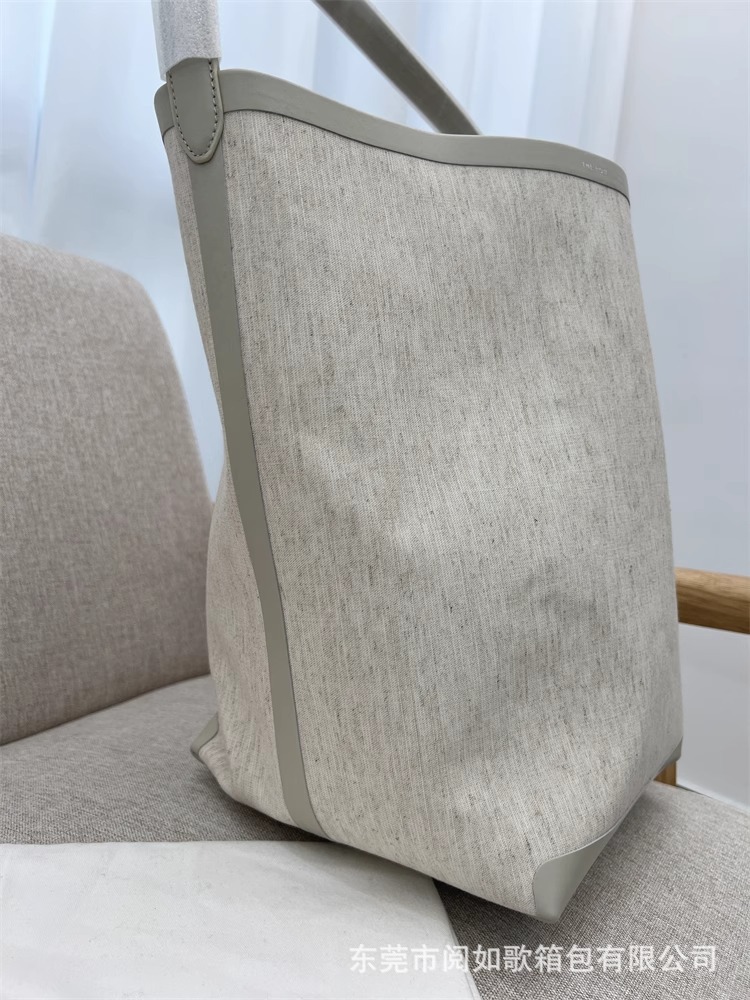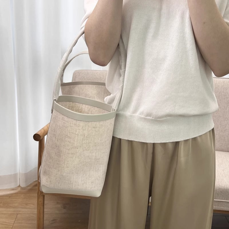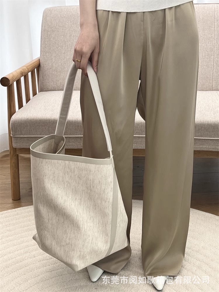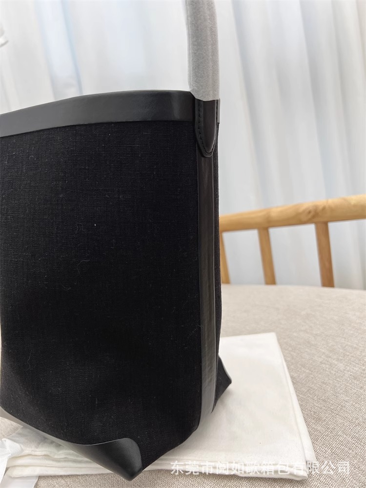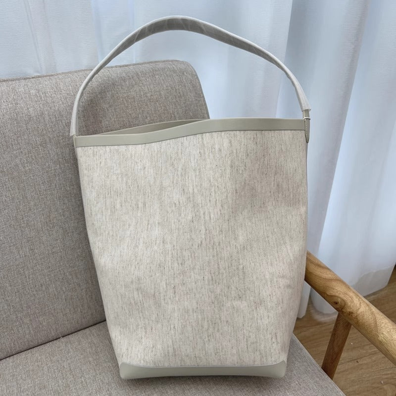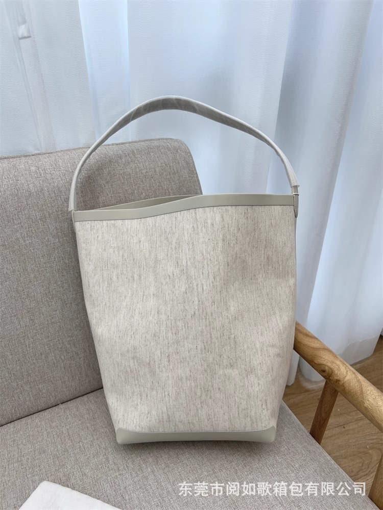 TR高定时尚休闲棉麻拼皮Tote水桶包简约大容量帆布包单肩托特包女